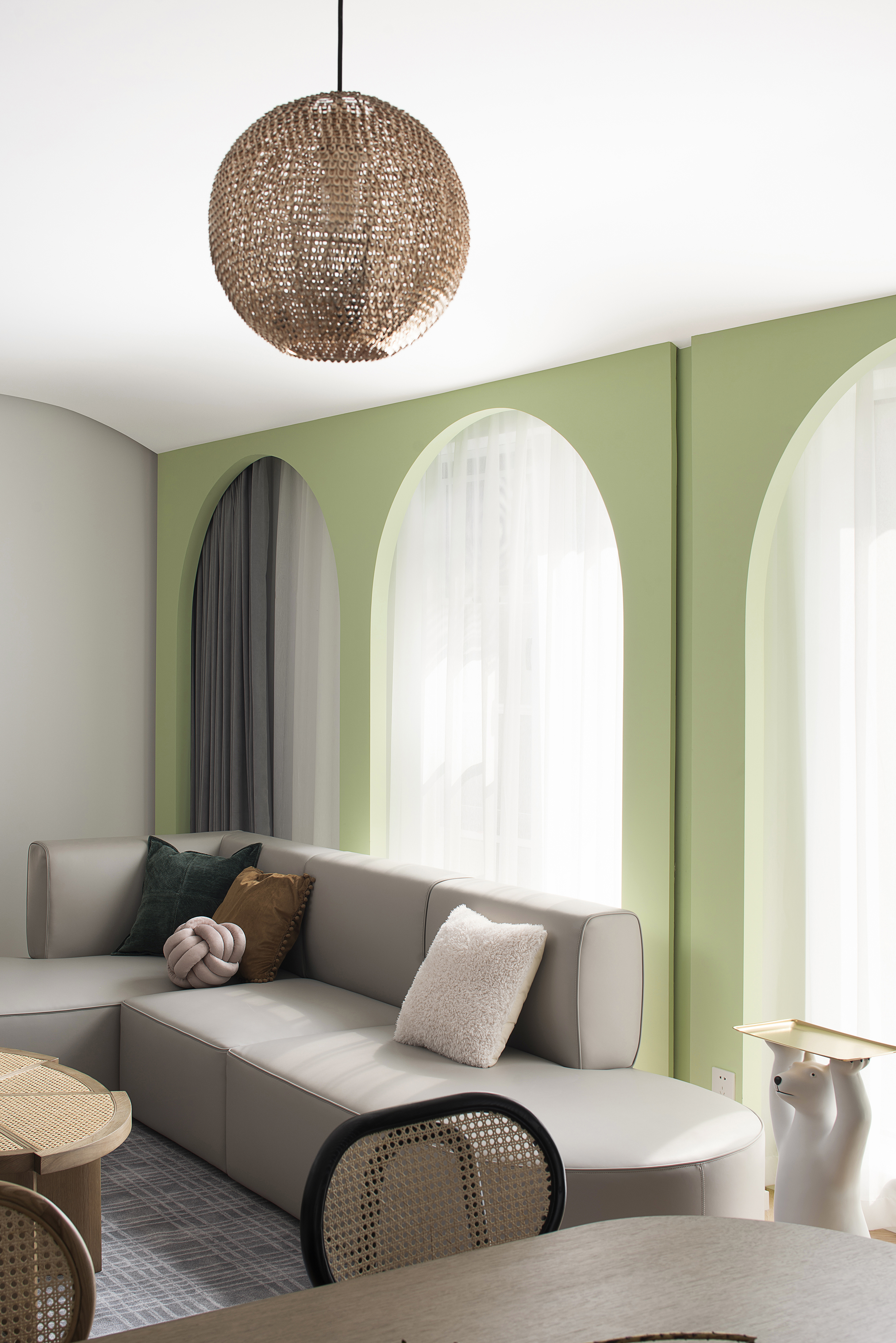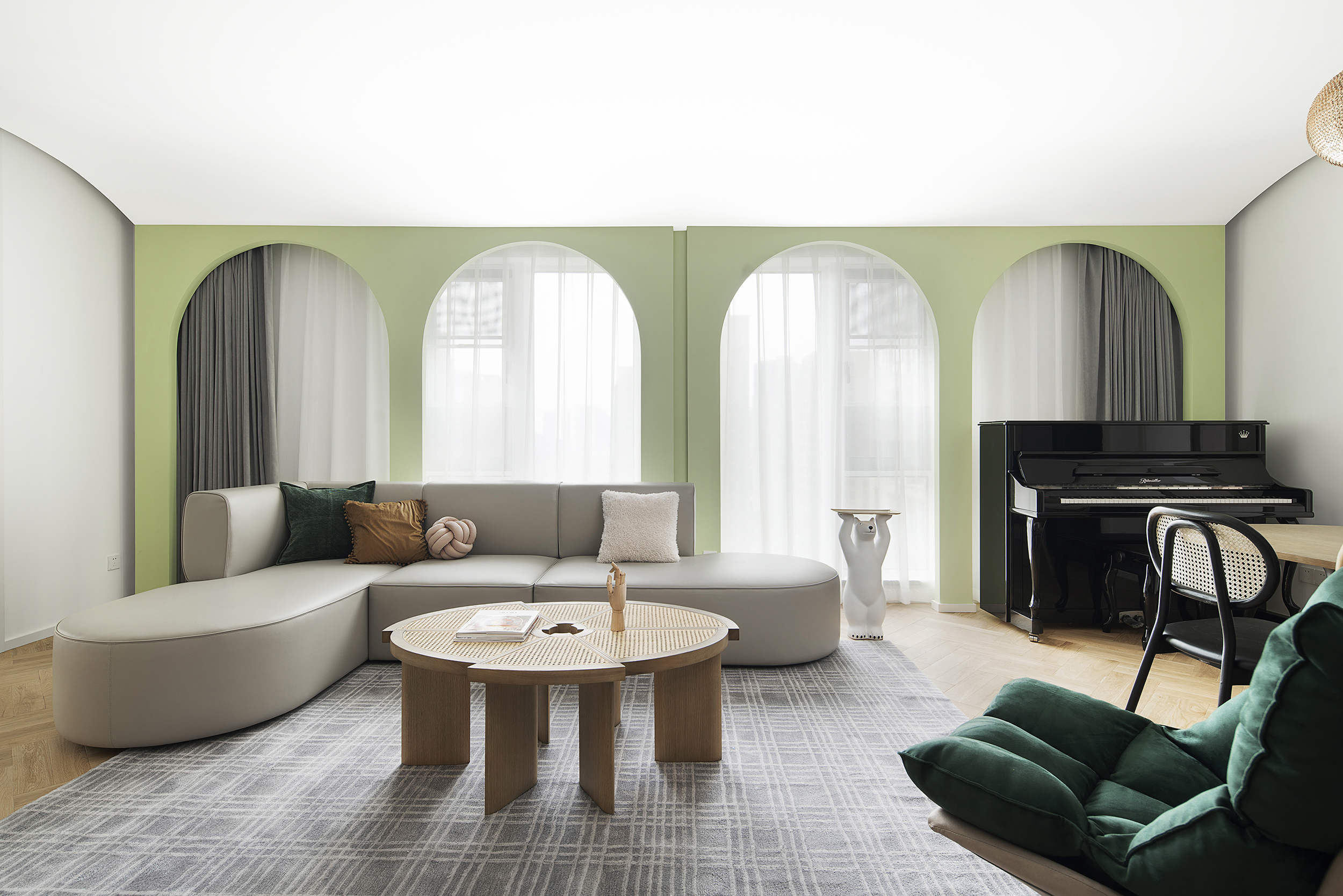 沙发背景为什么要做这个造型呢,一方面是元素的统一,从进门的顶到这里的弧度,有种层层叠进的感觉,另外就是因为这个背景比较重要,而现场的两扇窗户是不对称的,比较草率的在这个面上,看着会不舒服,所以我们做了拱形洞造型把不对称的一个面变成了我们希望营造的一个带艺术气息的面。