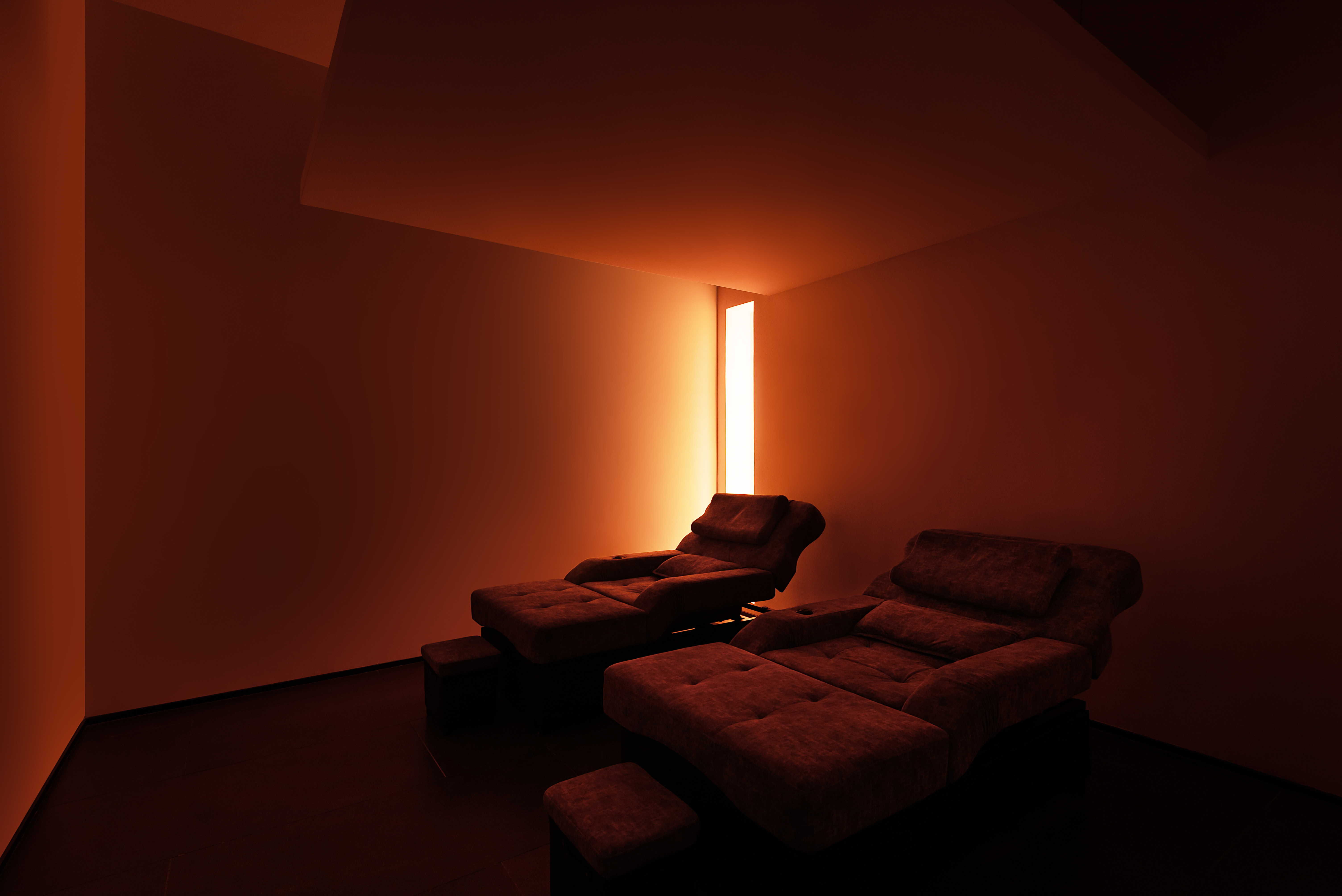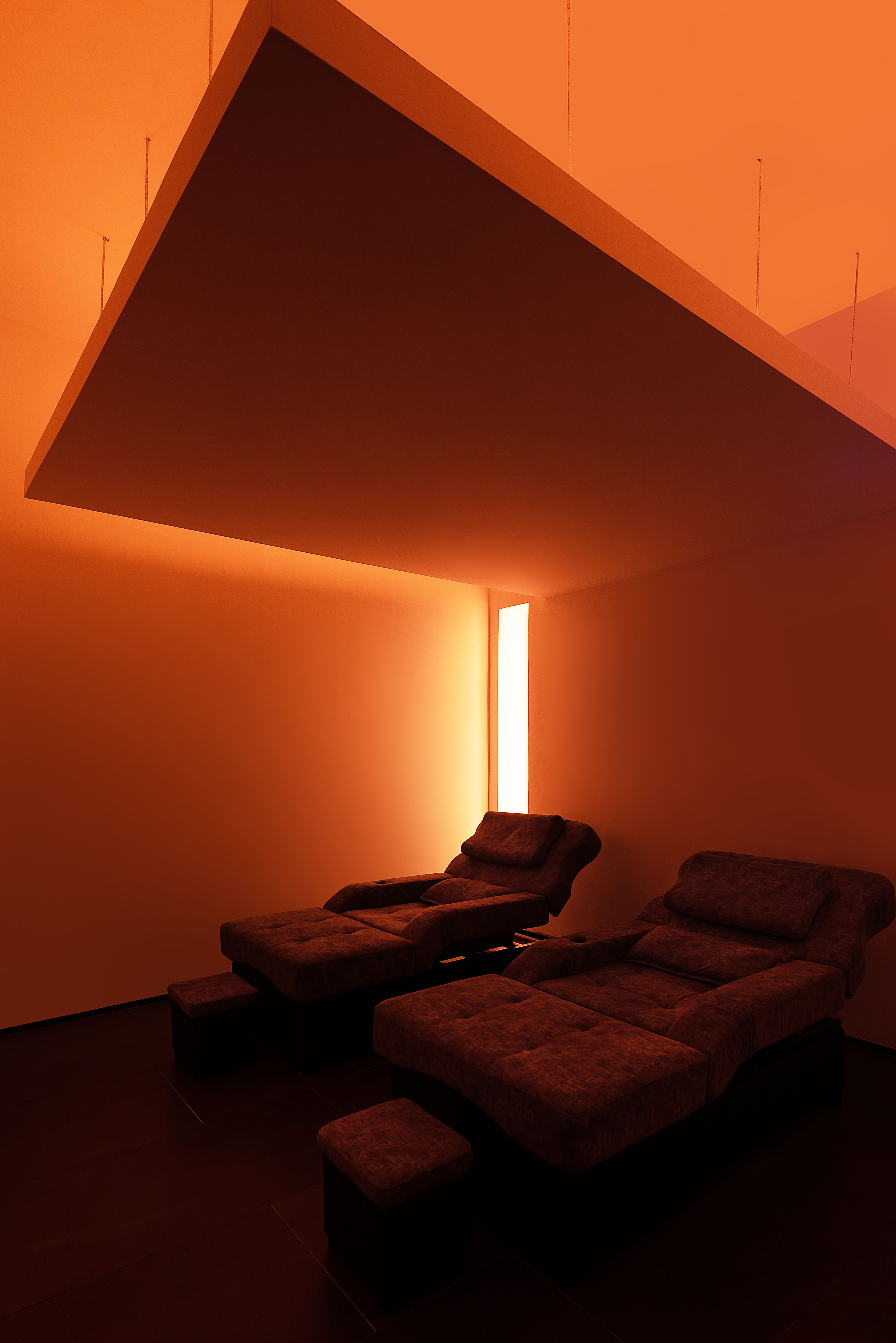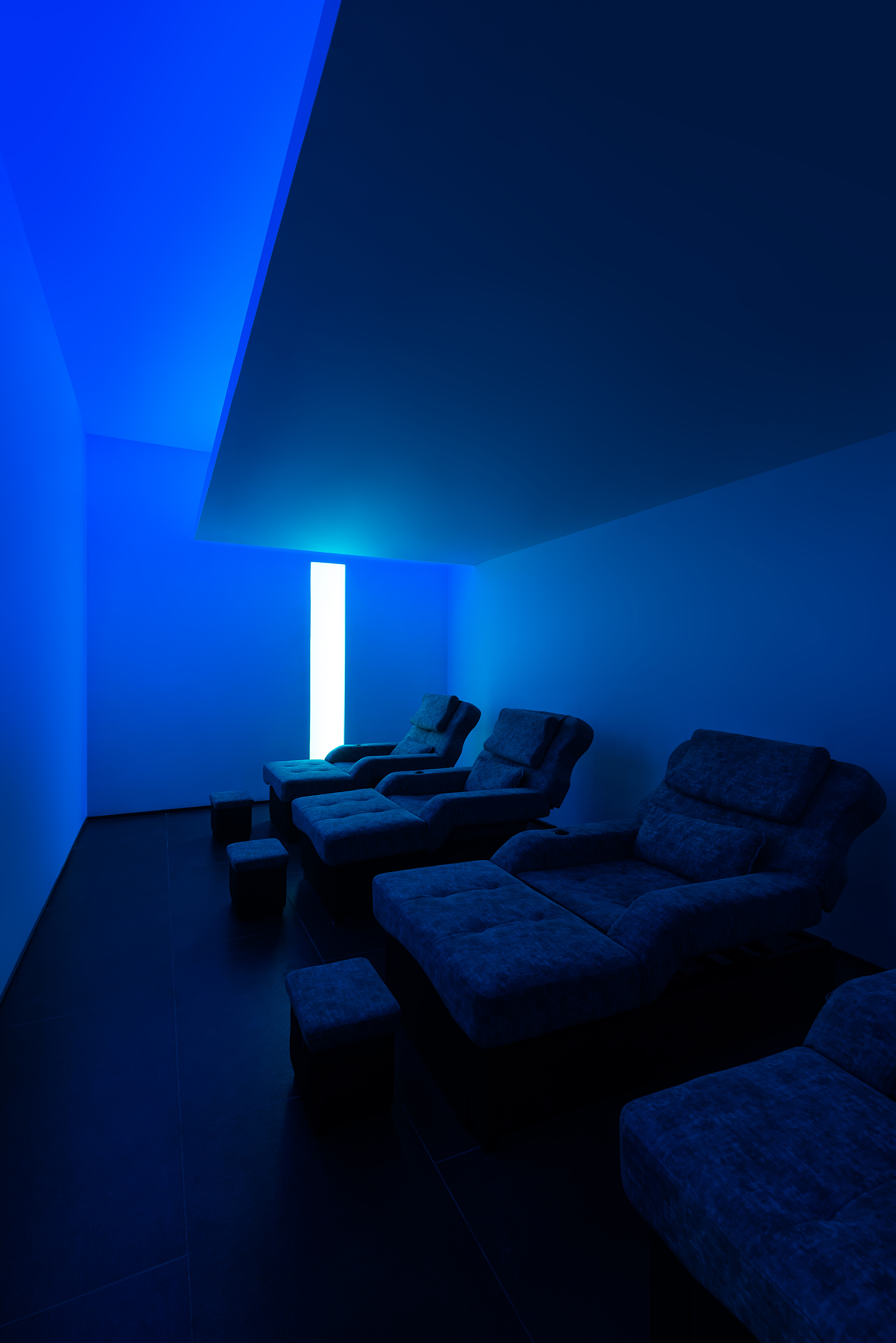 - 按摩室 对于有限的面积,设计师运用均匀且干净的灯光包裹整个空间,模糊墙体边界,从视觉上开阔空间,去除紧凑空间的压迫感,并让人不自觉得沉静下来。此外,房内所有灯光均为2700K-7000K可调节智能灯光,可随天气变化调节相应光感及色温。
