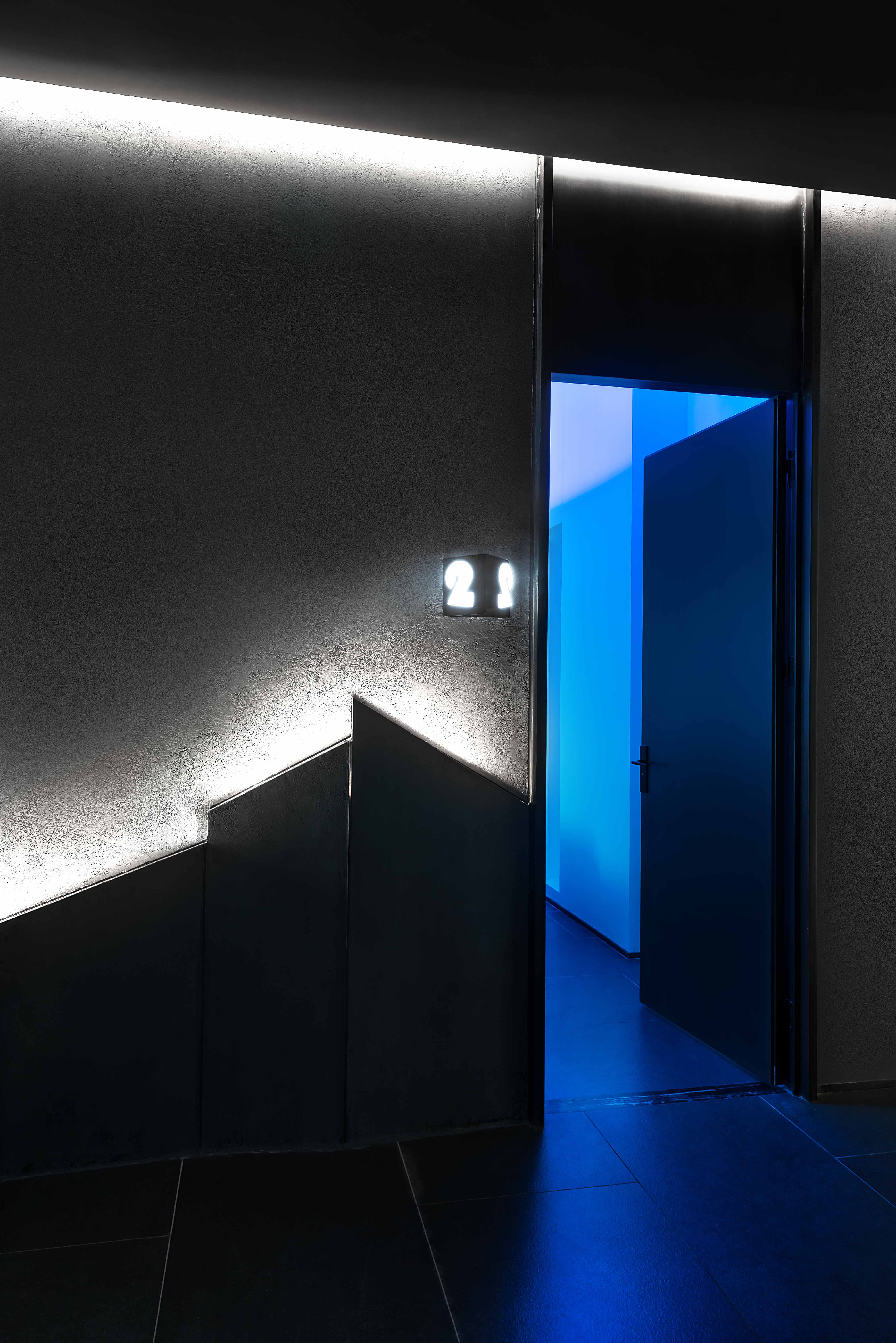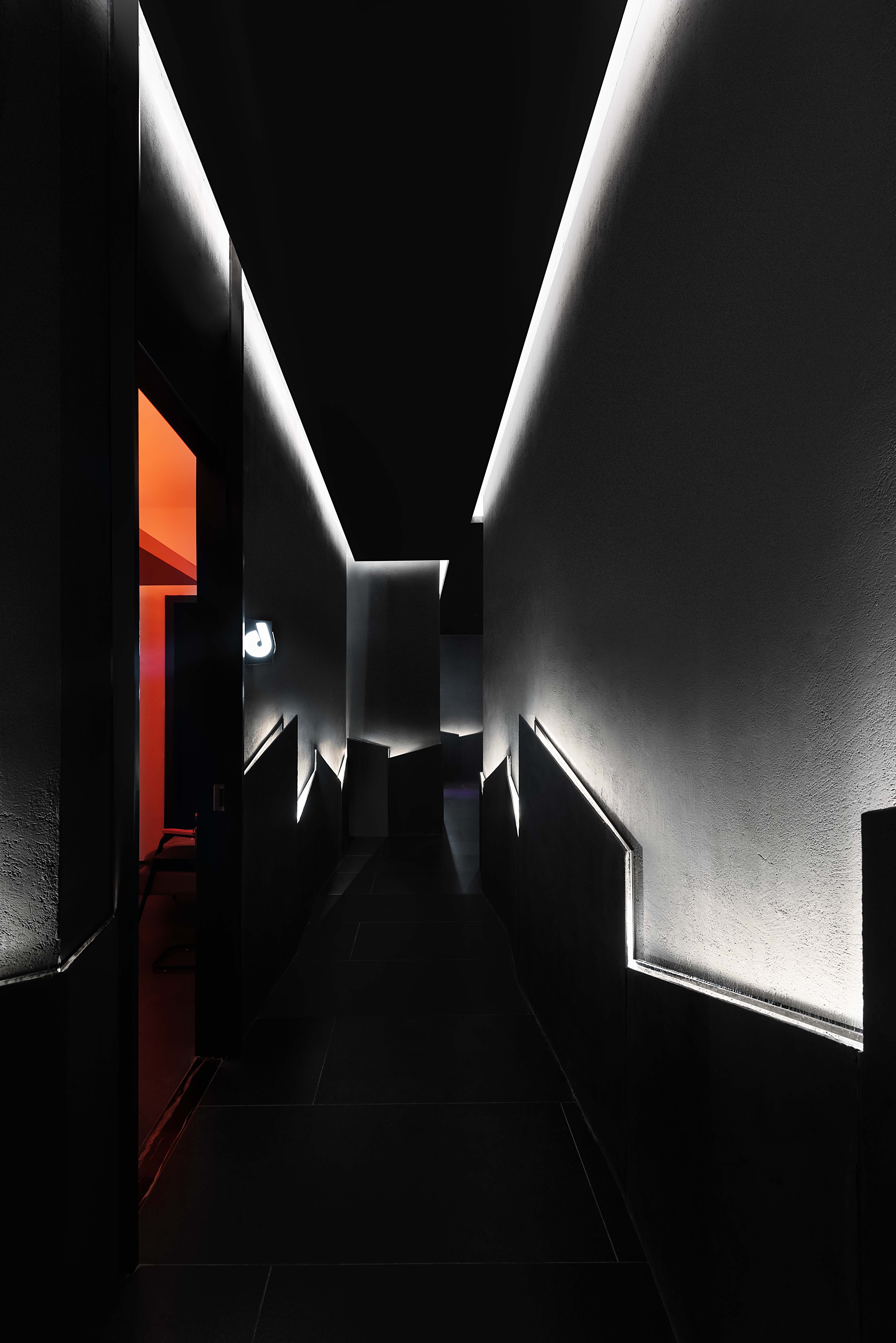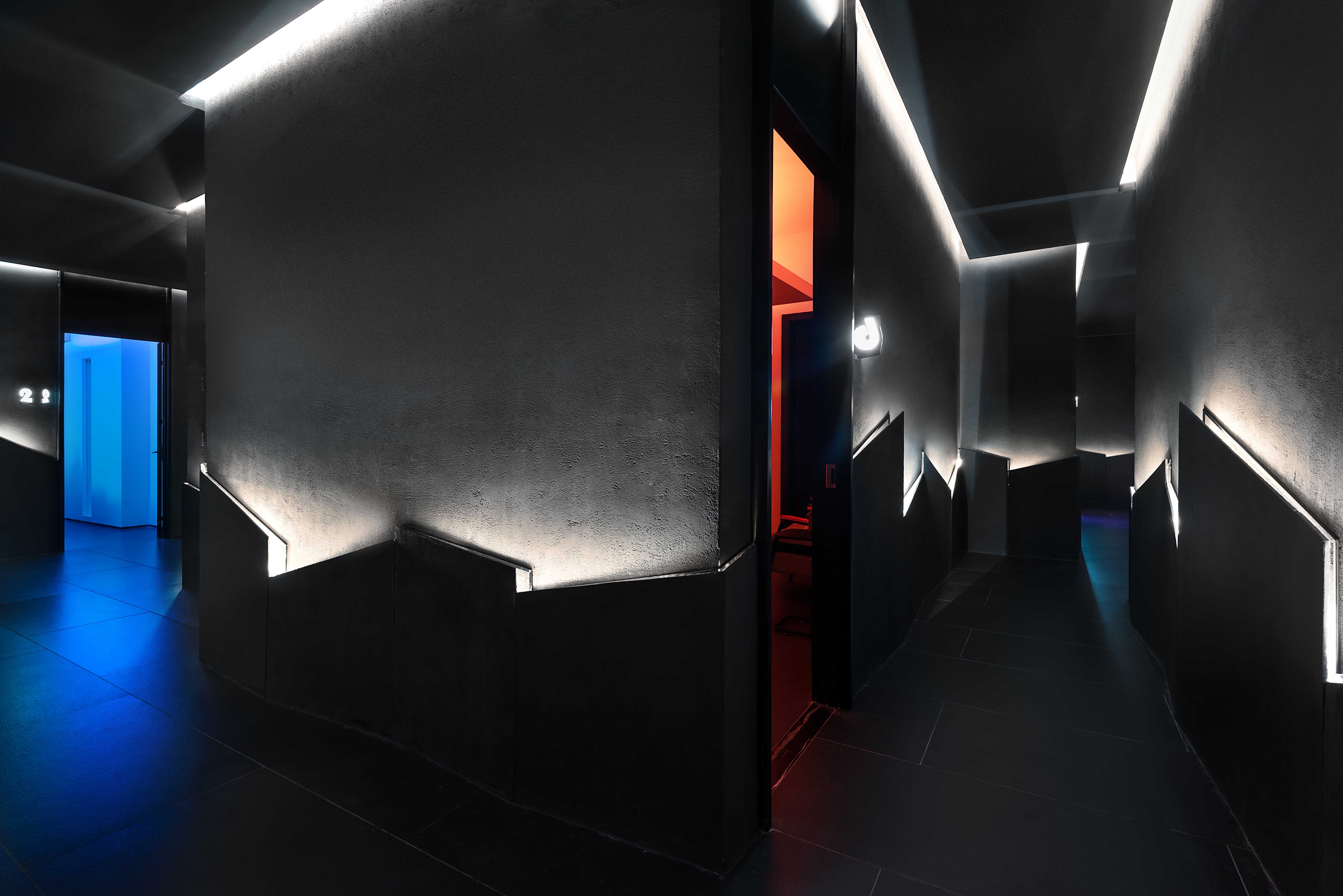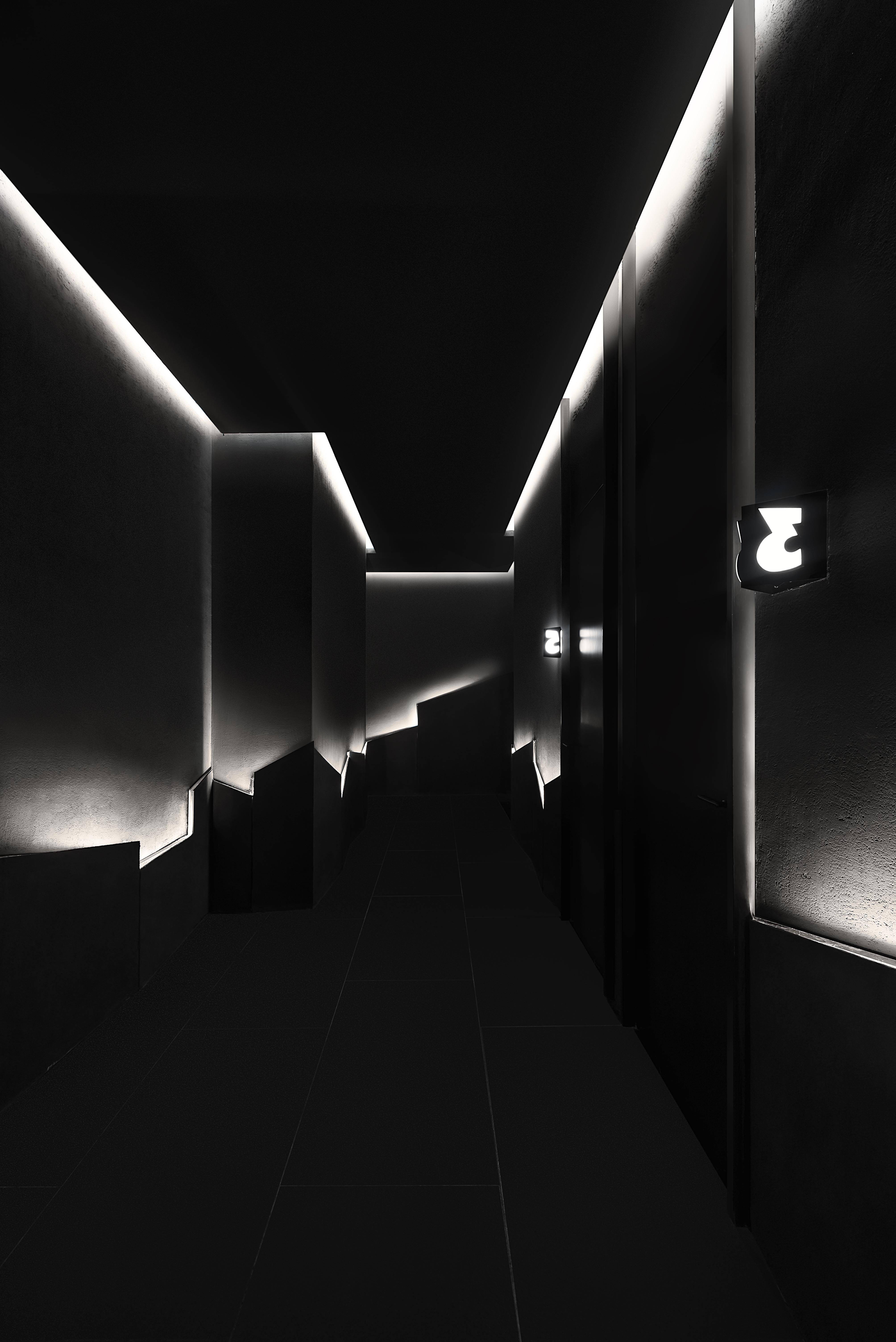 - 走廊 可调节线条灯模拟远山轮廓,深灰色墙面模糊室内外边界感,凸显灯光的引导,指引顾客步入房间。
