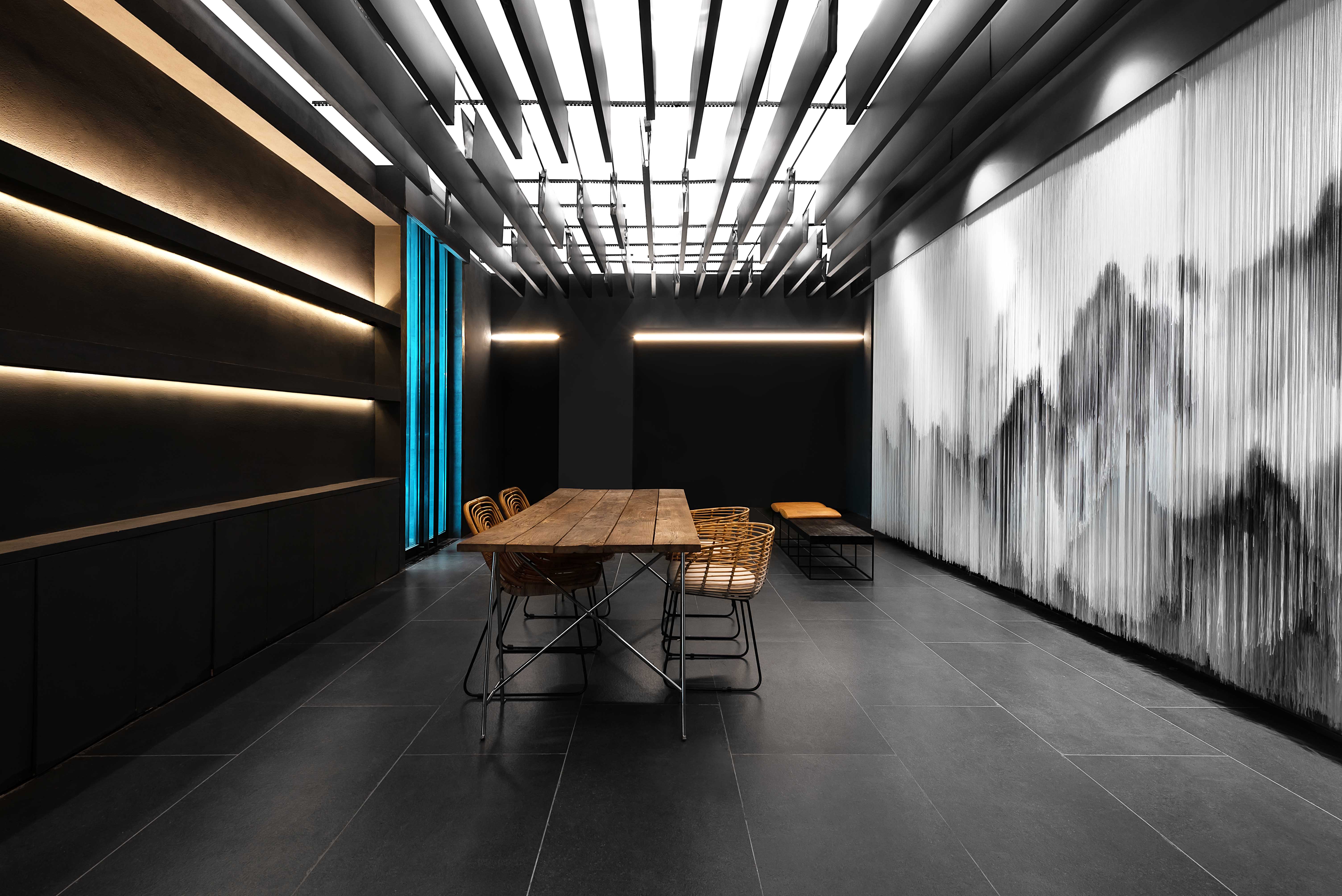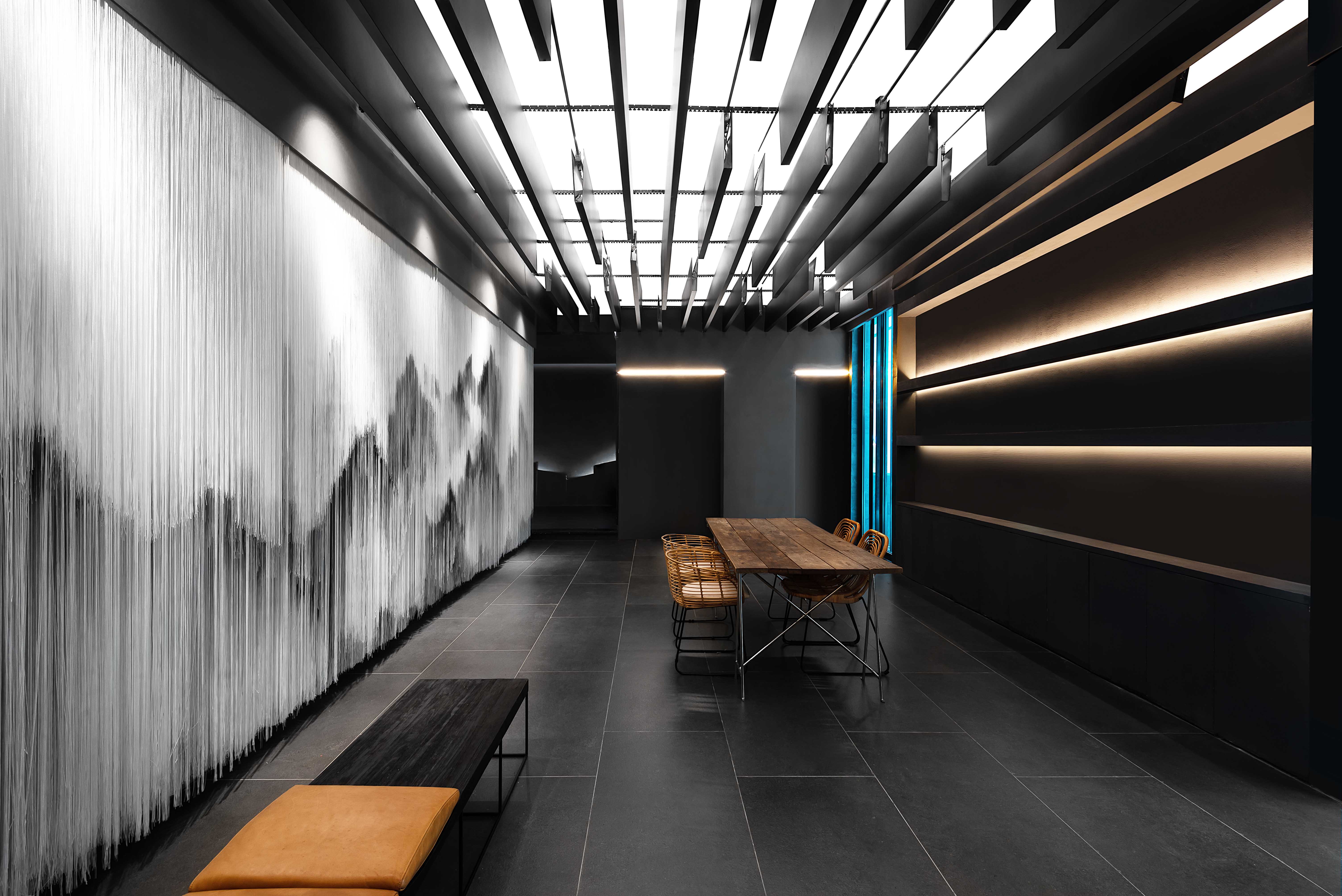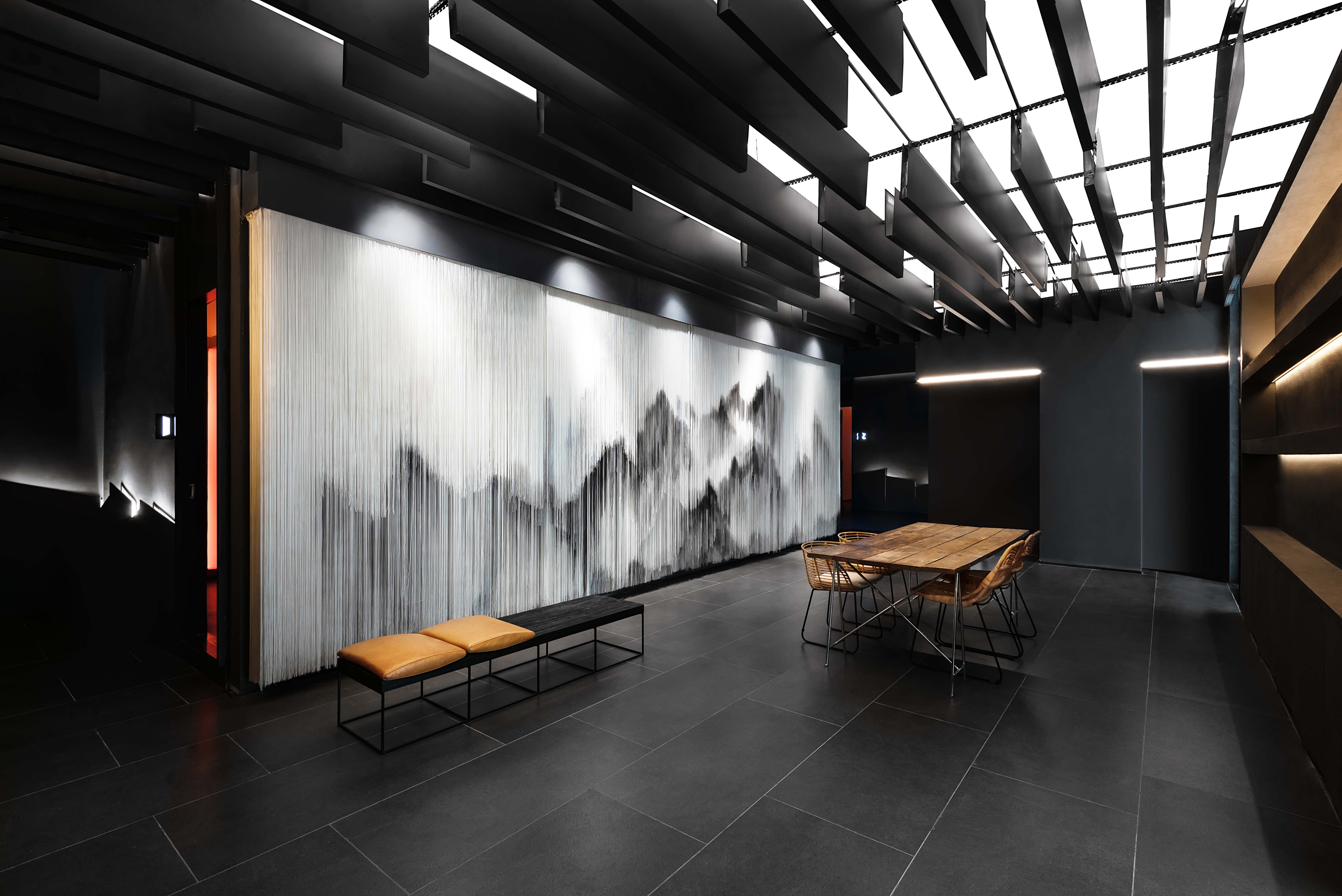 本案通过“水墨”艺术装置和模仿太阳光照在自然界中的感觉,把自然、松弛的空间气质与中国传统文化相结合,通过天棚、灯光、大地色系涂料等,打造具有中式韵味及文化的空间,强调“天、地、人”的融合,突出品牌本土化特点。