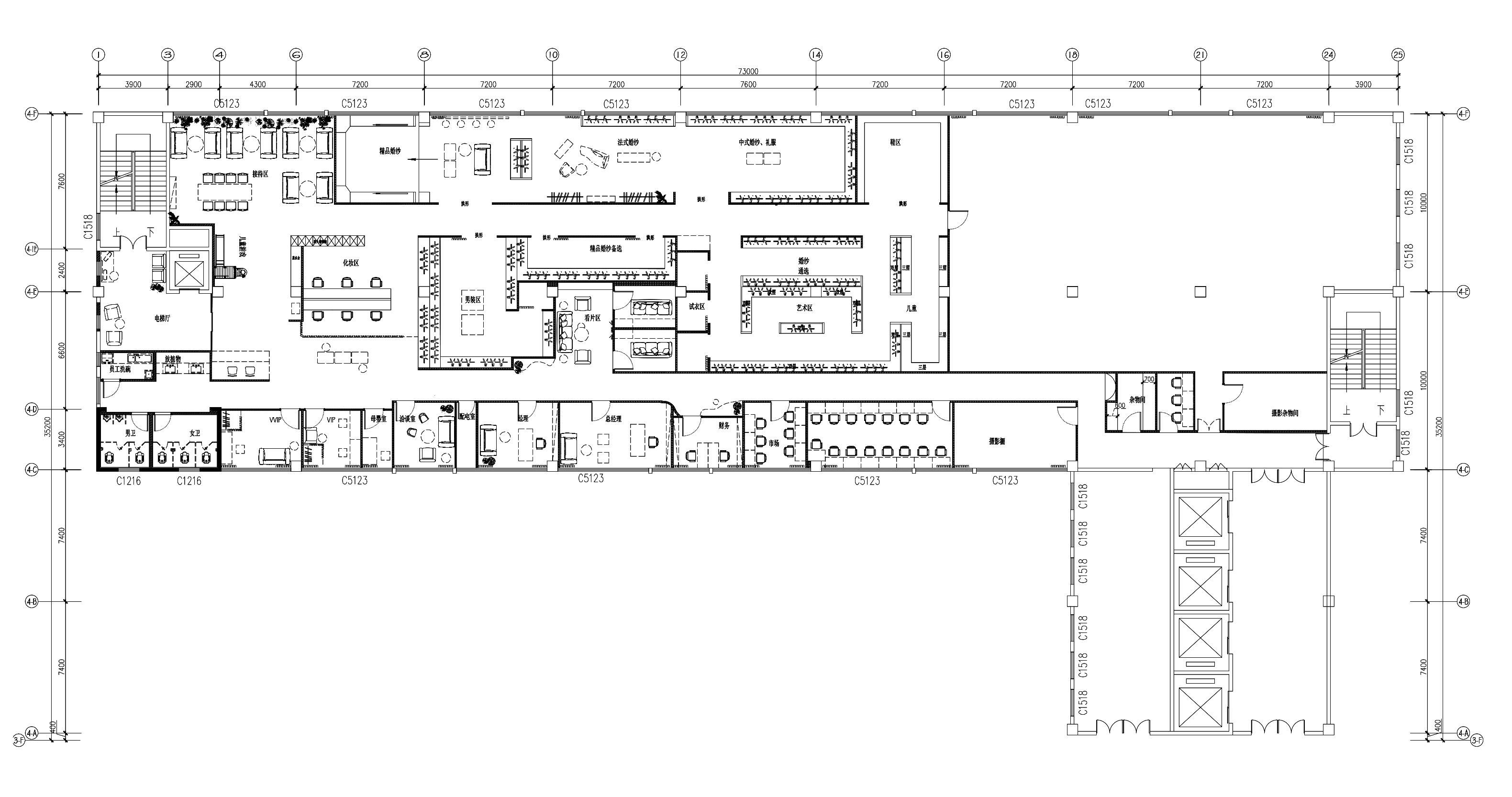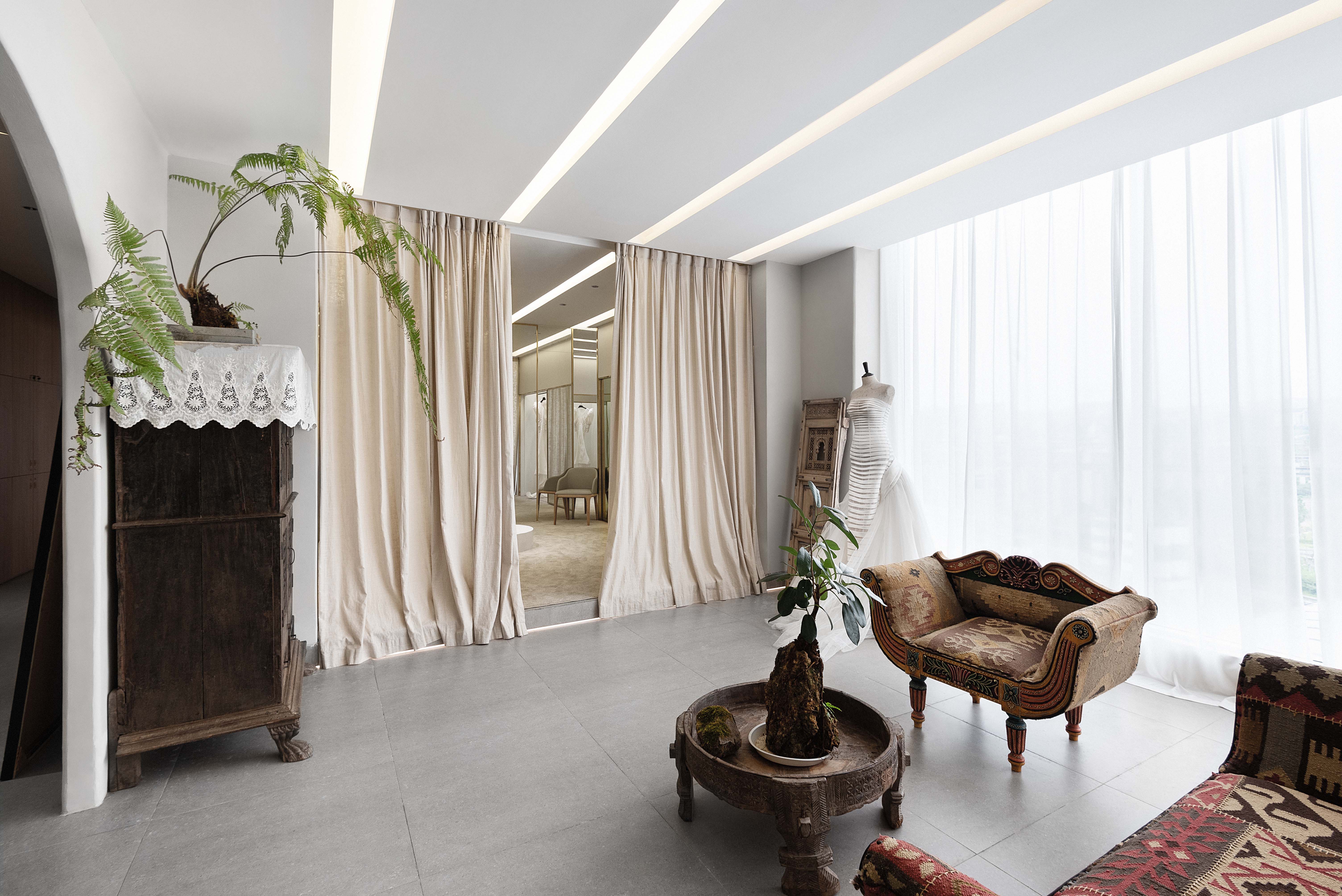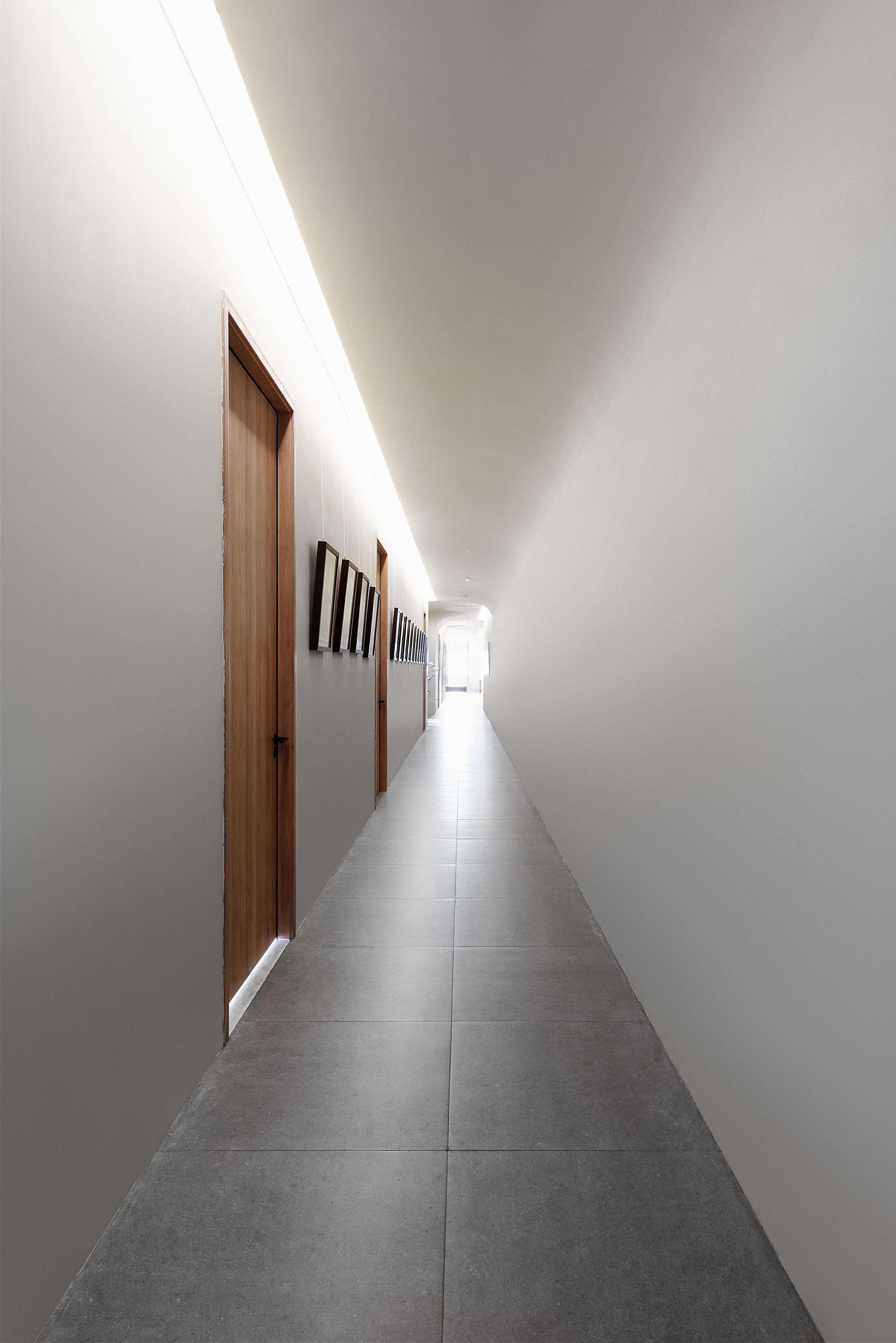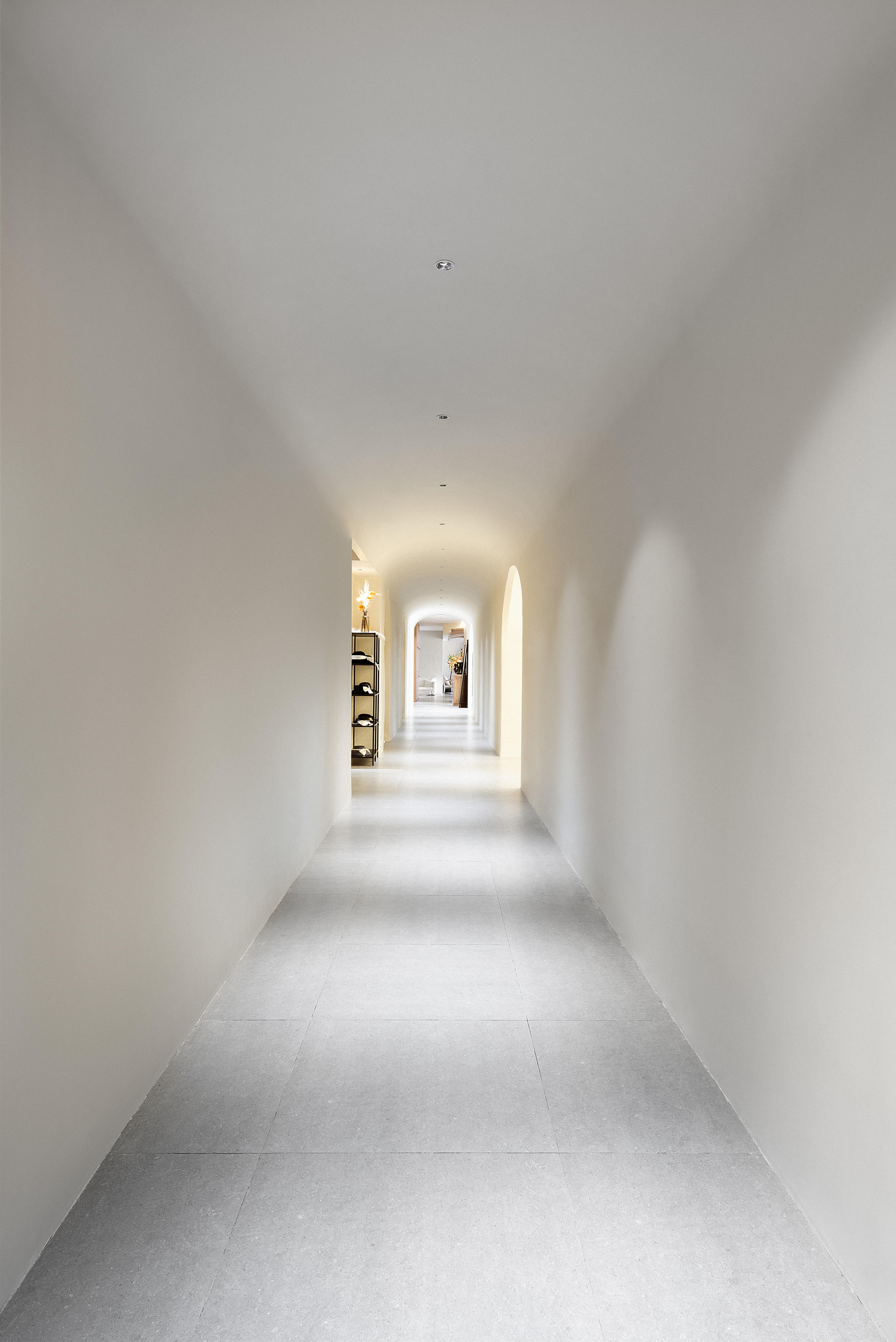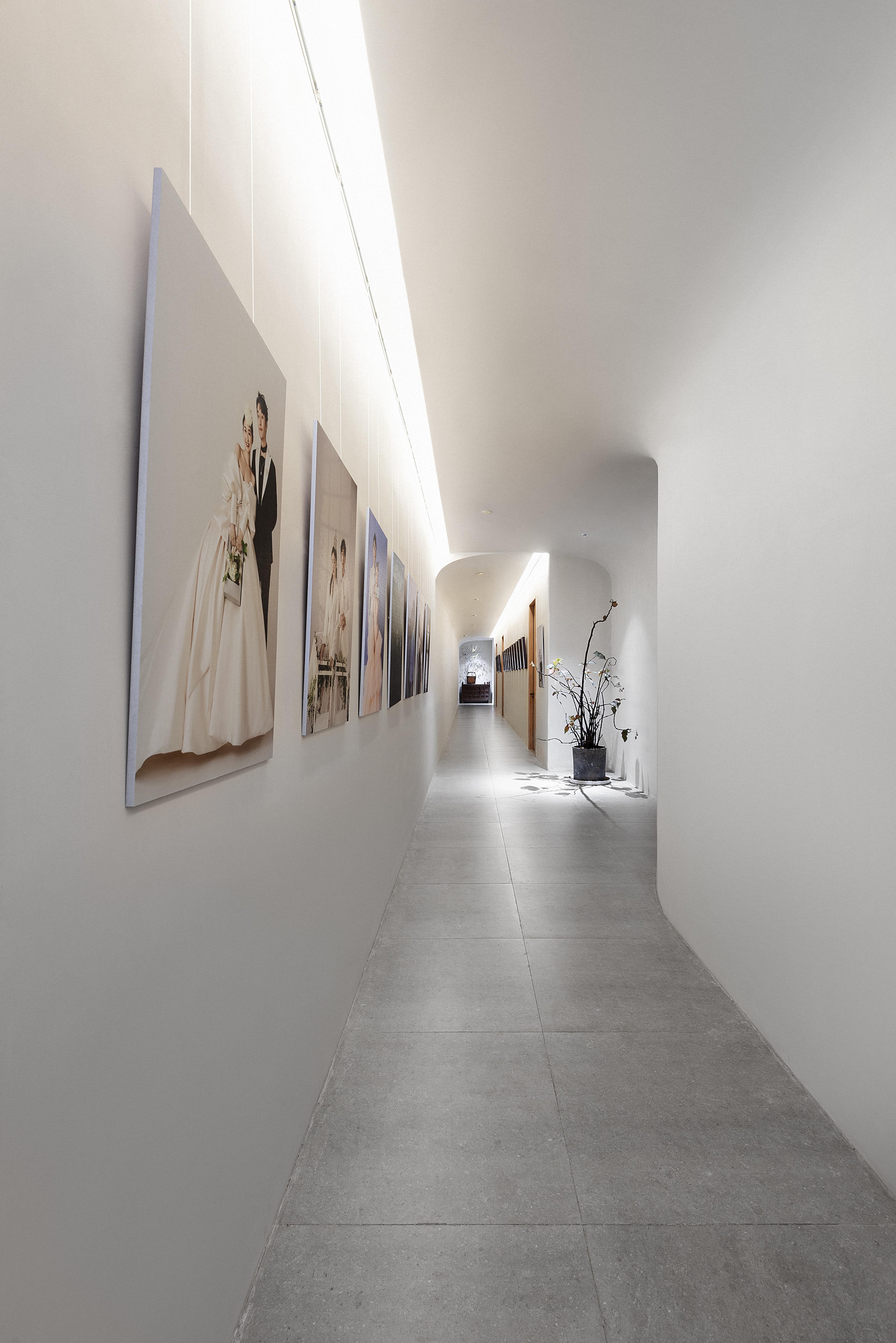 刻意设计的两条长廊,首先,是每个人行动的必经之路,墙面点缀画像,便使通道成了展示的一部分;其次,以“U字形”动线联动整个空间,让大厅、办公、化妆、服饰、展示、摄影等各区域串联,方便以最短的距离前往各处;此外,且利用其景深感搭配天花、墙面的统一材质营造沉浸效果,用弧形造型及交错的结构打破直线条的单调。