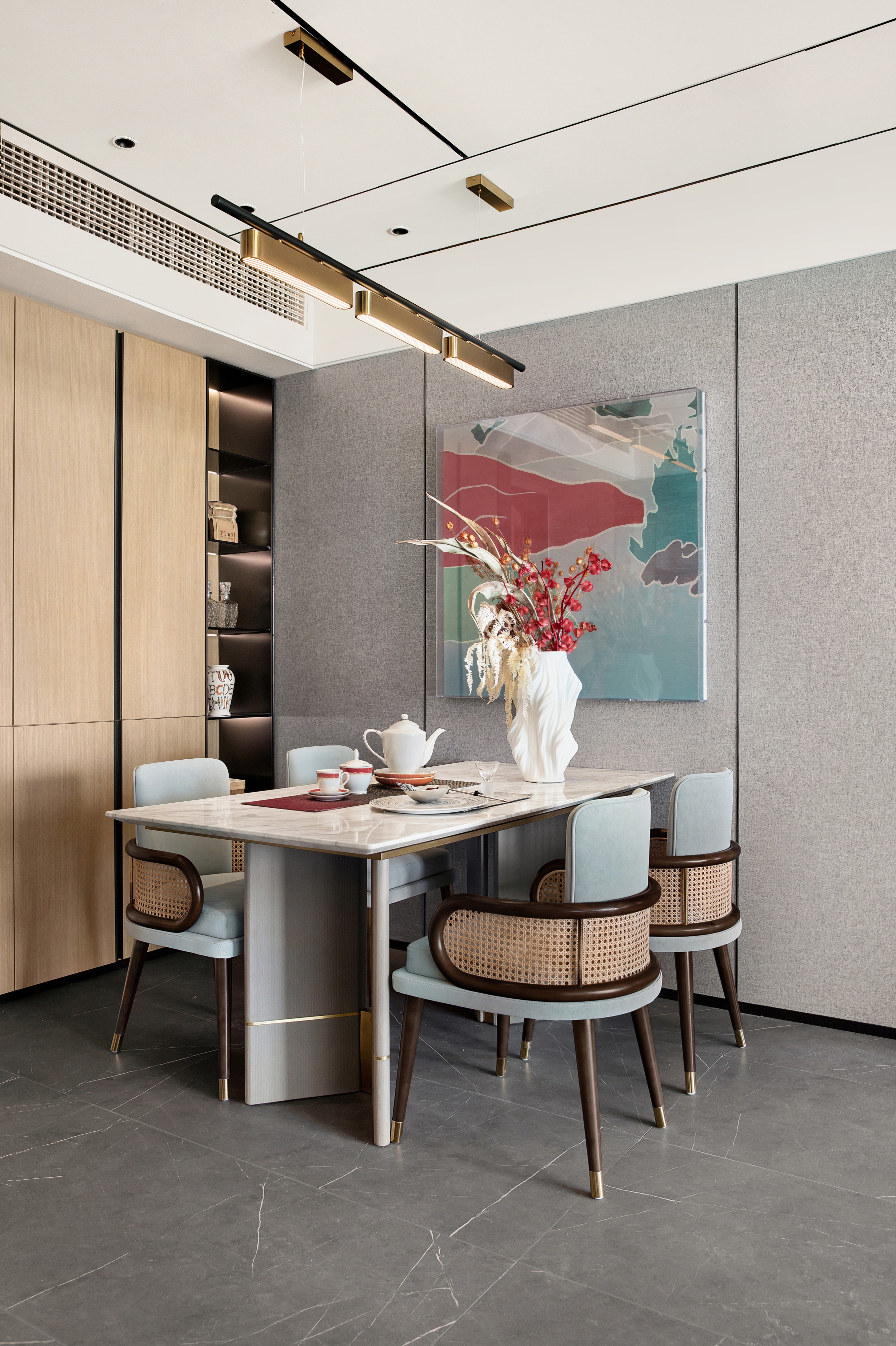 “日出江花红胜火,春来江水绿如蓝” 餐厅中式色调的雅致古典为整个环境都平添了几分温馨浪漫。设计简约的顶灯将光线轻盈散发出来,赋予原本静态的餐桌灵活的生命力。