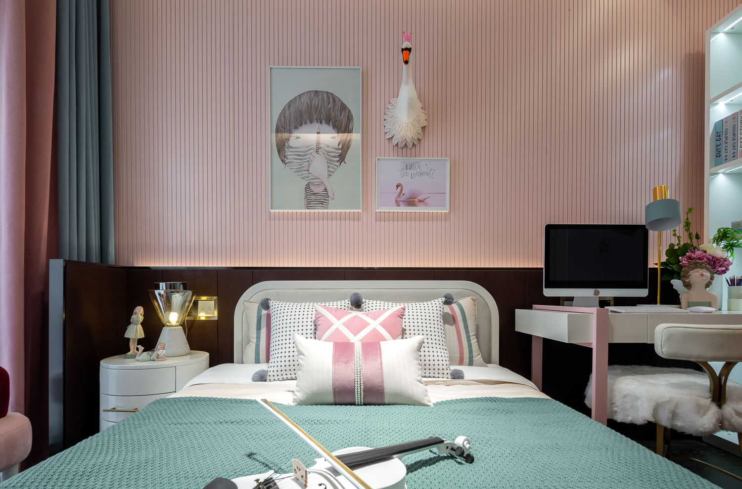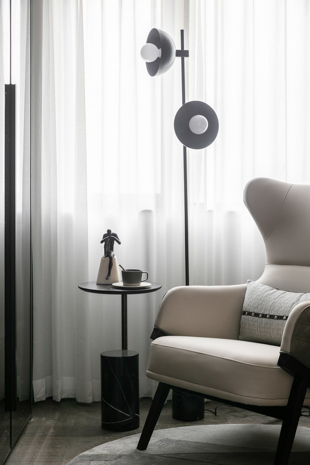 充分利用附属空间,例如阳台打造成网红休闲区,采用透明的吊篮、大理石的落地灯融合墙面的书架,例如主卧室的飘窗,打造成女主人的爱好角落。