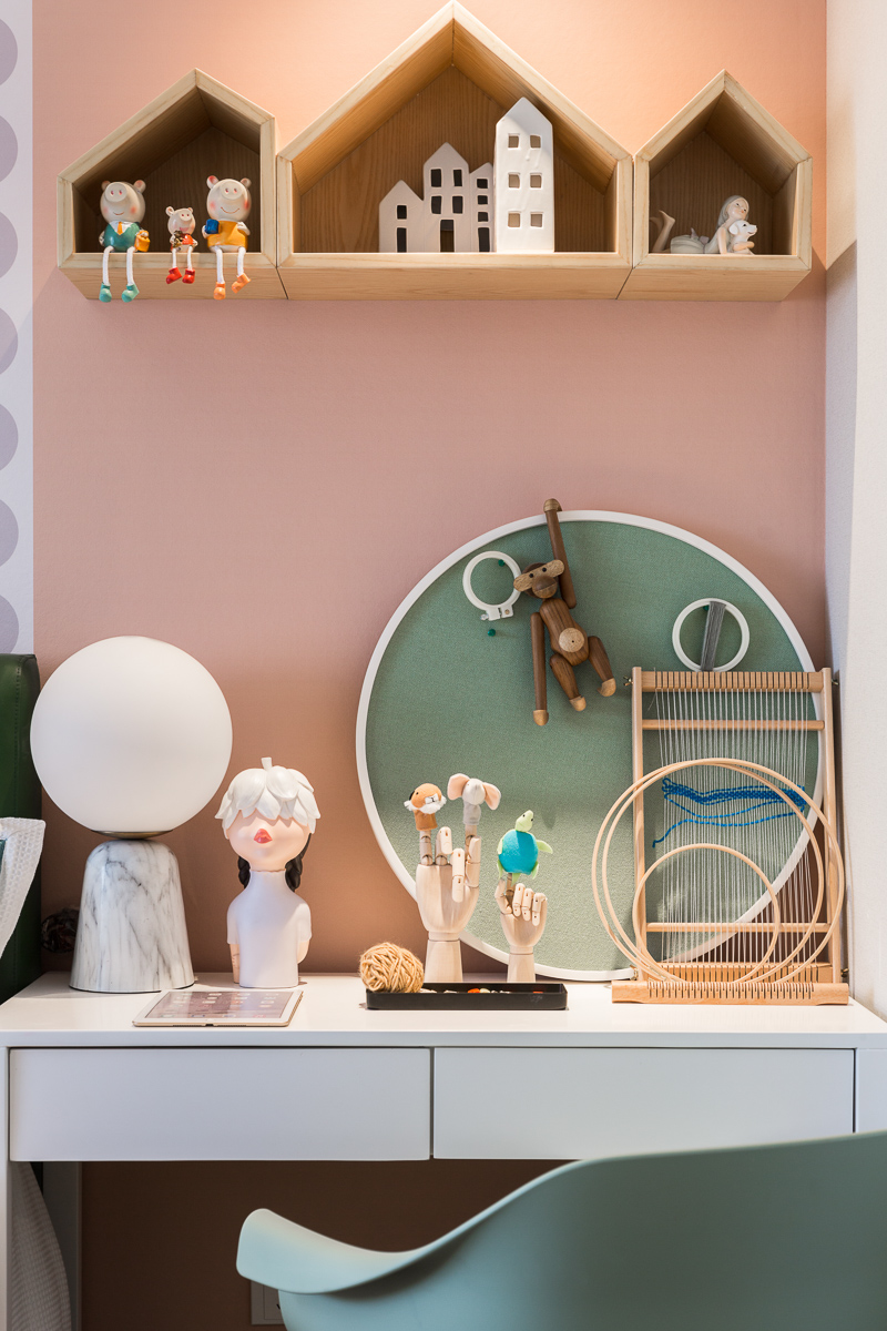 书房主要体现男主人的喜好布局,书架、皮艺制作,实现自我沉淀、精神得以充实。而在这些实用主义背后,反应的是现代人的审美情趣,也是这些点点滴滴的场景描绘,刻画出生活深刻的叙事情节。