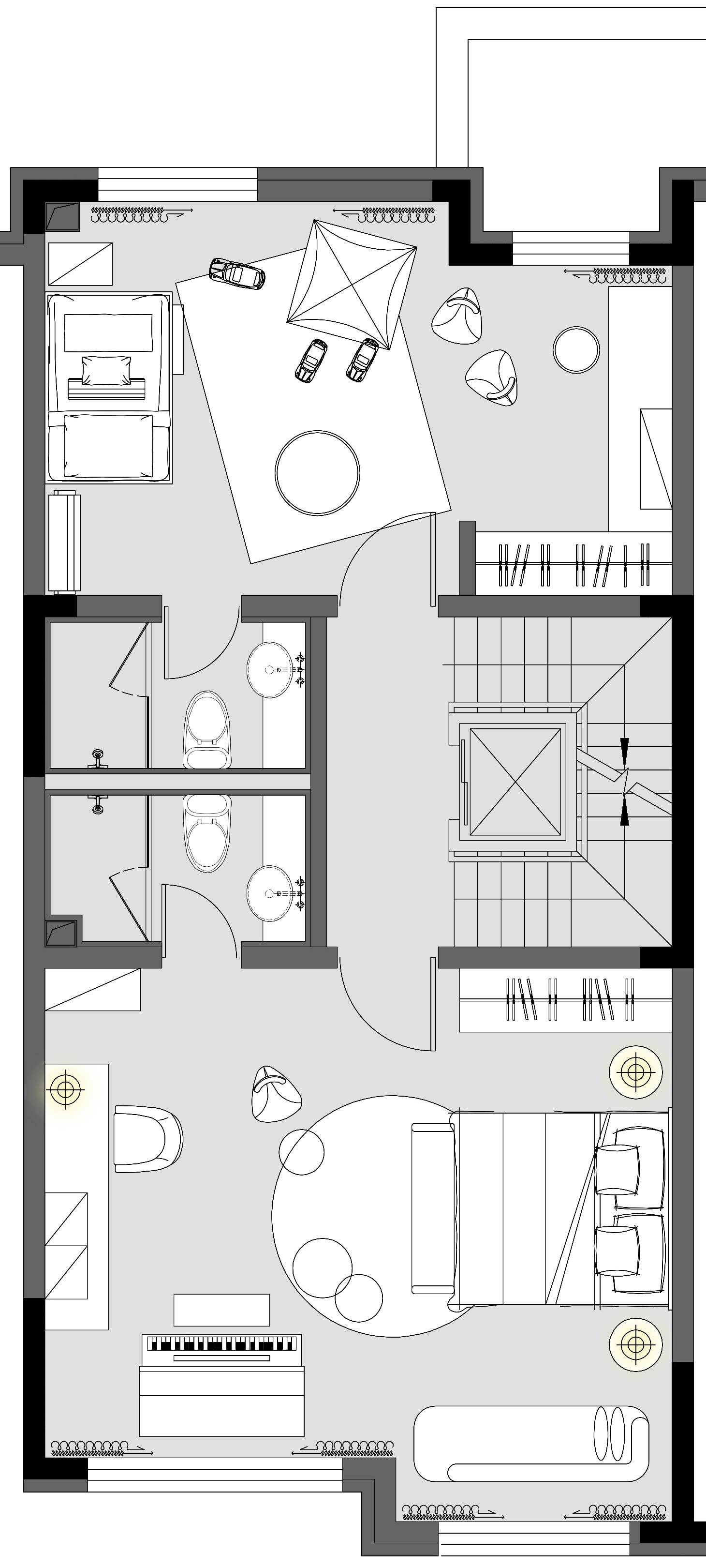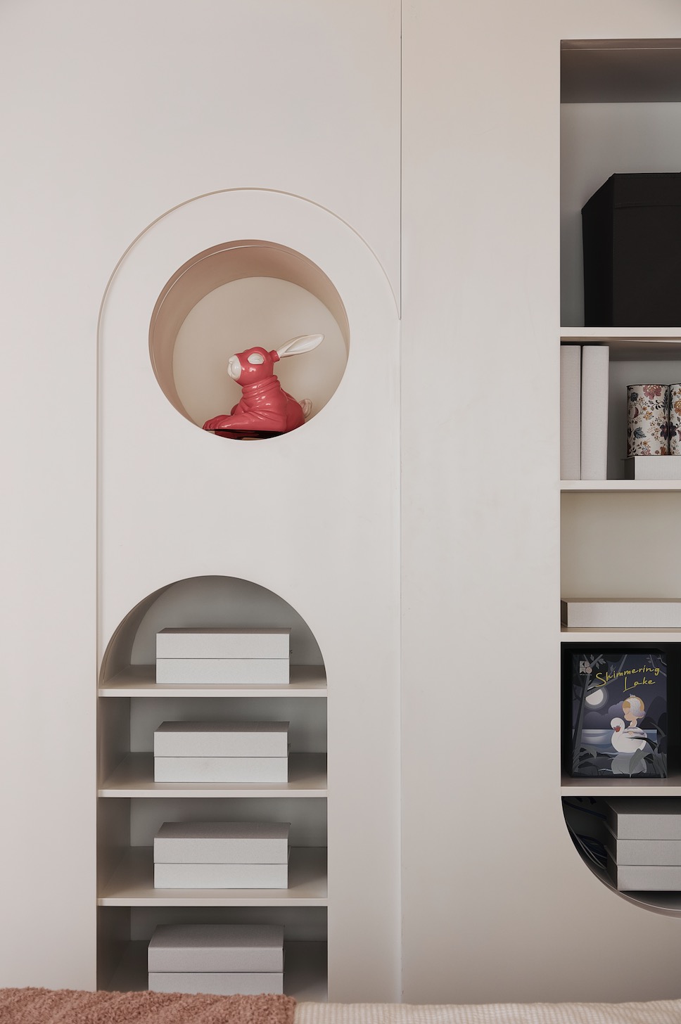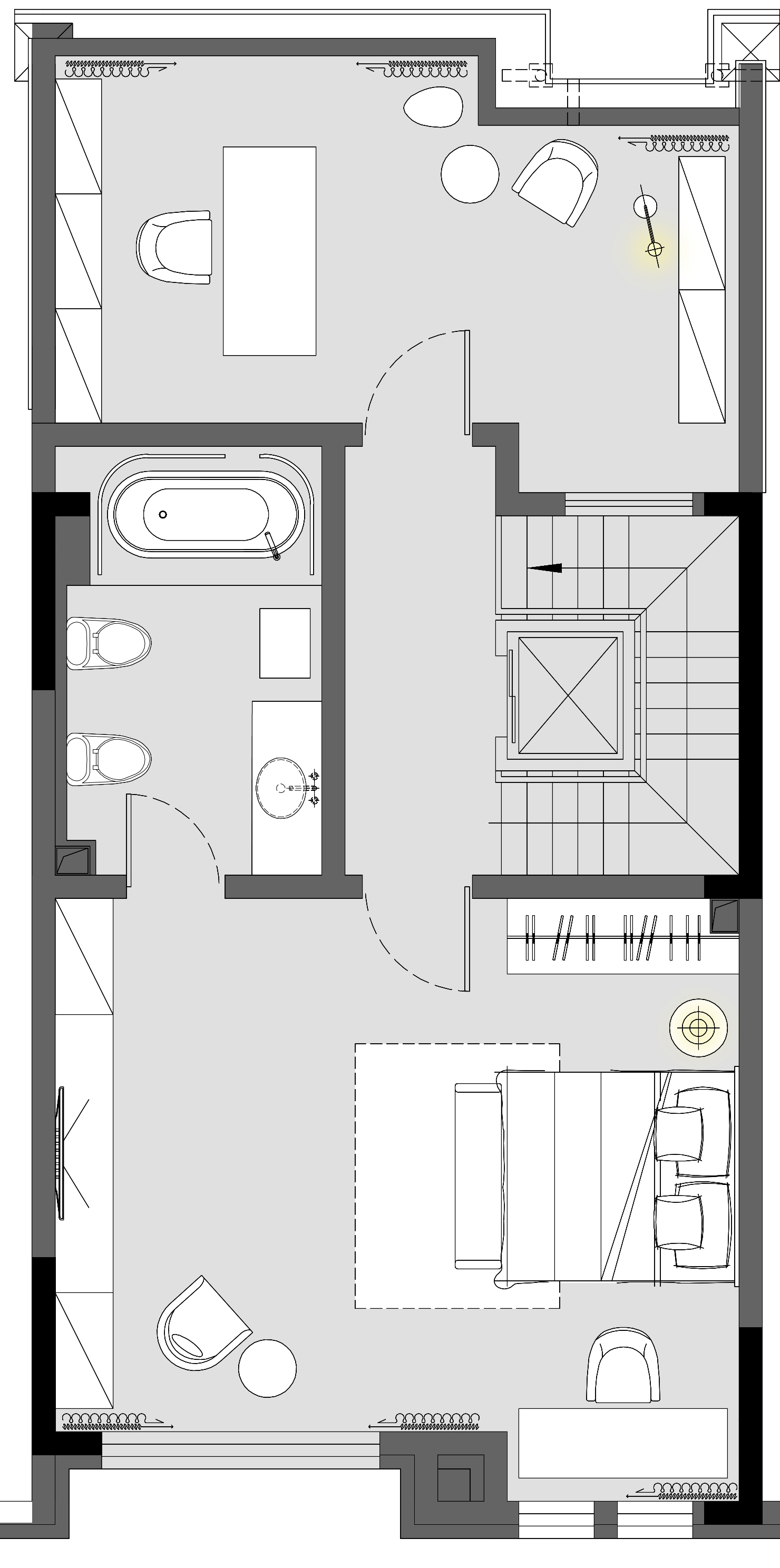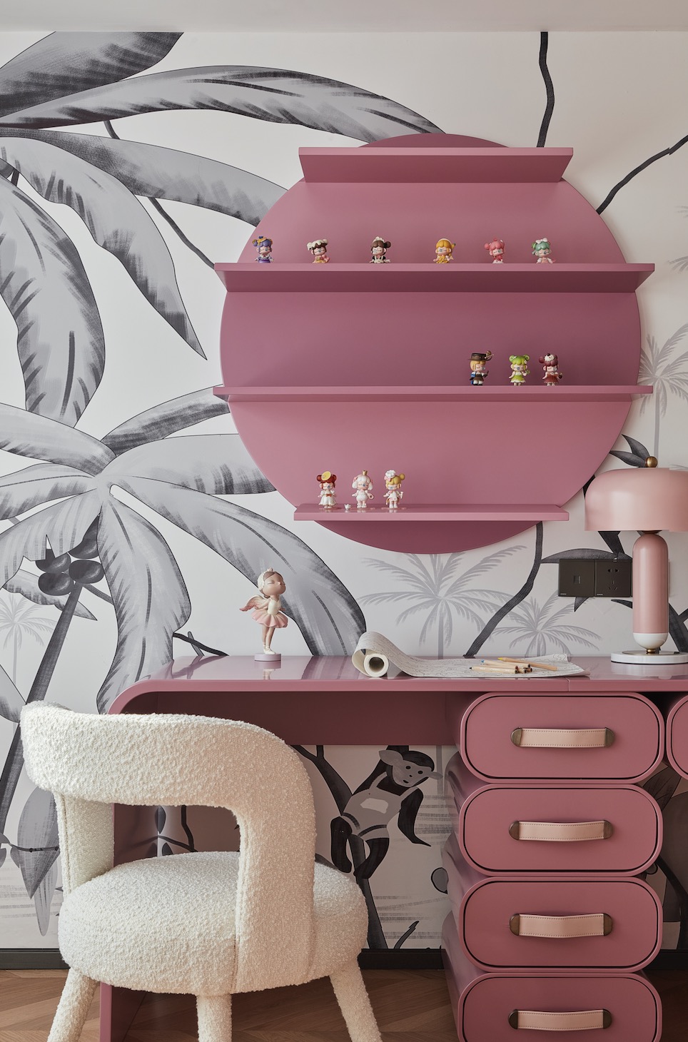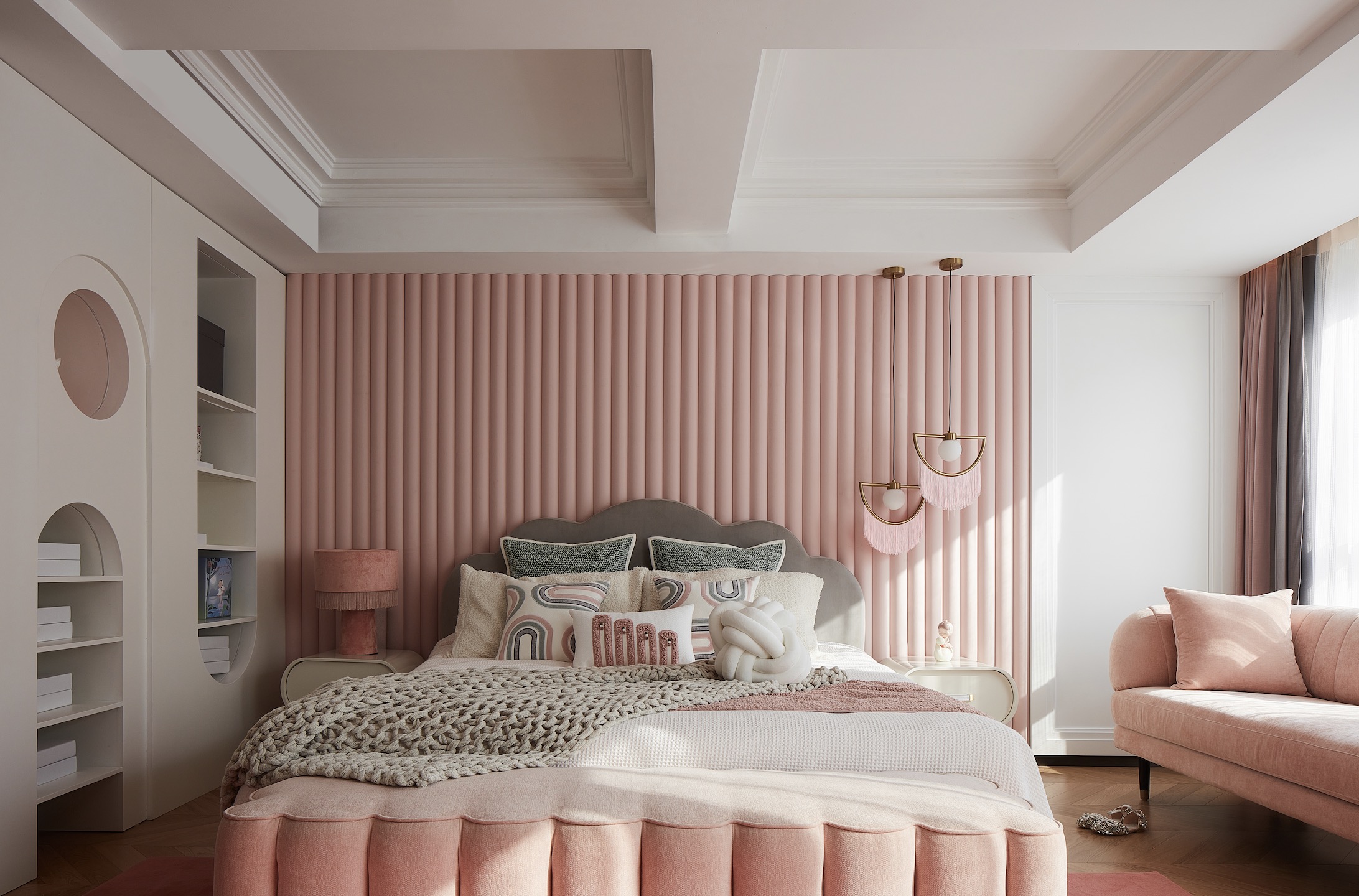 空间布局:空间布局上,将公共空间穿插设计在一层级地下空间,1F会客厅用于日常起居及招待客人。餐区将兼具西厨功能的岛台与餐桌一体化设计,通过自然亲和与现代轻奢的相映相携,形成沉静含蓄的空间体系。 地下共享空间,将光线引入。酒吧区为主人打造专属活动空间。二层是给孩子展现自己才艺的小剧场,粉色系的女儿房,营造美好童年甜蜜的对话感受。3F主卧空间作为私属空间,合理划分出了起居区、睡眠区、卫浴区,有效利用各个区域和角落。