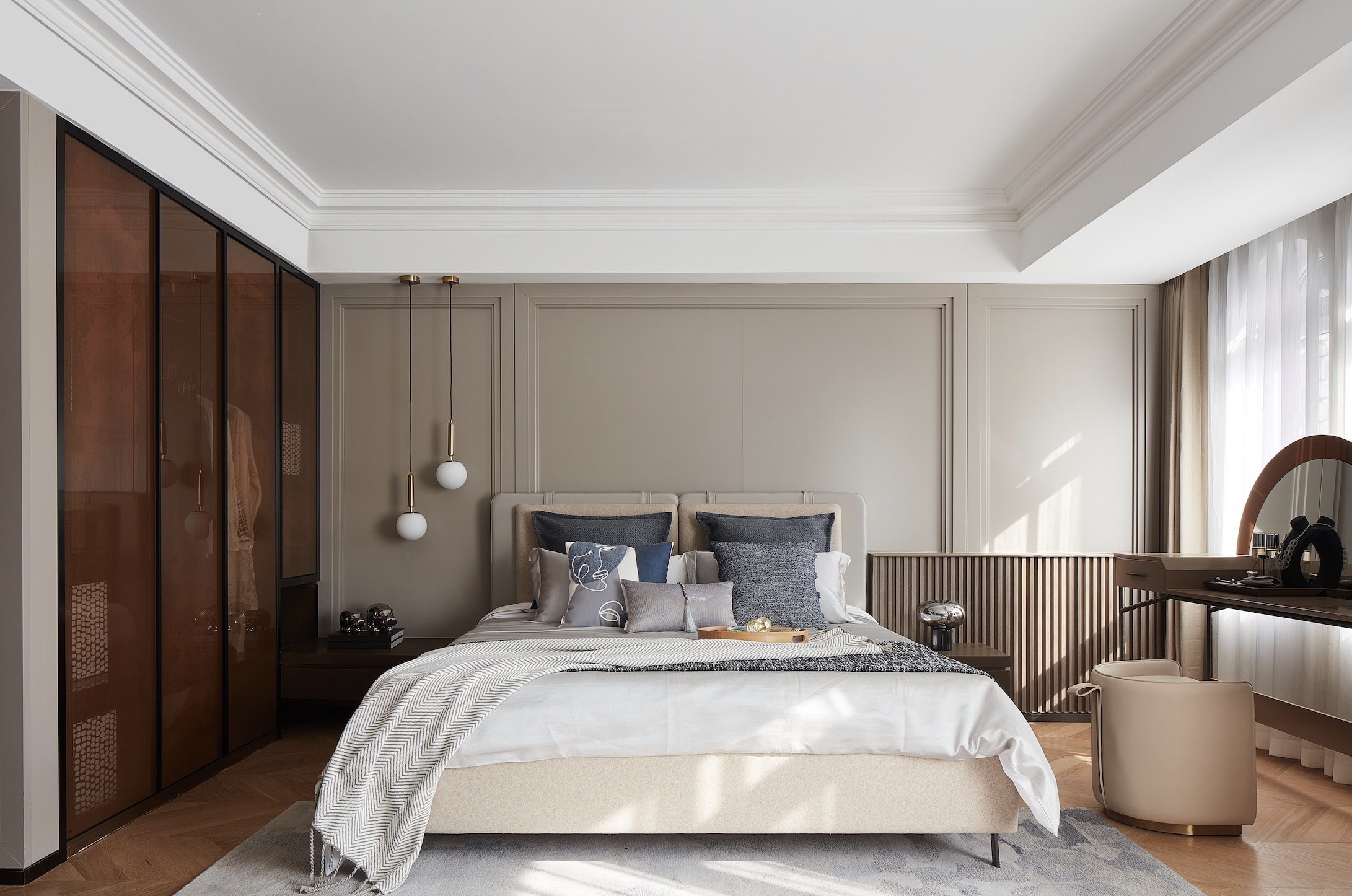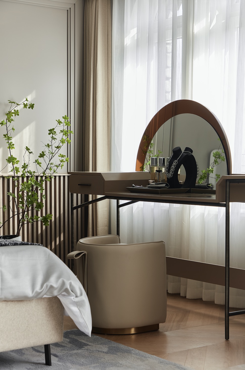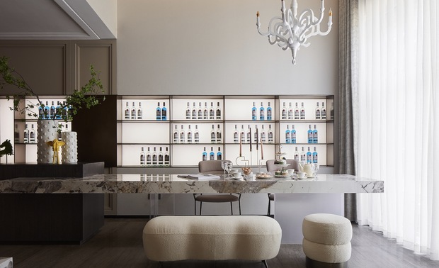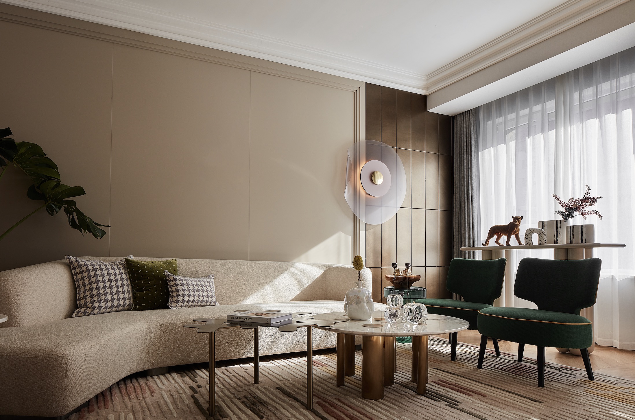 设计选材:不再局限于实物材质,使用光与自然湖景作为设计素材。利用其不同的角度来适应样板房的动态销售追求。进入正门,肌理艺术漆结合阳光,干净整洁的空间,通过落地窗可以看到周围湖光景色。柔和曲线营造了家庭充满乐趣和活力的氛围。通过金属担当空间点缀色,通过不同色调的光,使空间丰富的纹理变得栩栩如生。