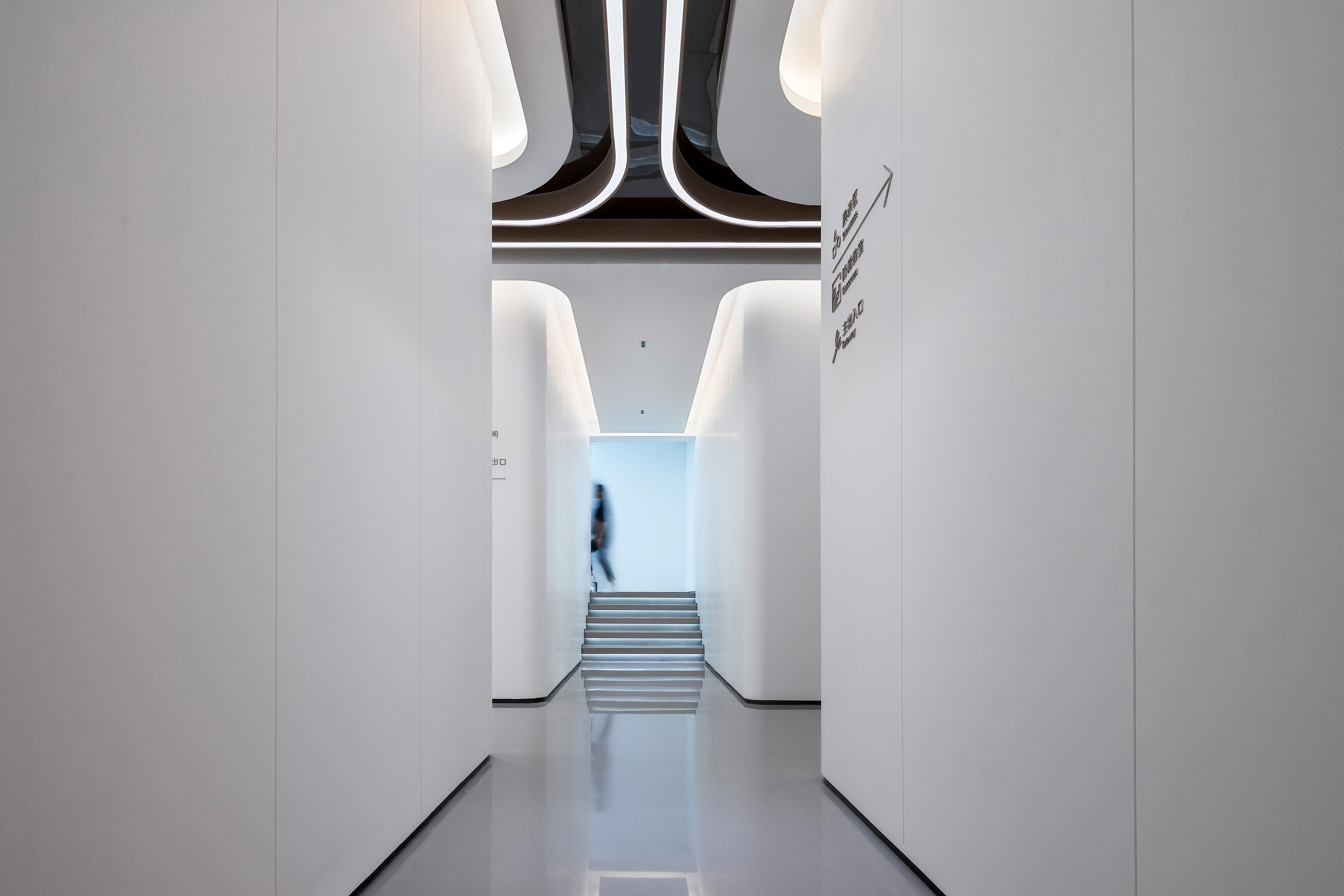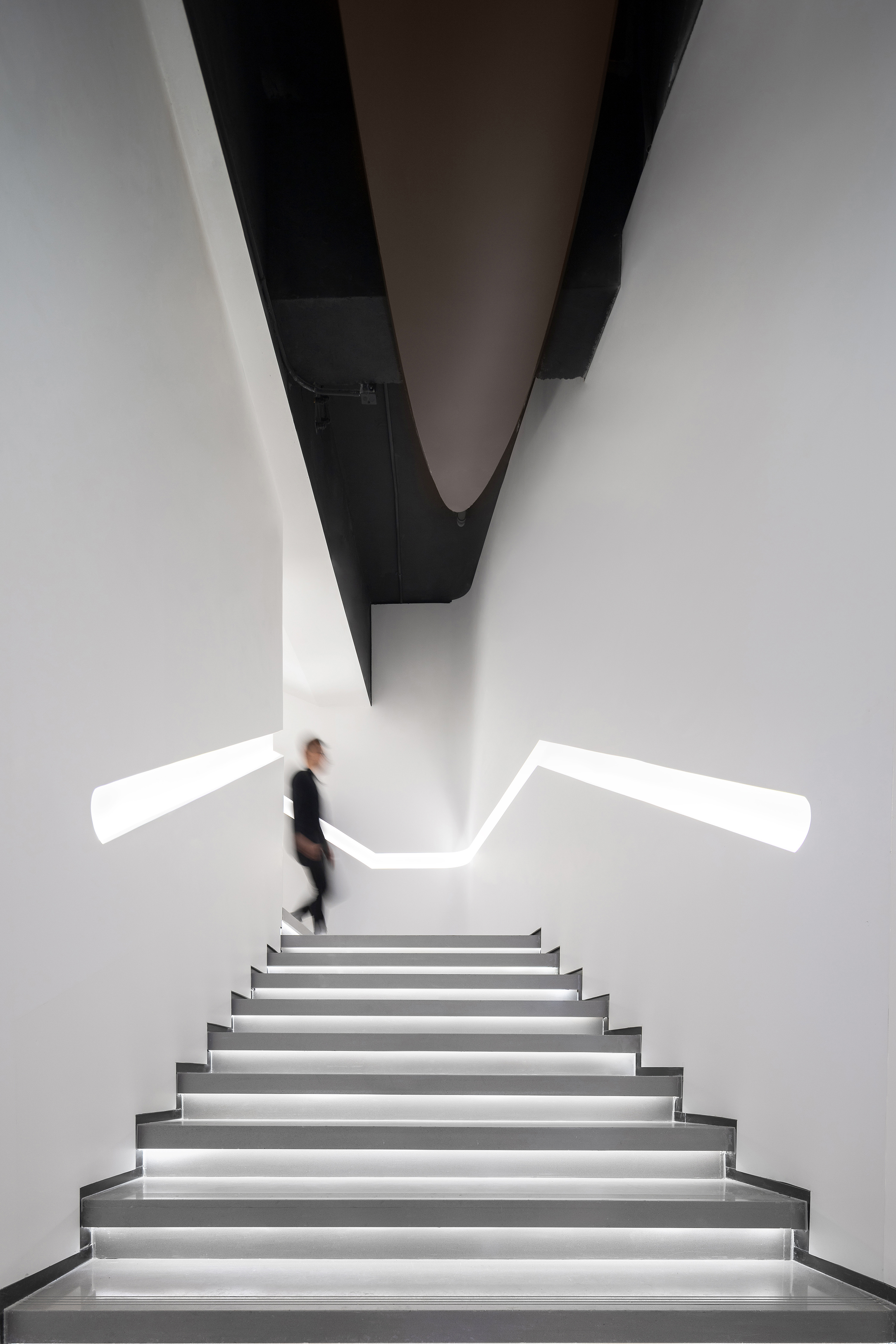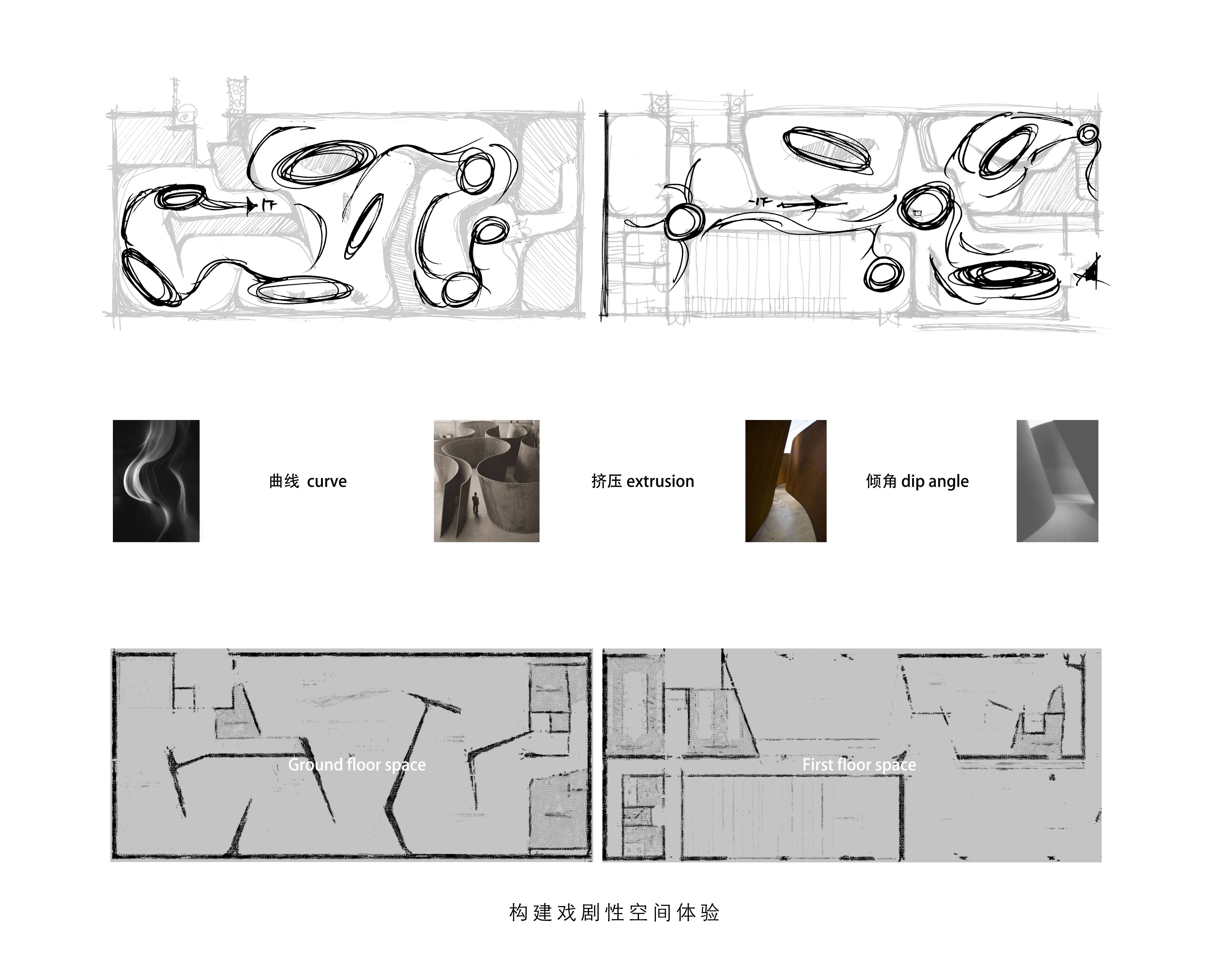 剥离建筑结构与所有装饰形态,空间为最终的载体,将流线与序列打散重塑空间,曲线、圆弧、倾角粘结构建新的空间规划序列,营造戏剧性的空间体验。