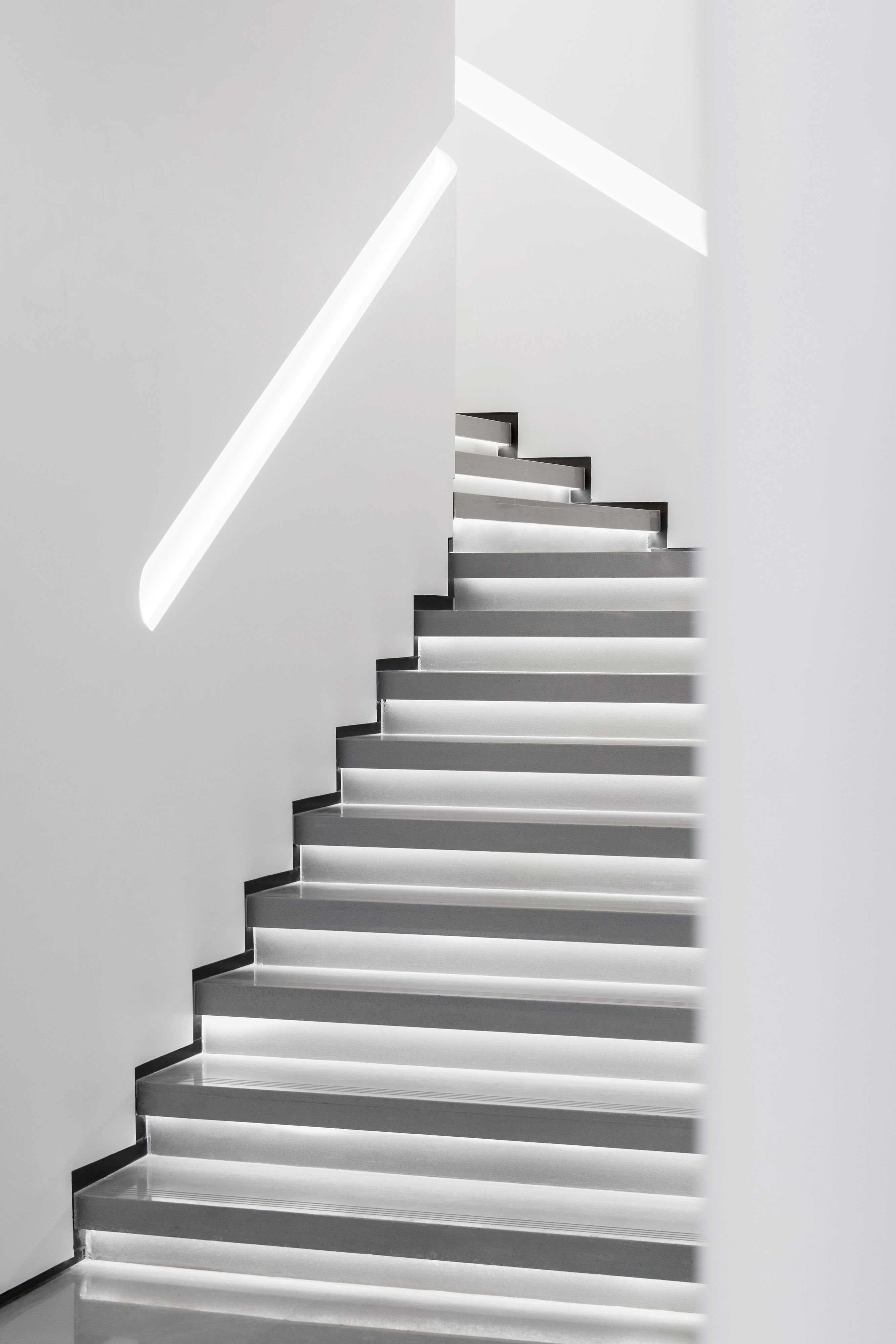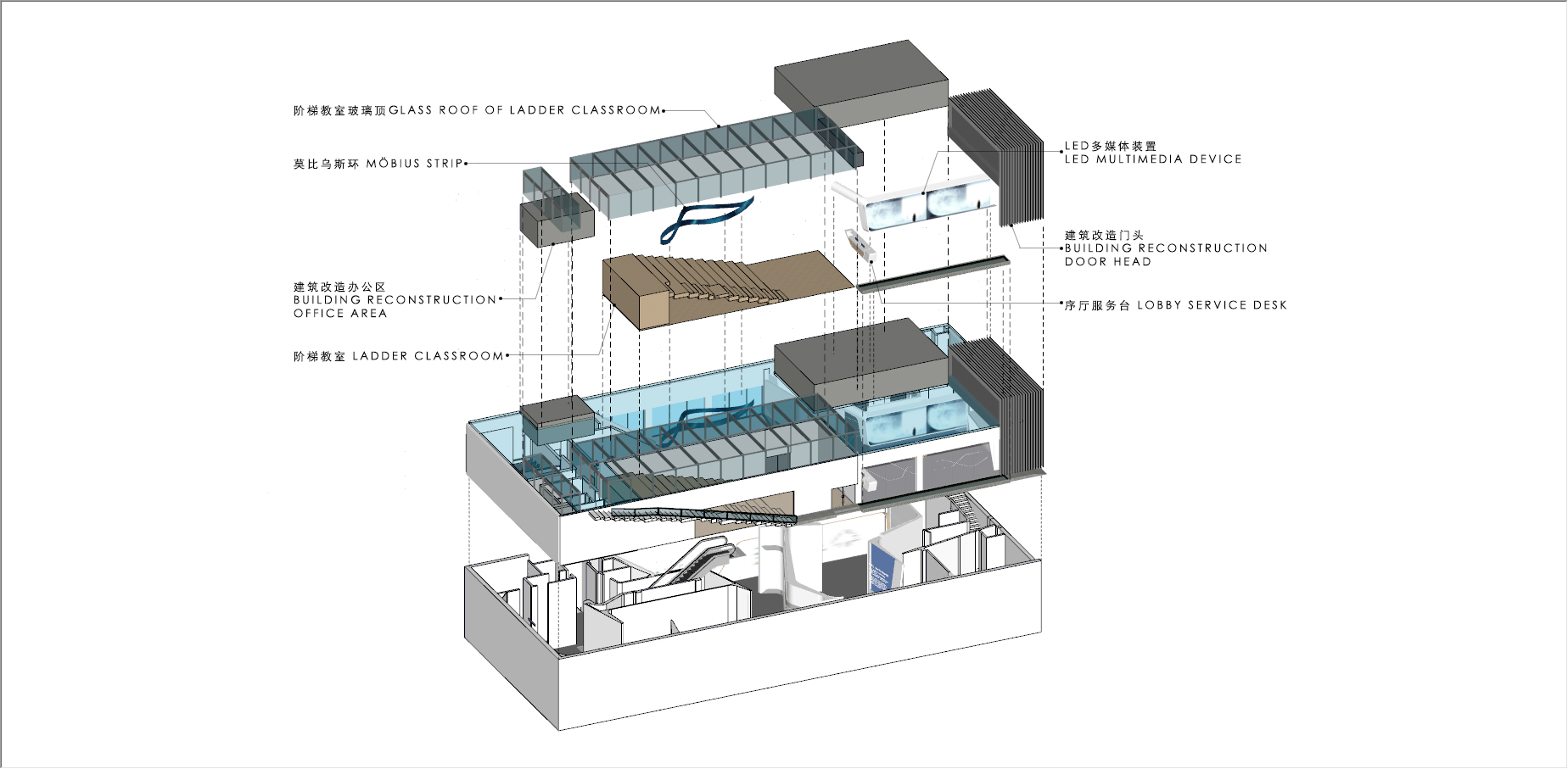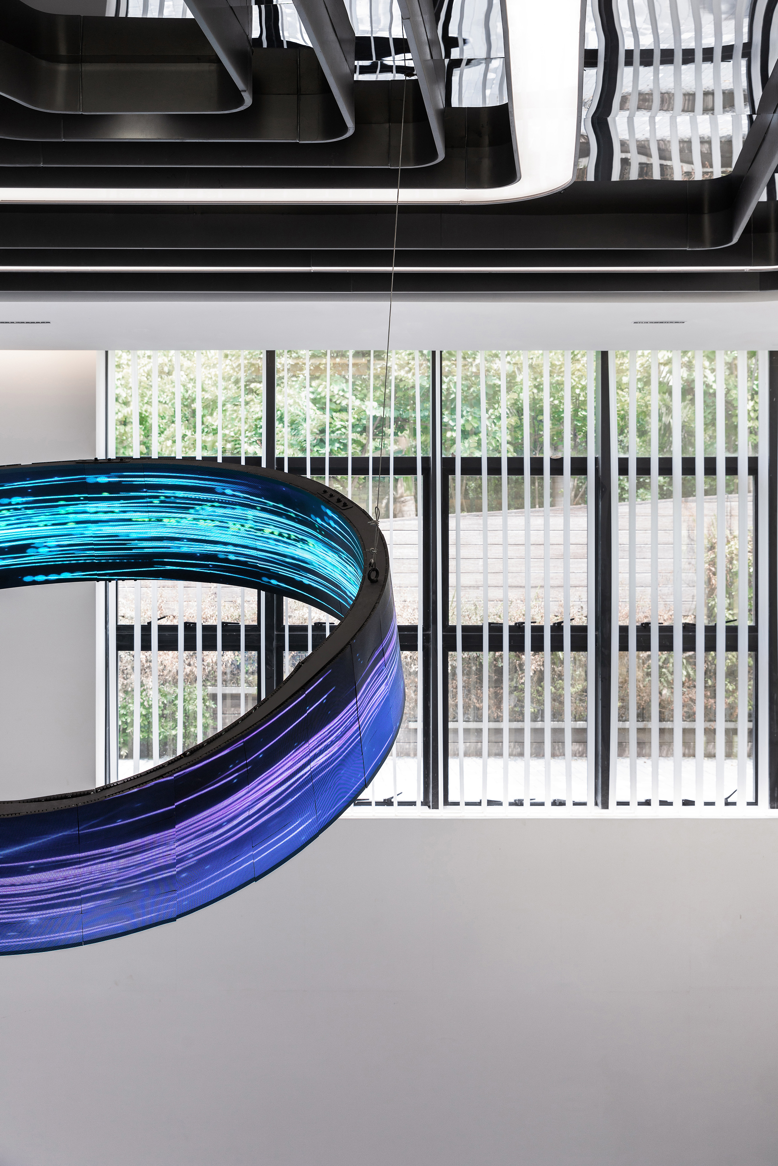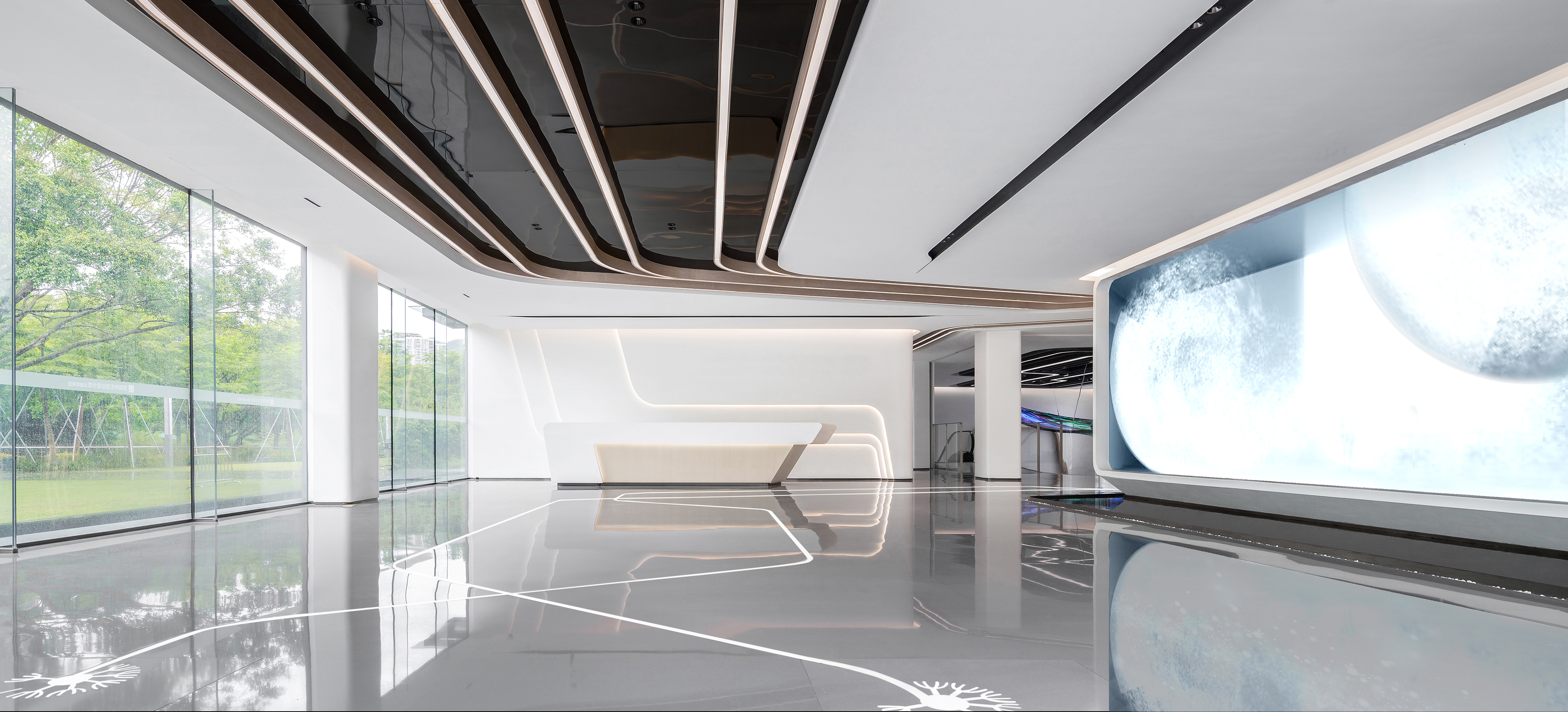剥离建筑结构与所有装饰形态,空间为最终的载体,将流线与序列打散重塑空间,曲线、圆弧、倾角粘结构建新的空间规划序列,营造戏剧性的空间体验。