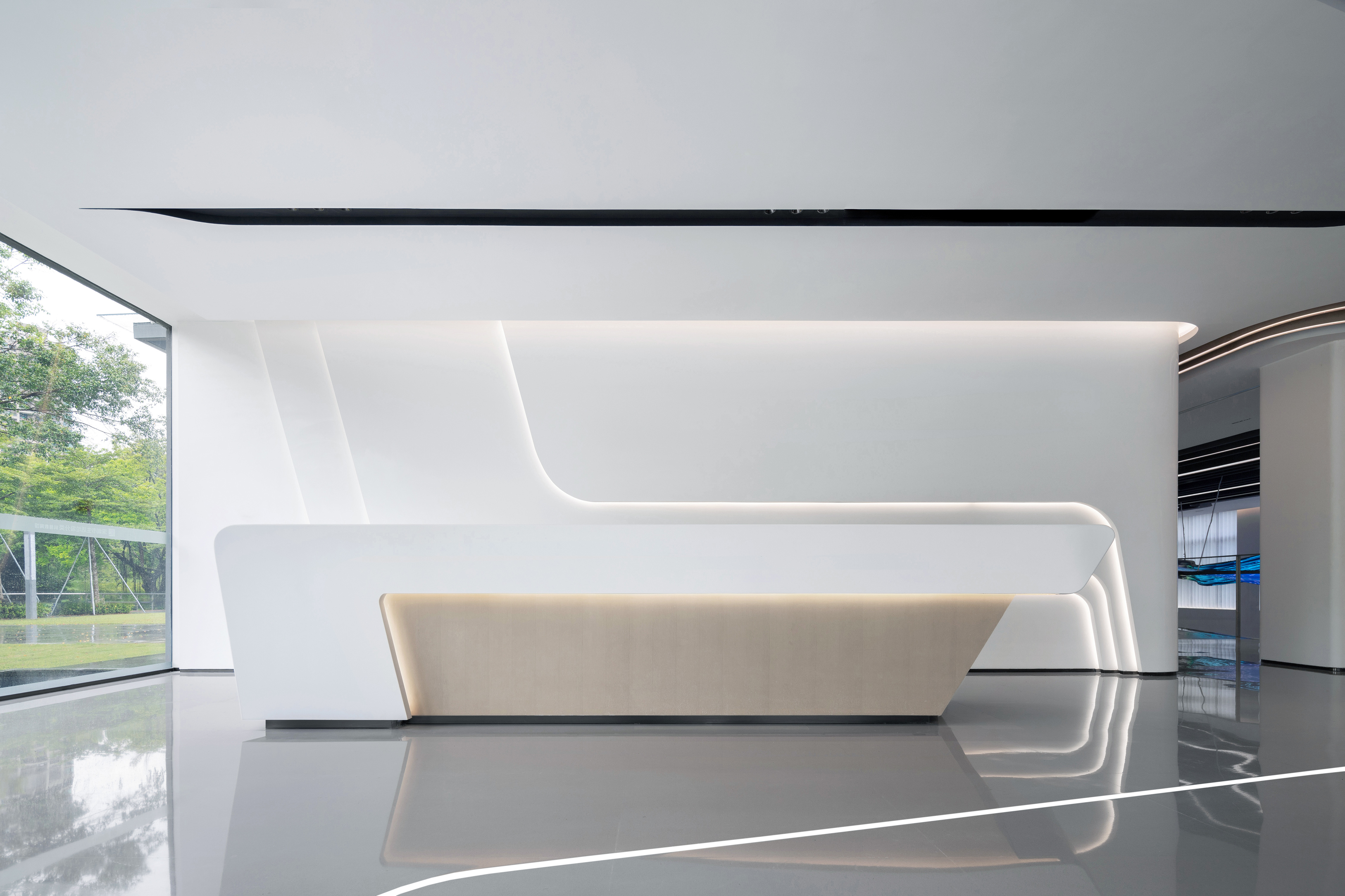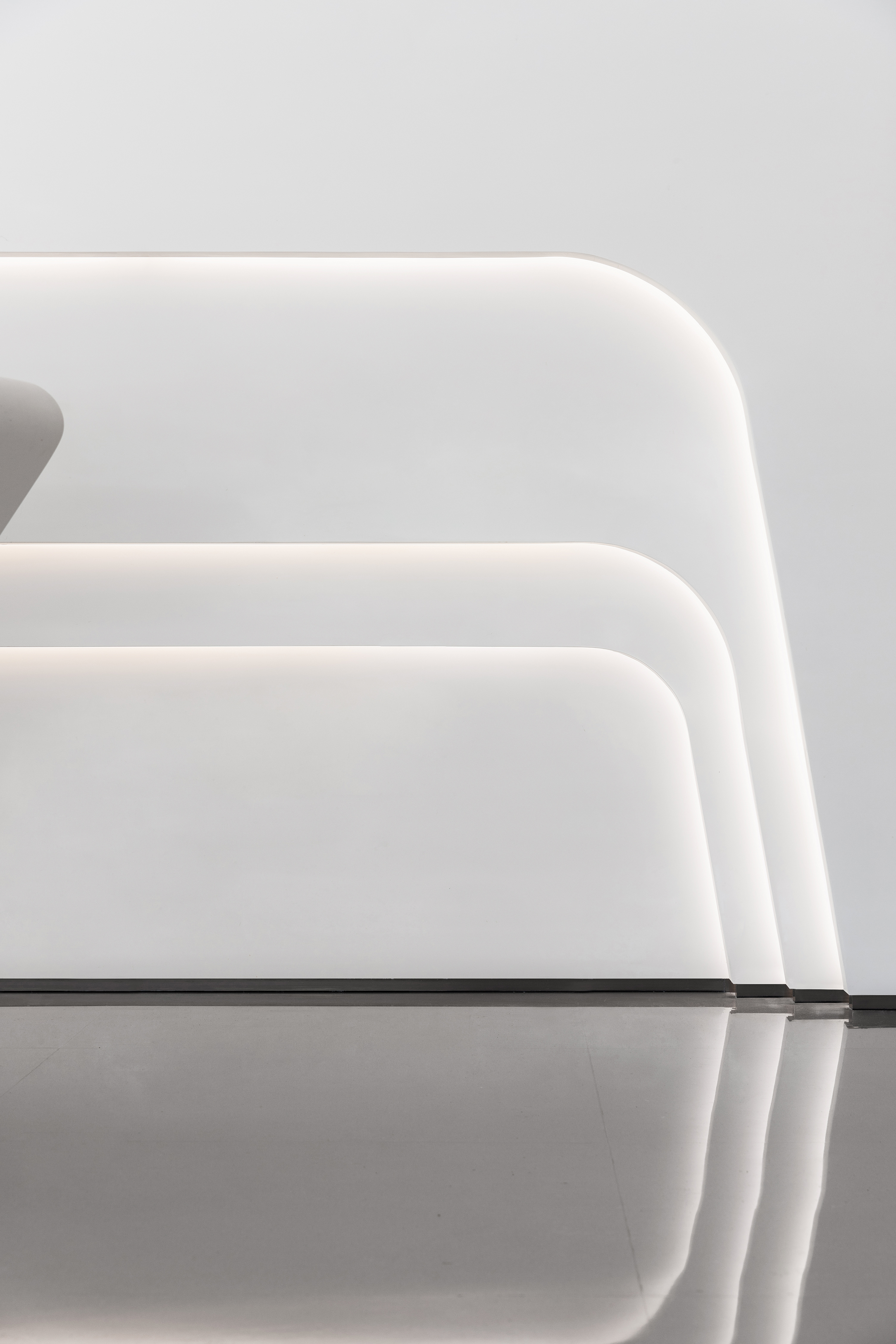 用可塑性很强的国产人造石与白色涂料营造空间的整体性与未来感,同时尽可能的精简用材品类。