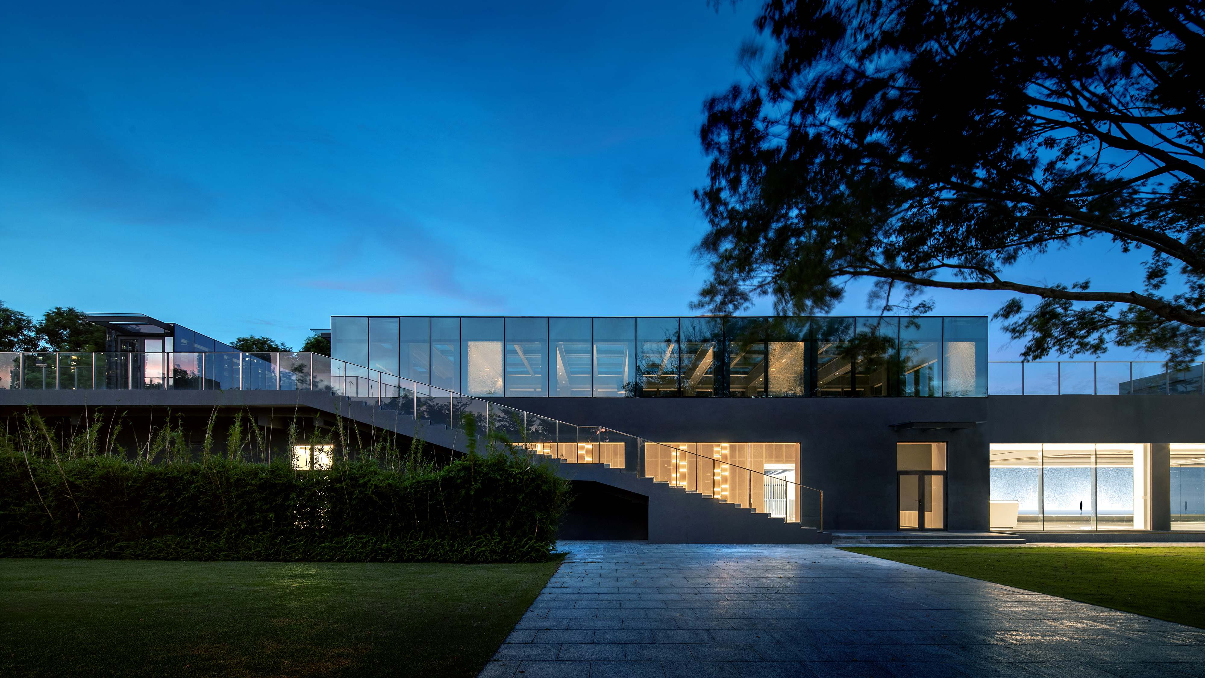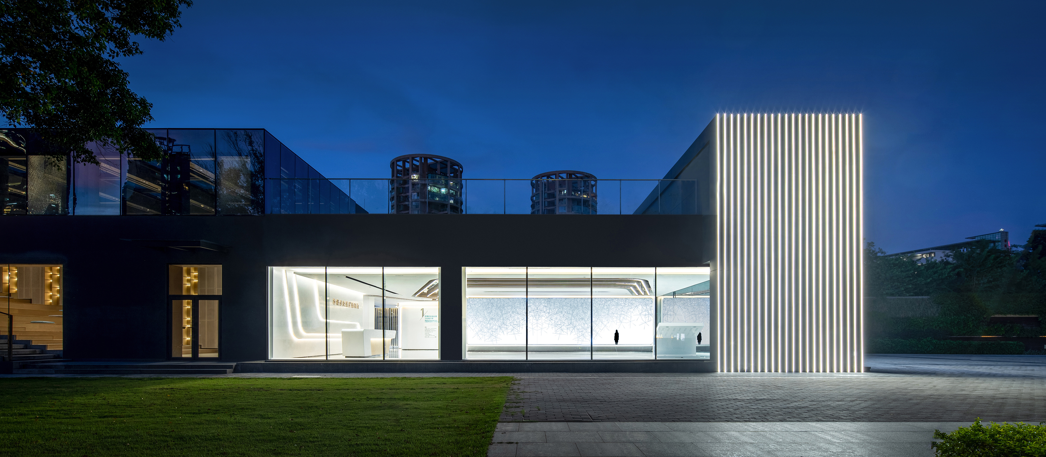 将原有建筑拆解、重构,将若干个盒子连接构成建筑主体,完成了部分区域由室外转化为室内空间的过程,盒子的相互连接最终将原建筑散落的碎片式空间融合为统一、整体的展示性室内空间。重构后的建筑主体宛若发光的盒子,在暮色中微微发光。