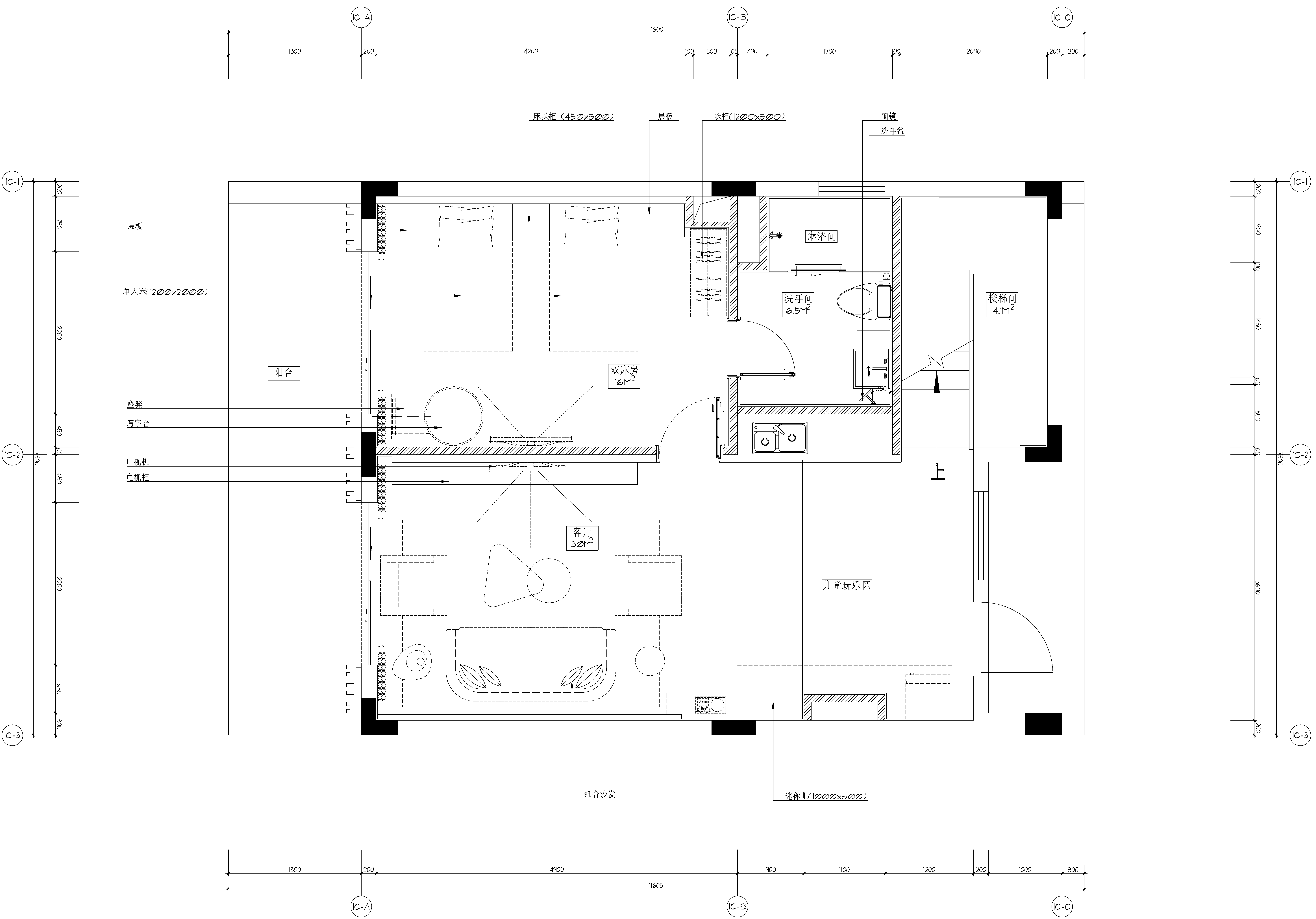 中间最为开阔的活动区域没有实体的界限,是一个向两侧延伸的空间,和会客区相接处,一组灵活可变的门加强了空间变化的可能,当空间全部打开的时刻,置身其中,房子也更好得融入自然。我们用最为温和的板材和山中的质感匹配、平衡,让居室内的体块营造出有趣的形态,形成空间特有的设计语言。