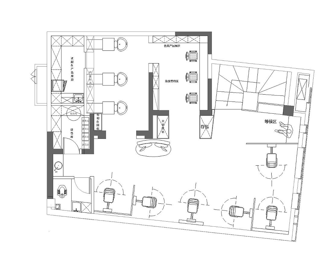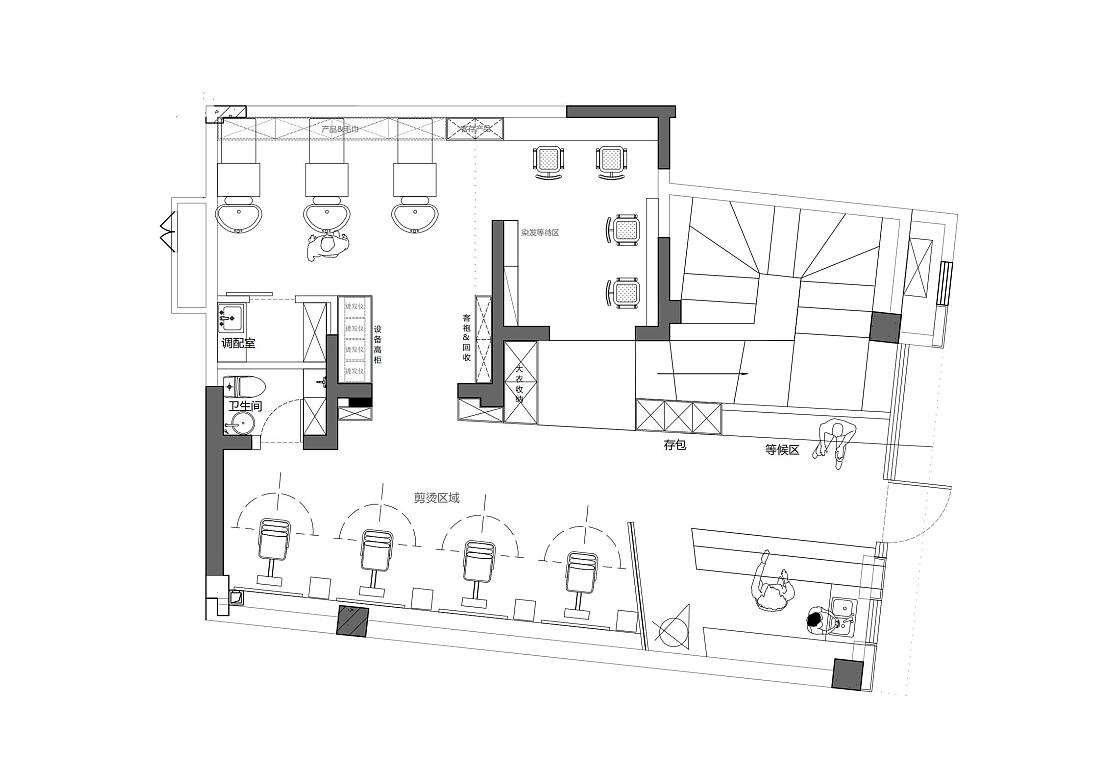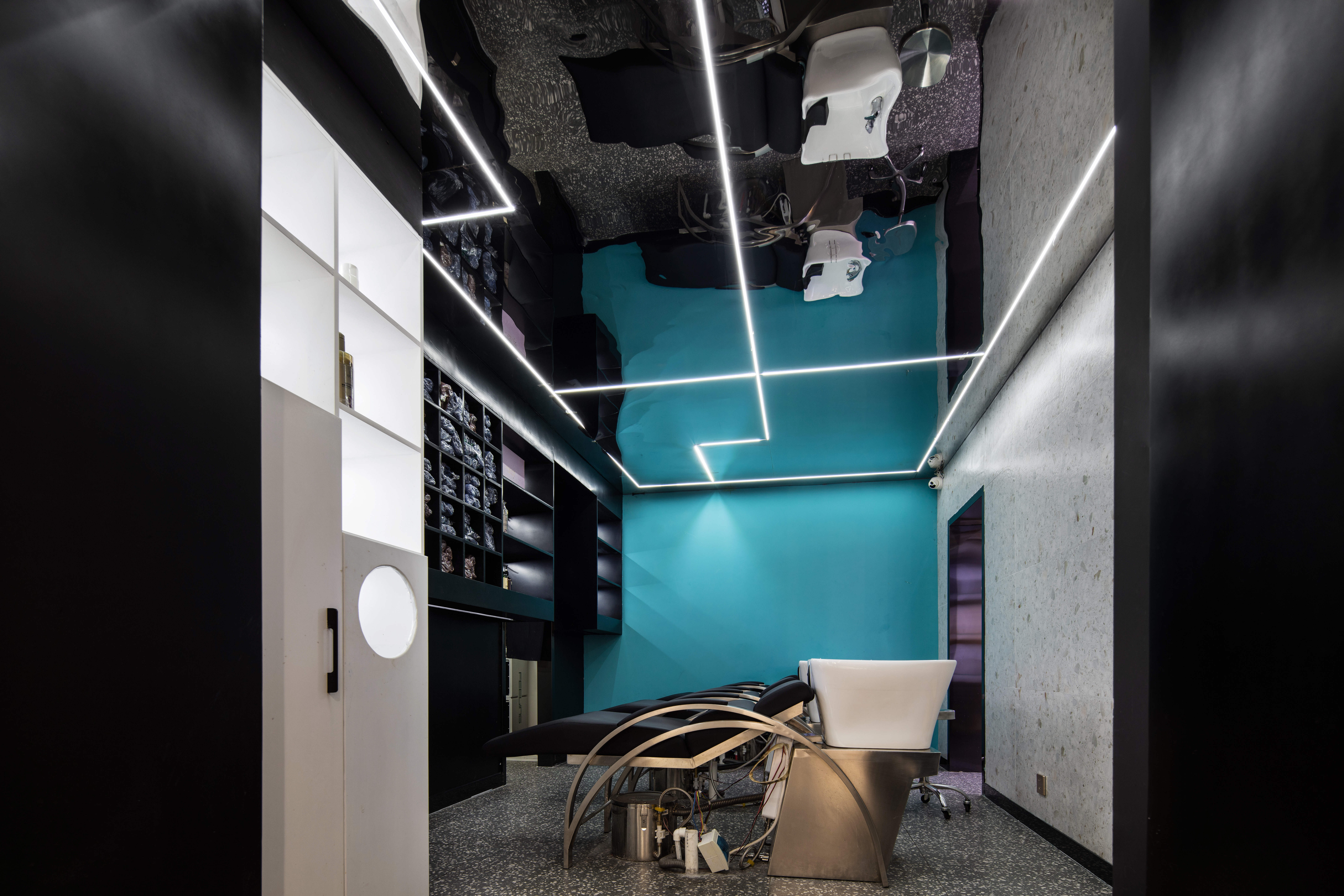 空间布局:在空间功能划分上,我们把剪发和烫染的位置区分开,做了两个独立的空间使用。这样每个工作位的操作距离就能更好的控制,从而在可以最大程度上增加剪烫工位。同时,相对封闭的烫染区域,也让后期顾客在里面可以有更加安静舒适的体验感受。