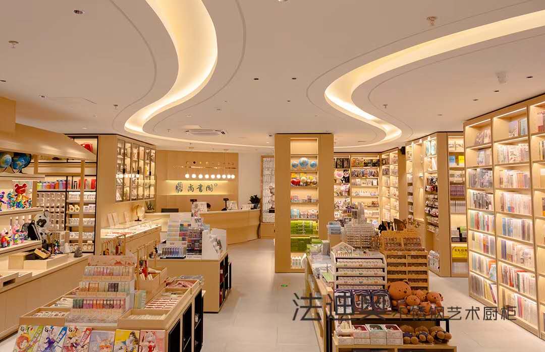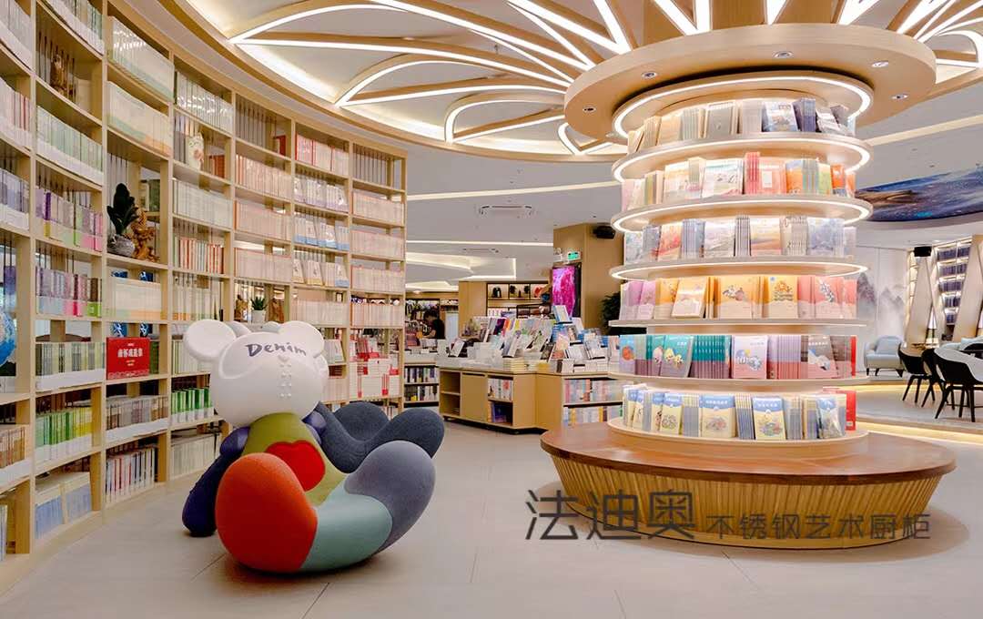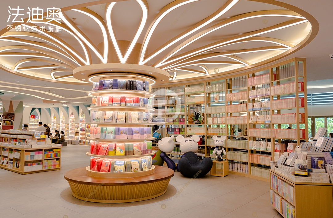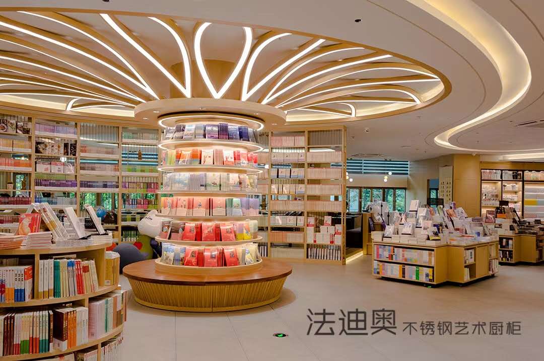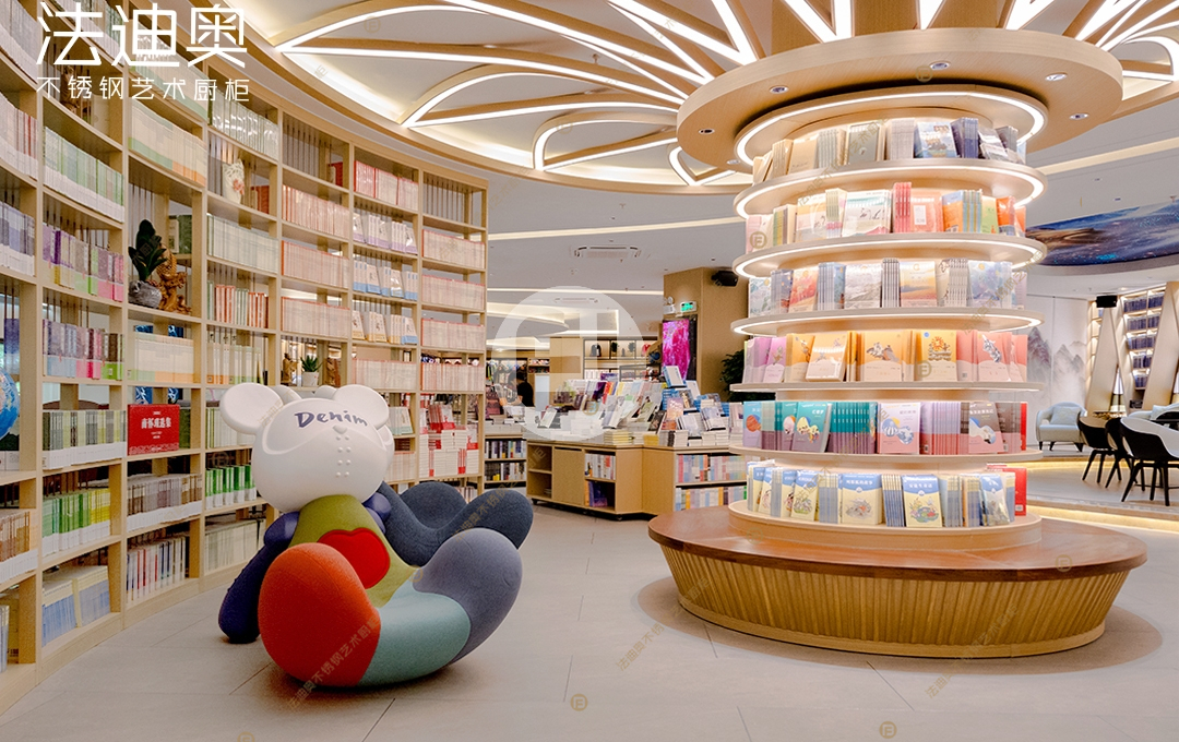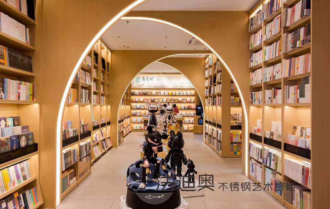从地面一直延伸到天花的不锈钢金色木纹书架,弧形小半面屏风嵌入了明亮的灯带,一眼望去如同时光隧道。