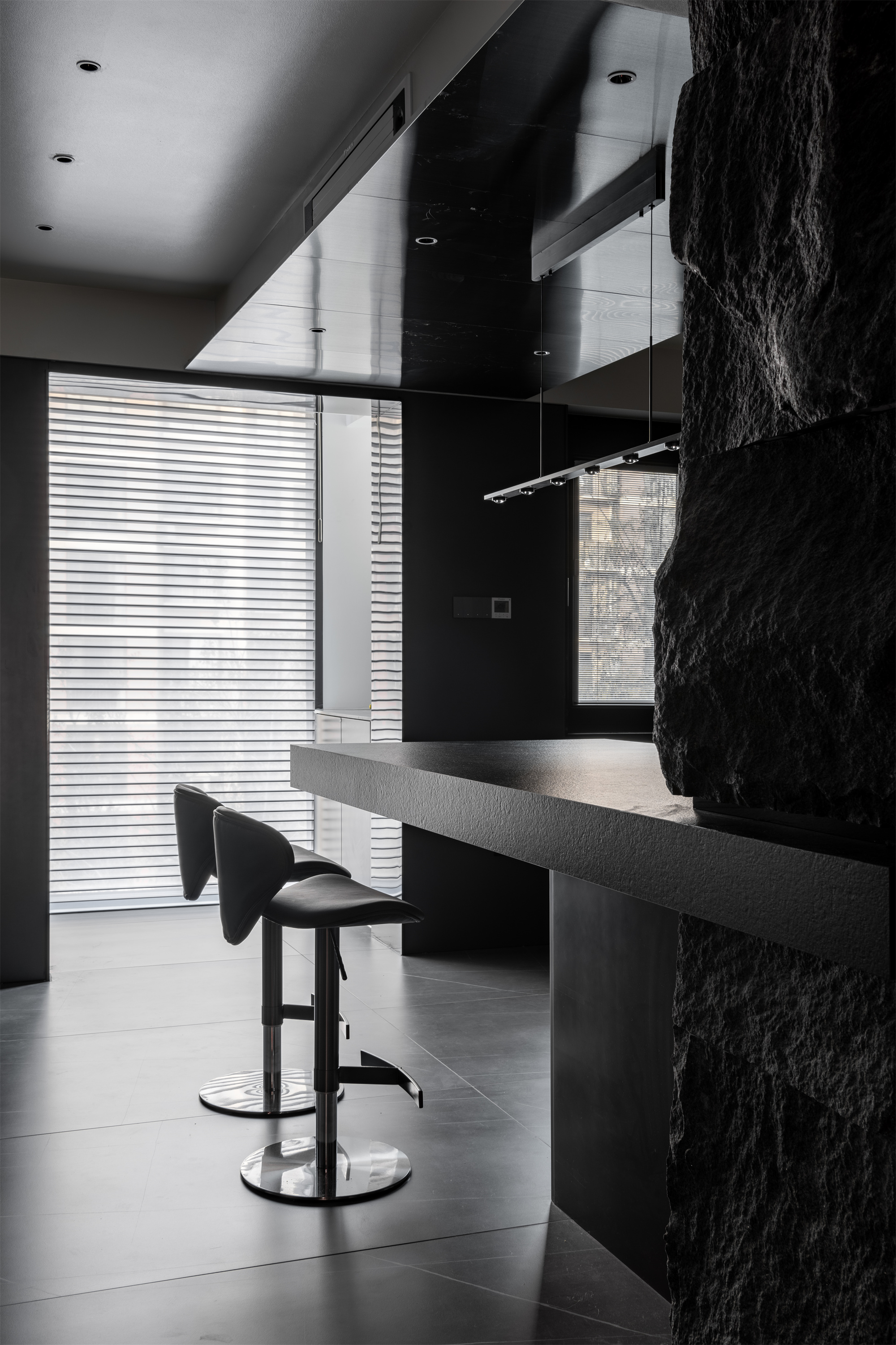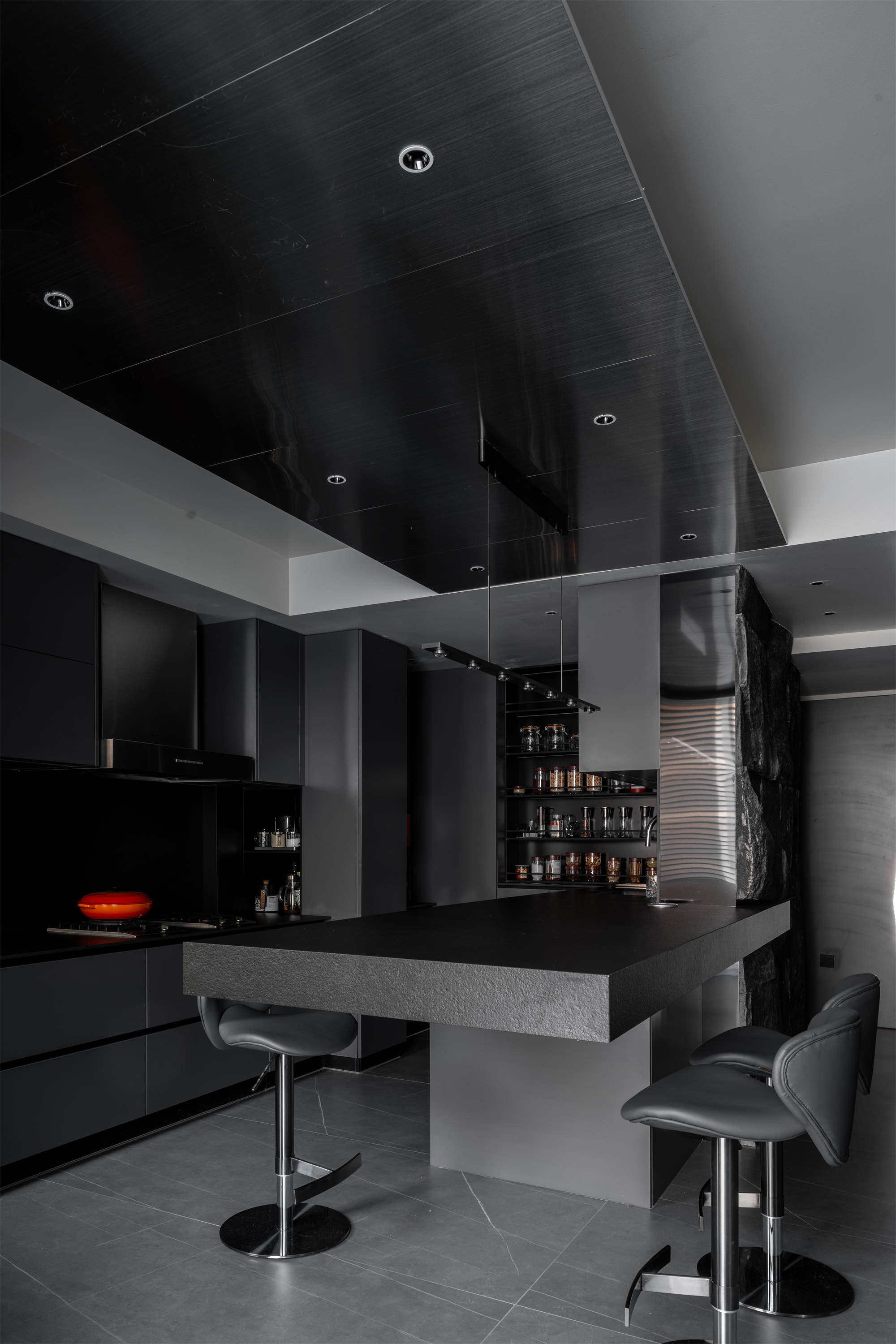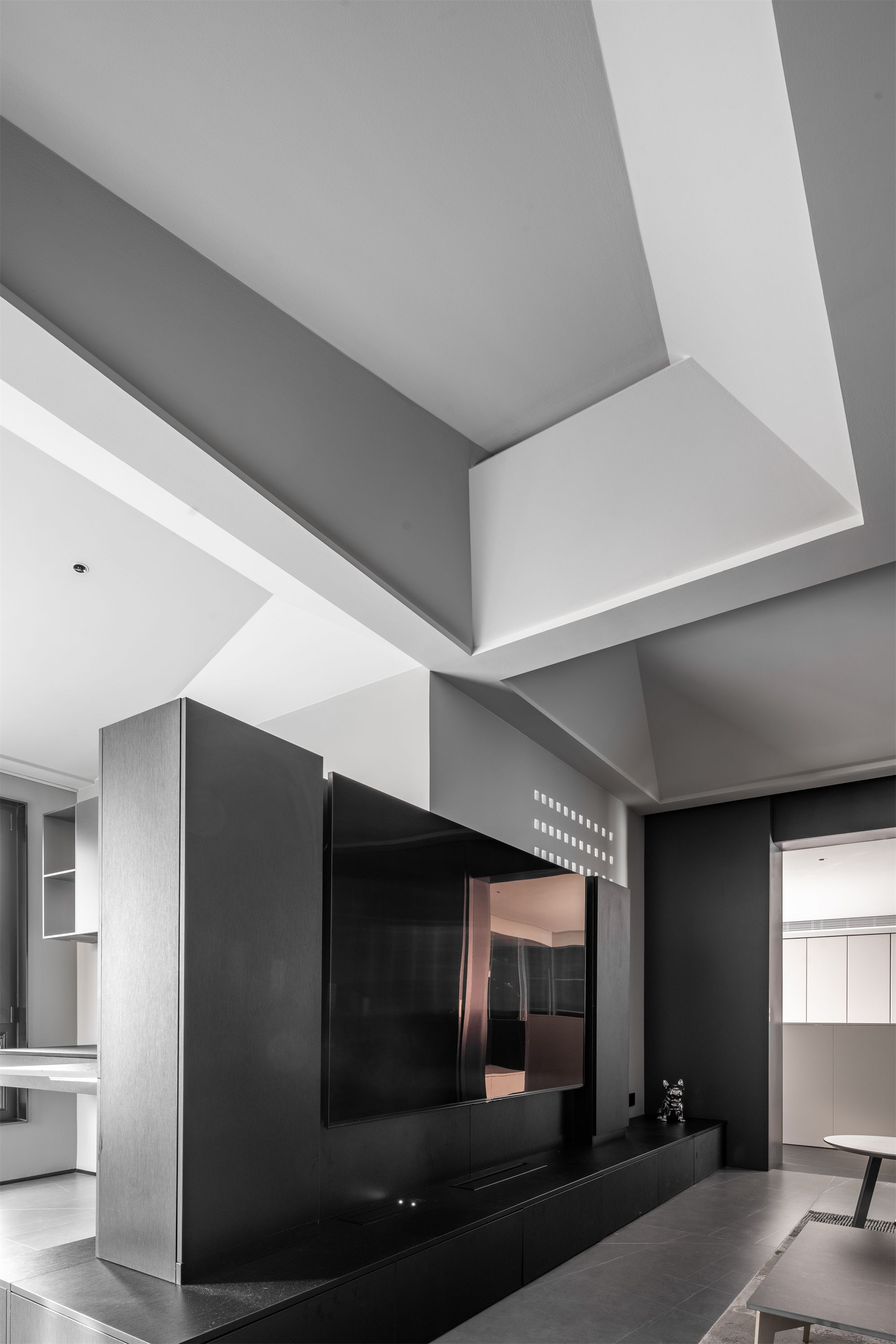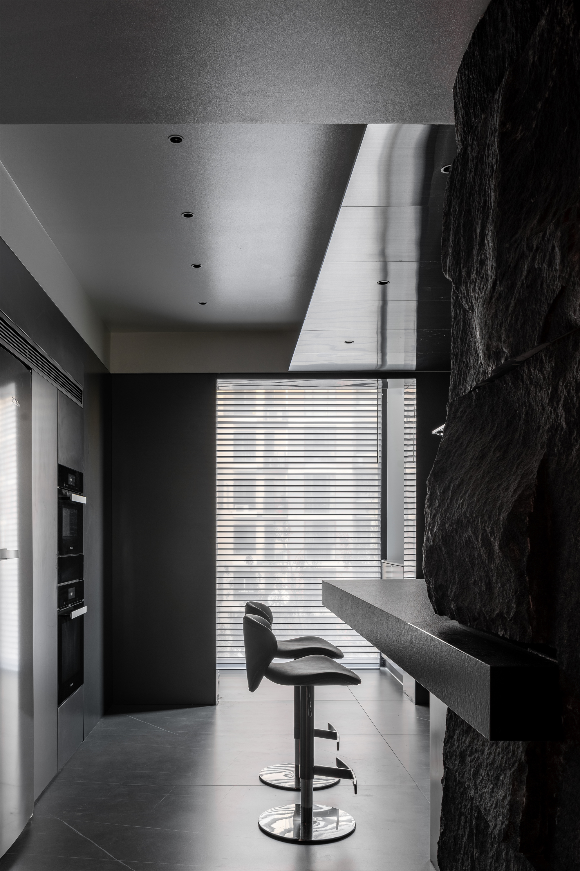 整体空间的材料使用更偏向于空间变化而改变。但在同一的调子内产生不同的气质。整体公共空间采用灰色岩板作为地面铺装。卧室则改变为实木地板增加卧室通过中的舒适度。墙面各区域分别由石材不锈钢木墙板墙漆组成。卧室则出现了软包壁布增加卧室的温润度。顶面部分平顶墙漆的极简手法放松了普通住宅层高的压抑感。起居室顶部才有极具视觉变化的不规则斜面吊顶通过墙漆折射不同光影。西厨不锈钢顶面增加反射减少层高压抑包裹空调设备。