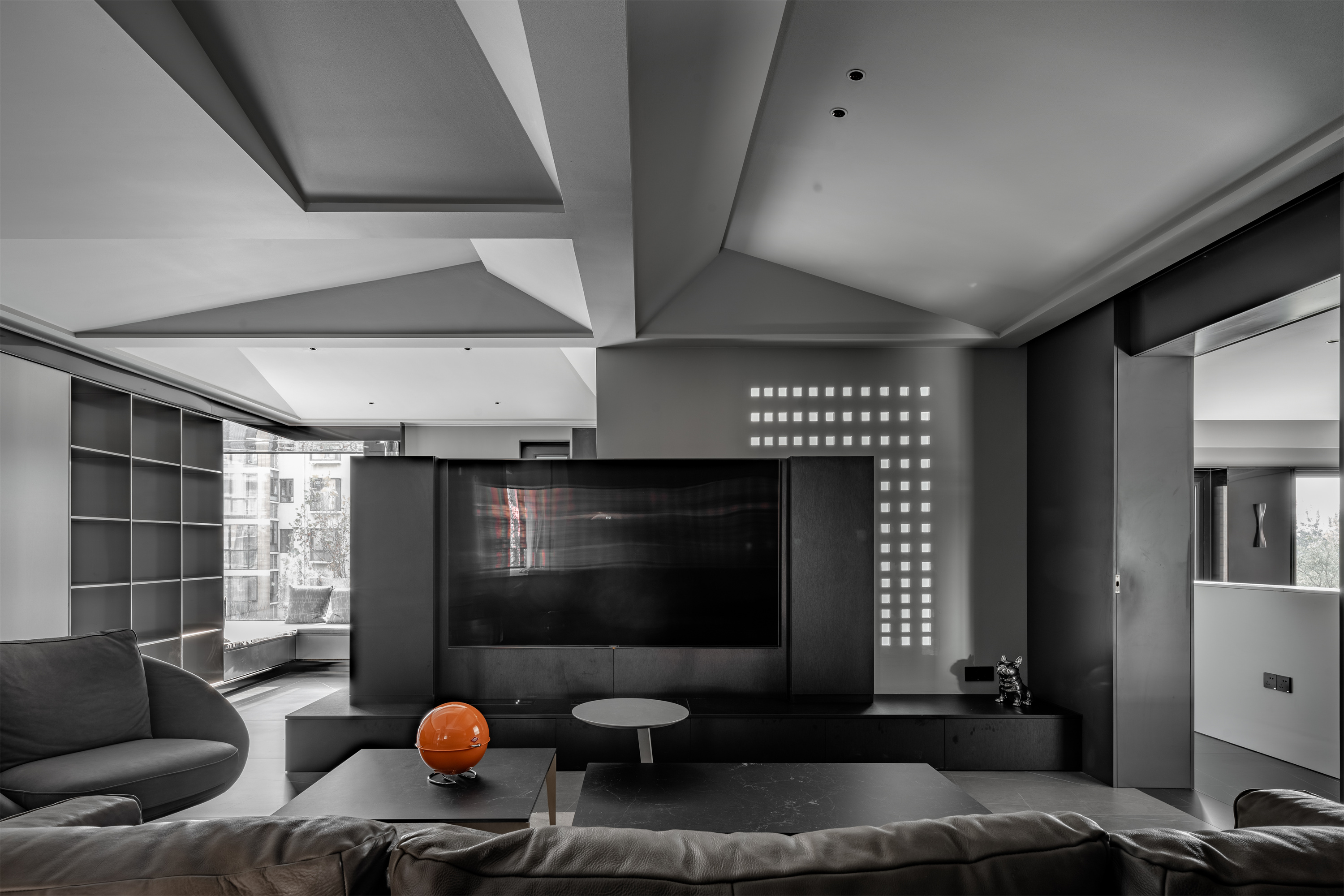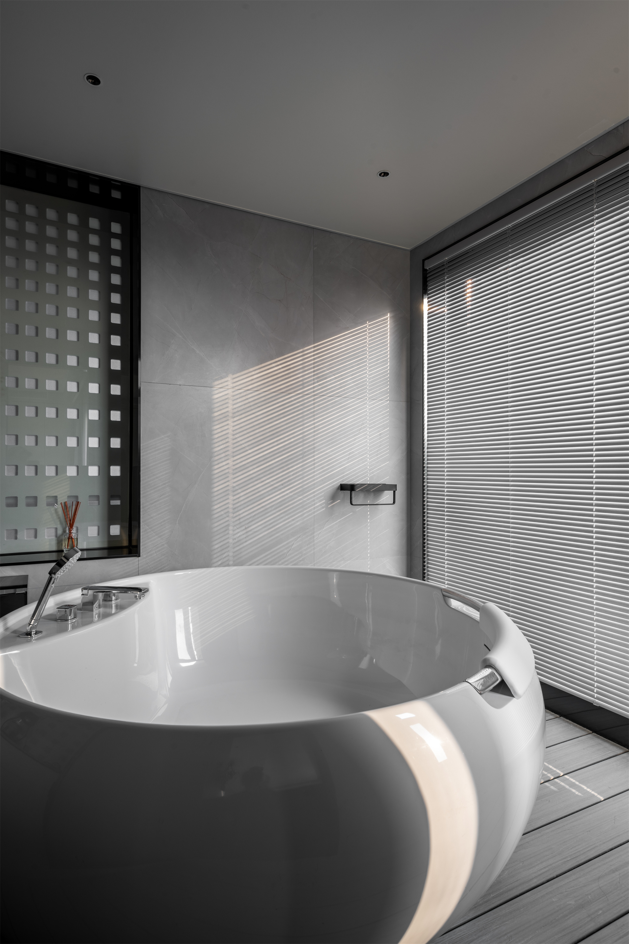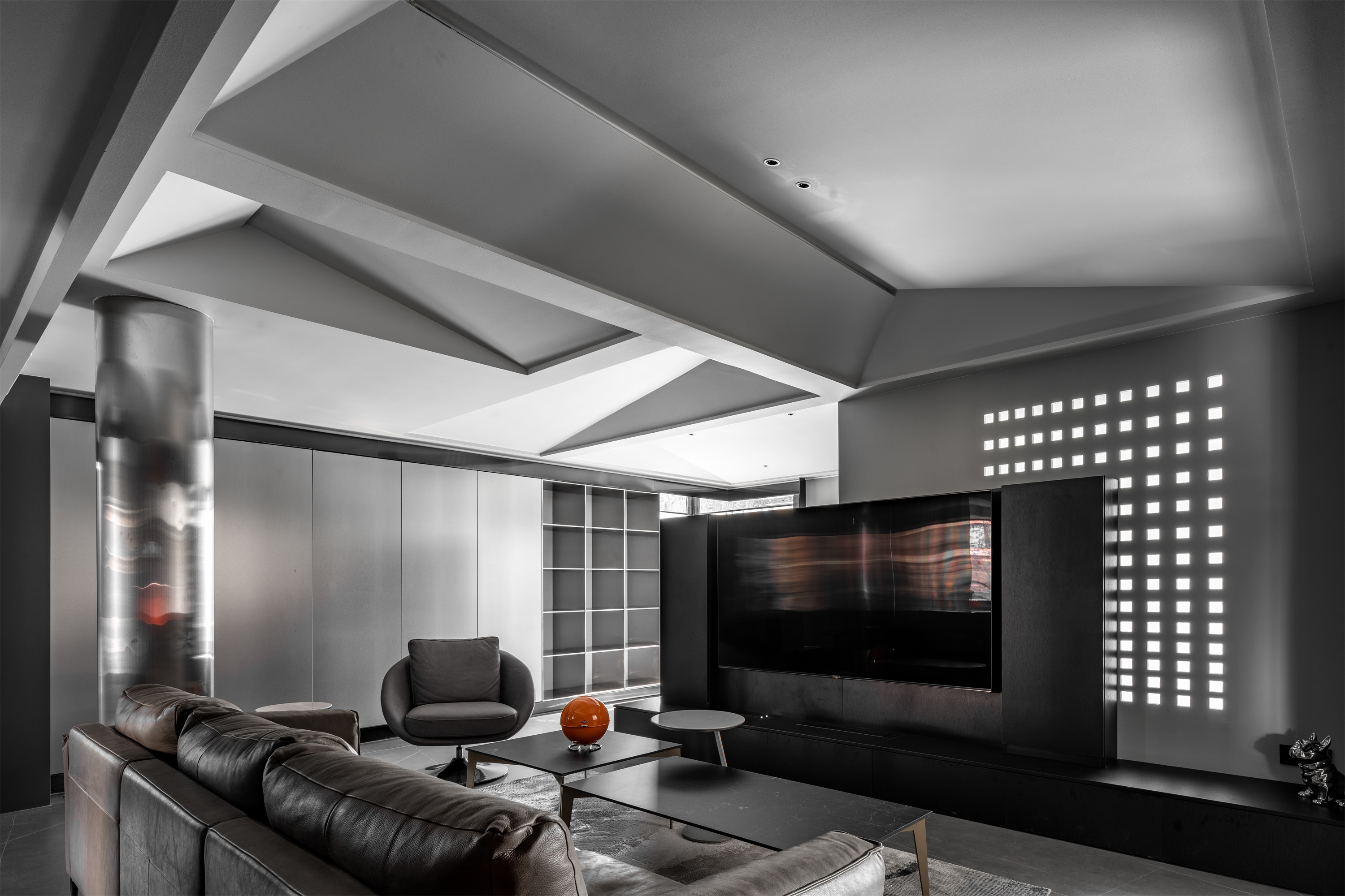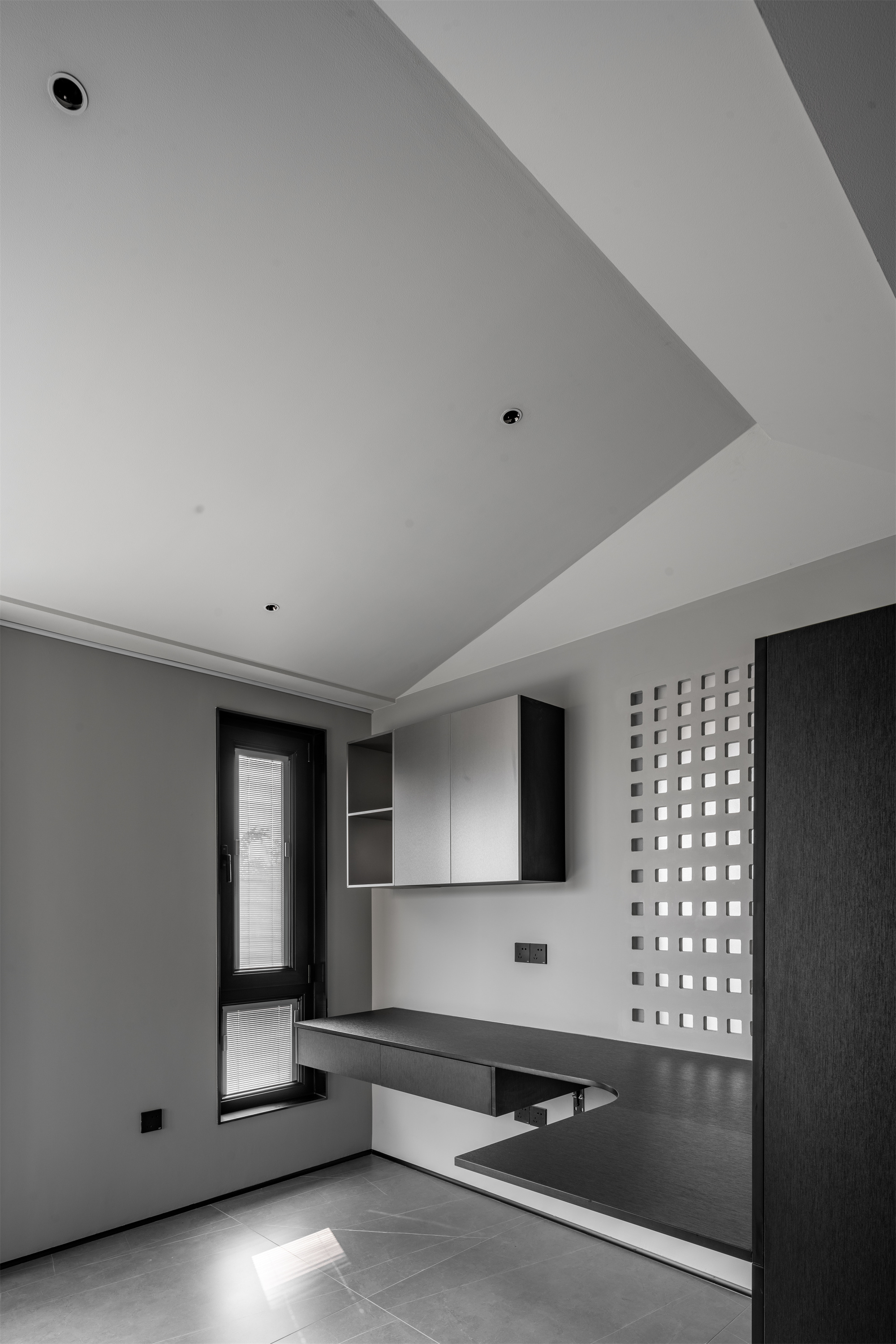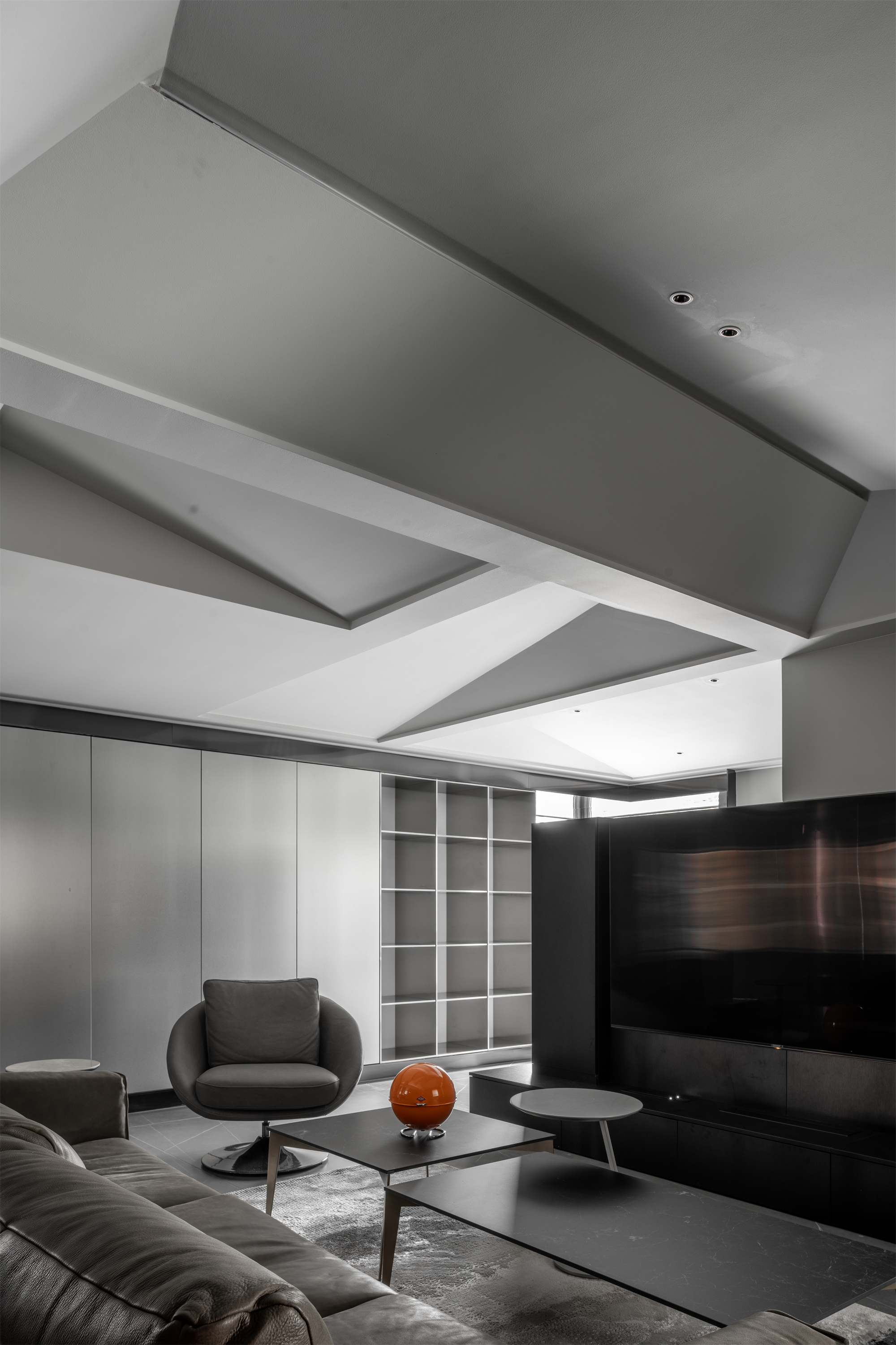 整体空间的材料使用更偏向于空间变化而改变。但在同一的调子内产生不同的气质。整体公共空间采用灰色岩板作为地面铺装。卧室则改变为实木地板增加卧室通过中的舒适度。墙面各区域分别由石材不锈钢木墙板墙漆组成。卧室则出现了软包壁布增加卧室的温润度。顶面部分平顶墙漆的极简手法放松了普通住宅层高的压抑感。起居室顶部才有极具视觉变化的不规则斜面吊顶通过墙漆折射不同光影。西厨不锈钢顶面增加反射减少层高压抑包裹空调设备。