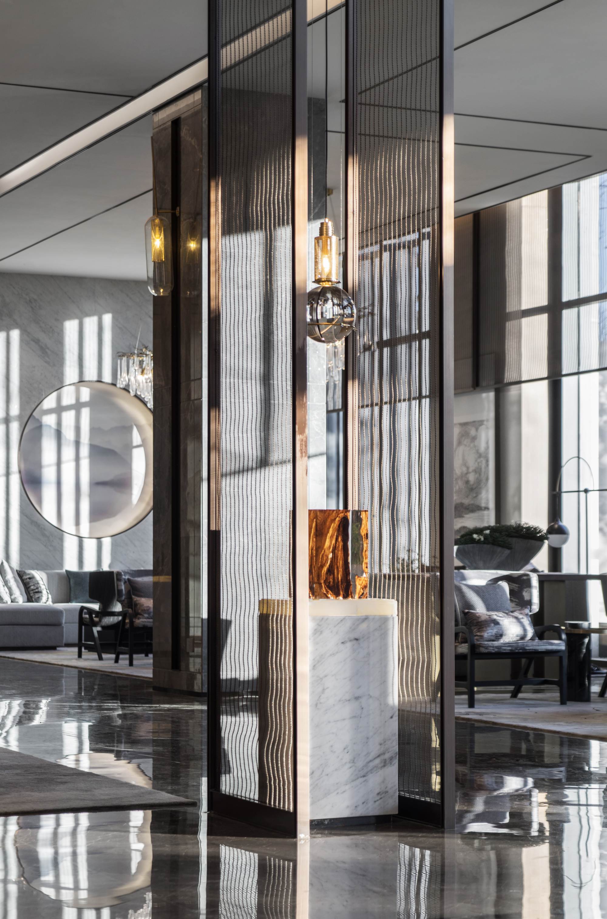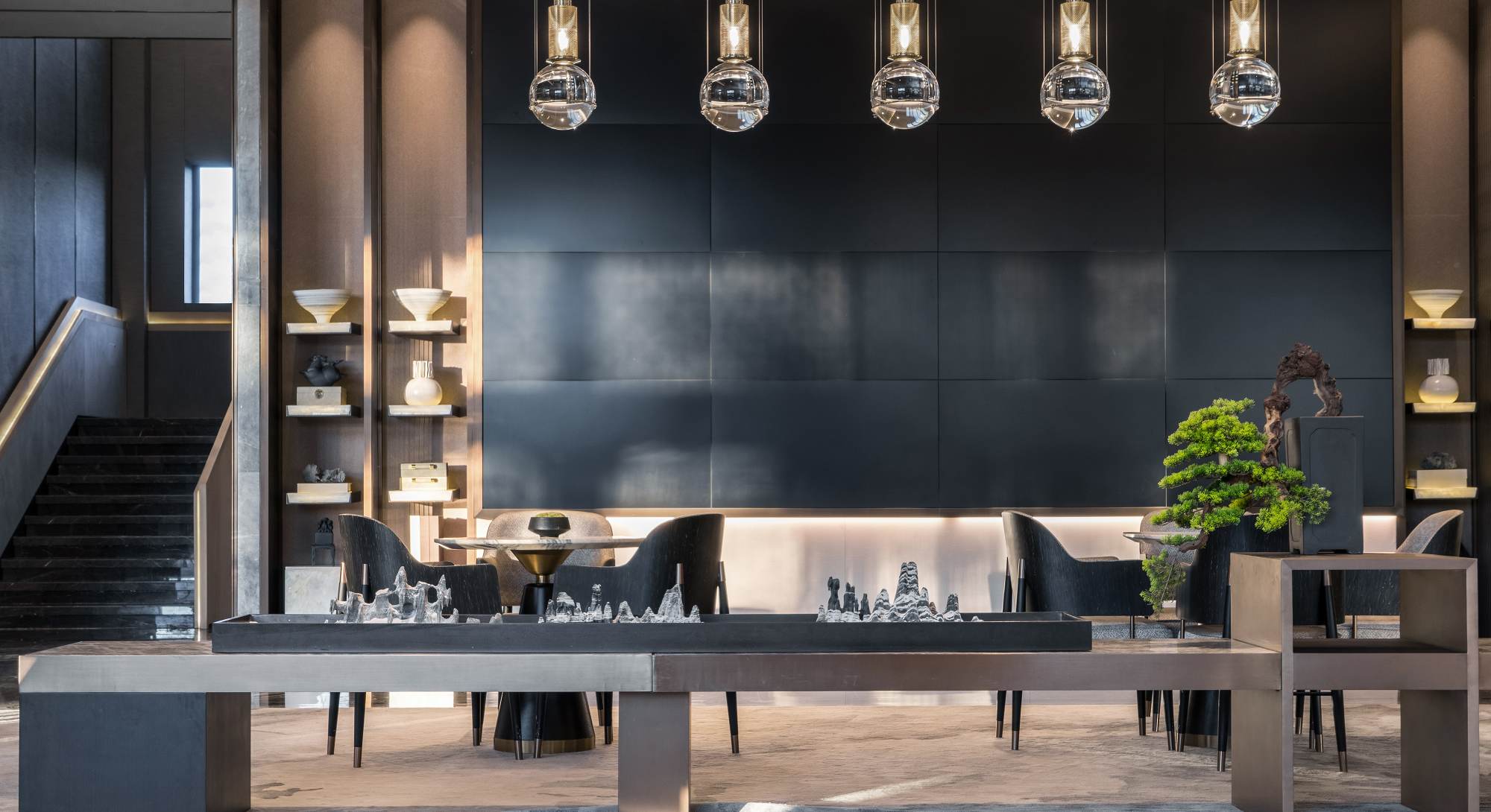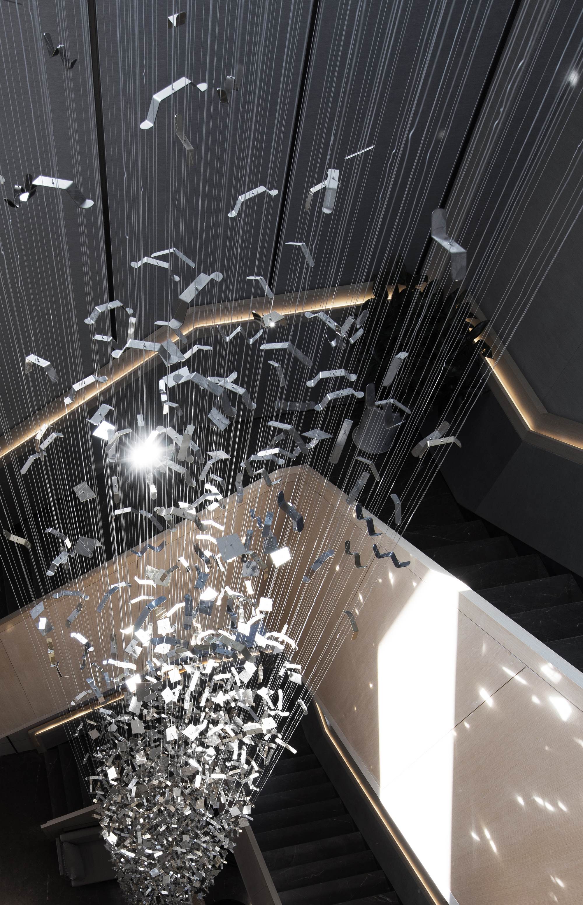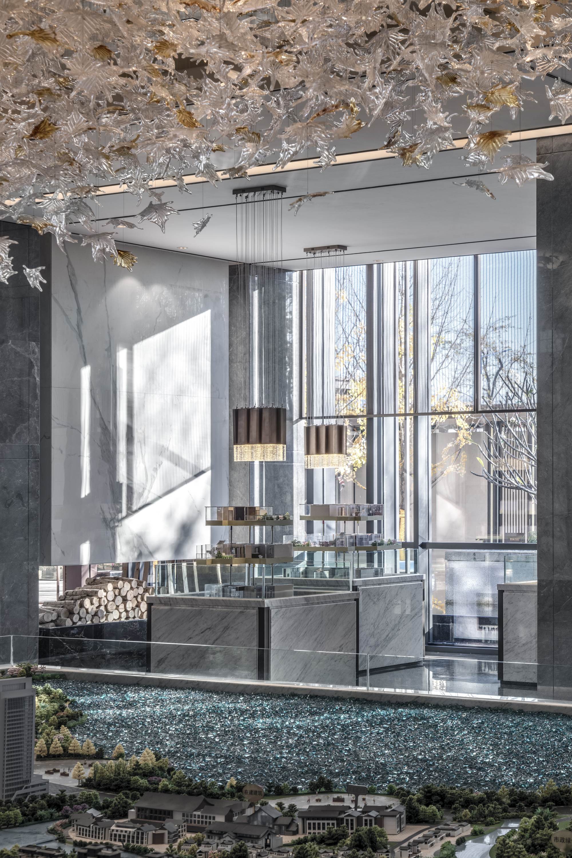 空间布局:沙盘区倾泻而下的水晶艺术装置吊灯,仿佛一阵骤雨,以疏密勾勒出参差嵯峨的山之形影。顺着“雨水”而下,是散发的光影。素雅颜色统合的空间,在光影下,似有古雅澹泊的境界。简单直叙的设计于简约中尽处悠悠情味。过渡区域的材质碰撞,将仪式感做到极致,实与虚的对弈在木头与屏风之间展开,界限模糊且被拉长,每一个空间点都似乎在传递一些书本里的章节。零星散布的洽谈区域,划分了各自的小空间,有出人意料的视觉障碍。满足使用者洽谈中保留私密性