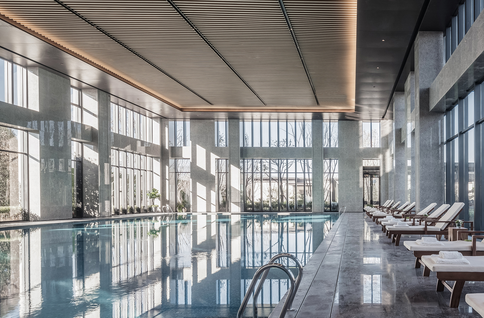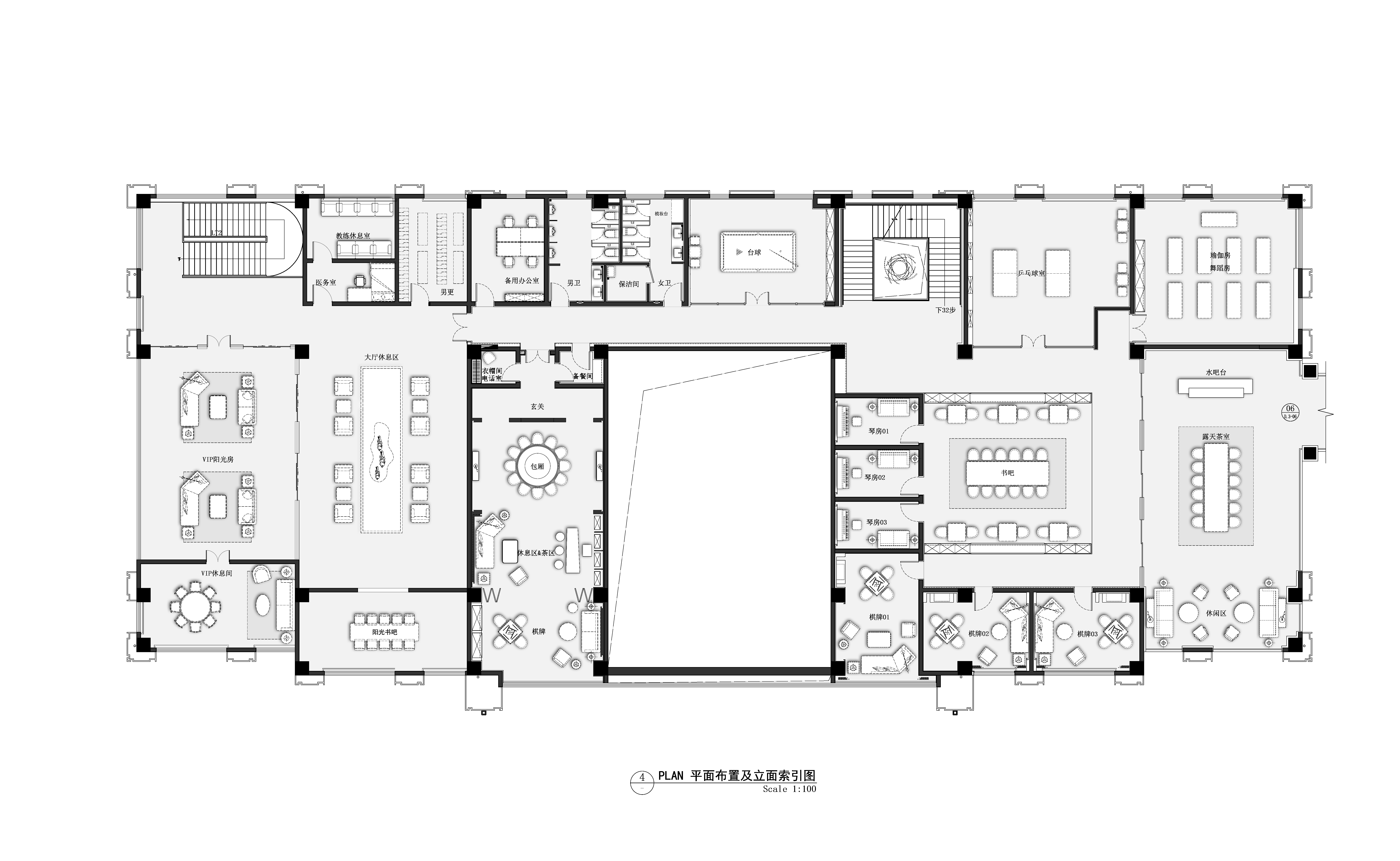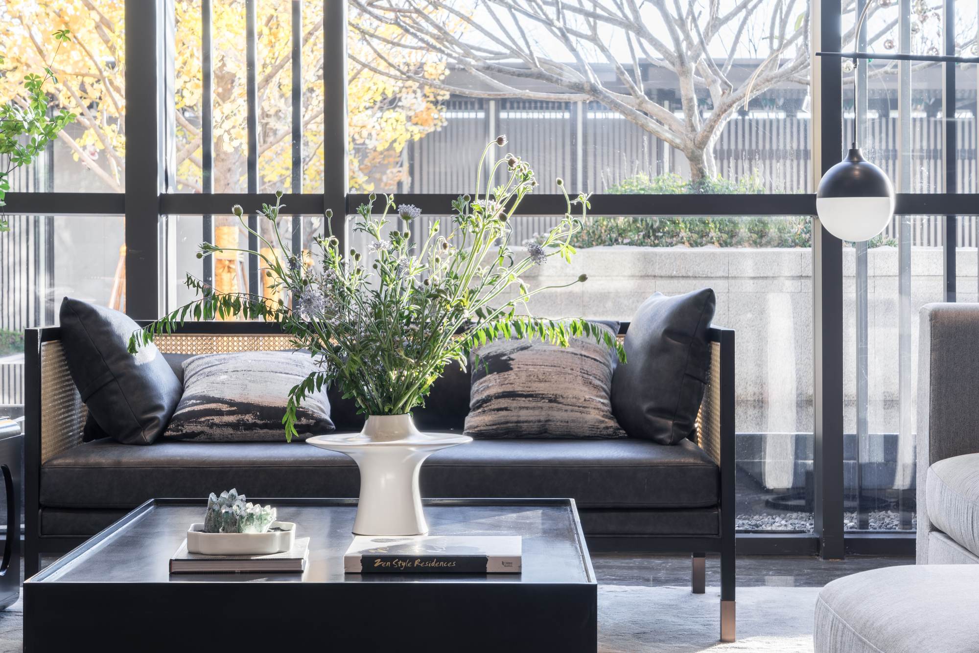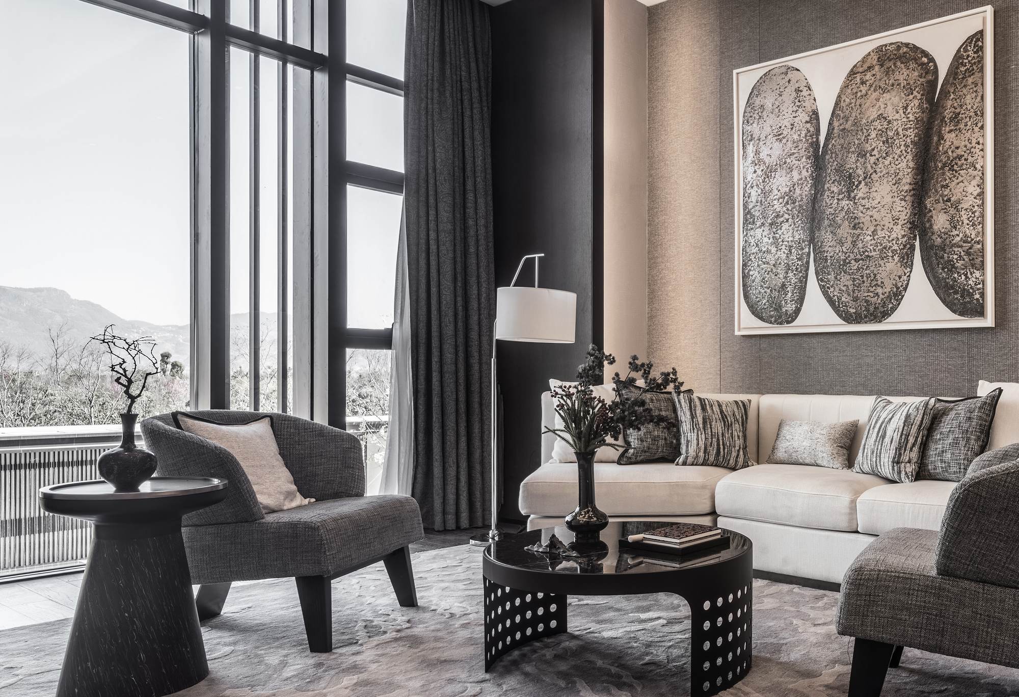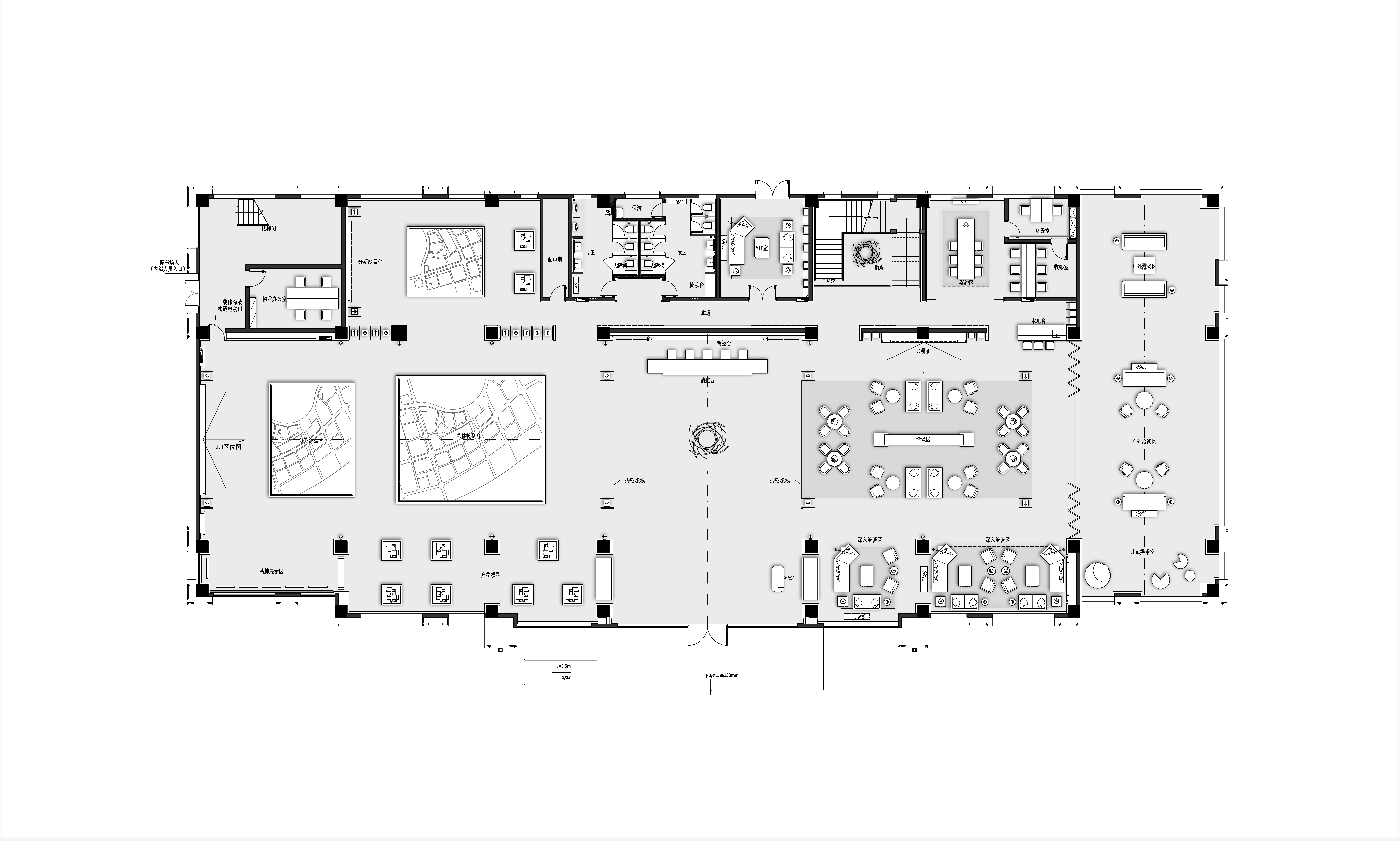 空间布局:沙盘区倾泻而下的水晶艺术装置吊灯,仿佛一阵骤雨,以疏密勾勒出参差嵯峨的山之形影。顺着“雨水”而下,是散发的光影。素雅颜色统合的空间,在光影下,似有古雅澹泊的境界。简单直叙的设计于简约中尽处悠悠情味。过渡区域的材质碰撞,将仪式感做到极致,实与虚的对弈在木头与屏风之间展开,界限模糊且被拉长,每一个空间点都似乎在传递一些书本里的章节。零星散布的洽谈区域,划分了各自的小空间,有出人意料的视觉障碍。满足使用者洽谈中保留私密性