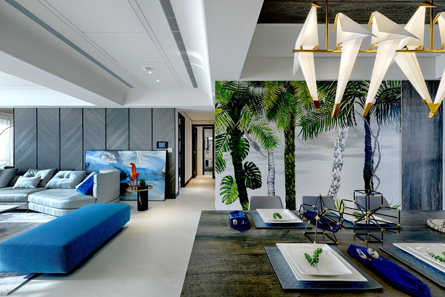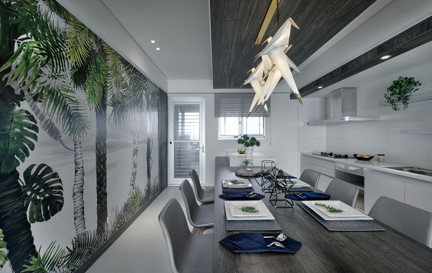 设计选材:有了光譜便有了色彩,客餐廳沐浴自然光下,以白灰面鋪底,綠色叢林壁紙、海洋色、木質色有序穿插,石材、木質的厚實穩重與布飾的輕軟柔調,砌築出的緩緩悠閒風氣,自在安適一如候鳥棲息地,如森林感覆圍的居家。