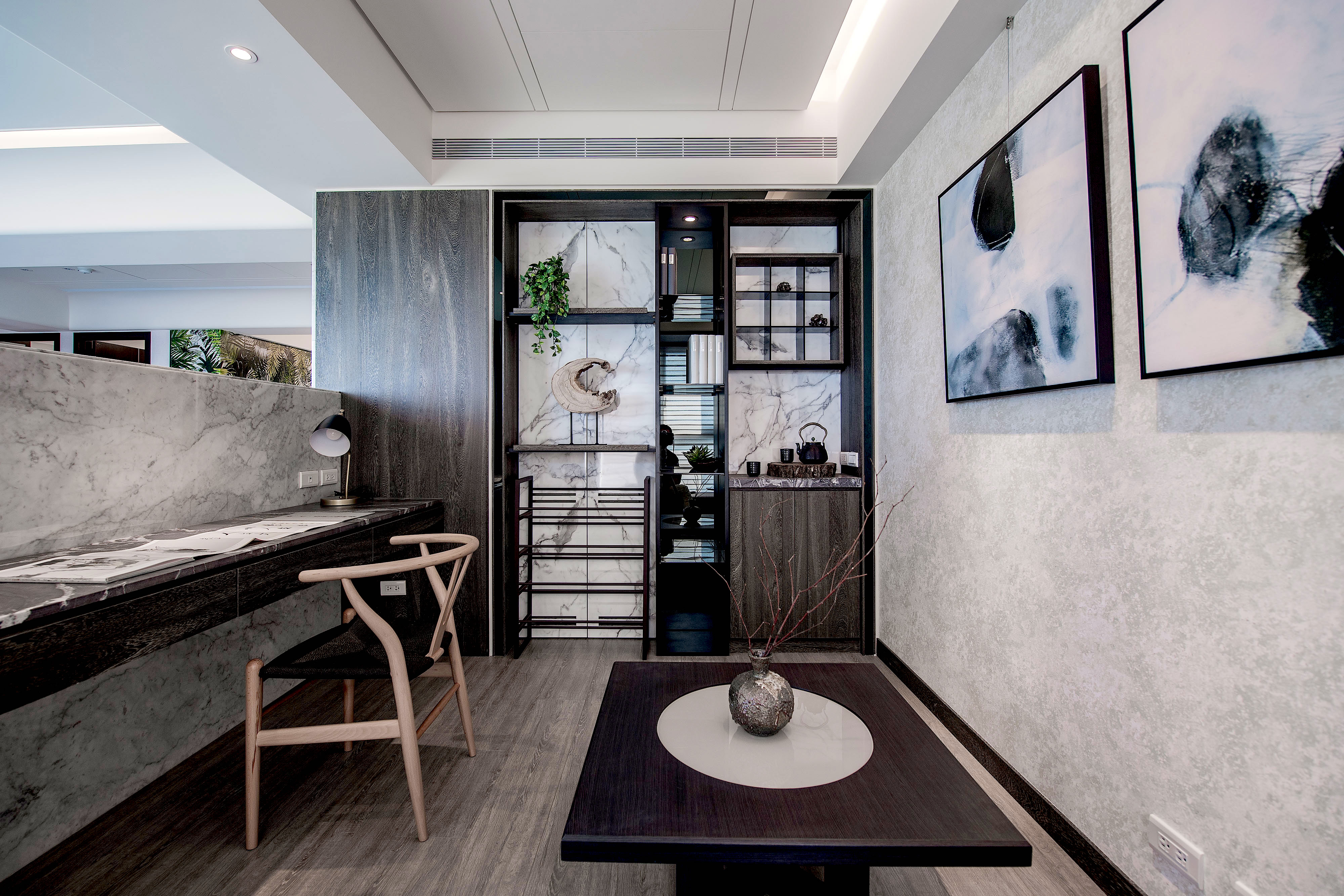 主牆沿續公領域的石紋牆體,為場域沁入冰涼觸感,並藉由層架的高低位置,漸進規劃出一體的置物及梳化檯。