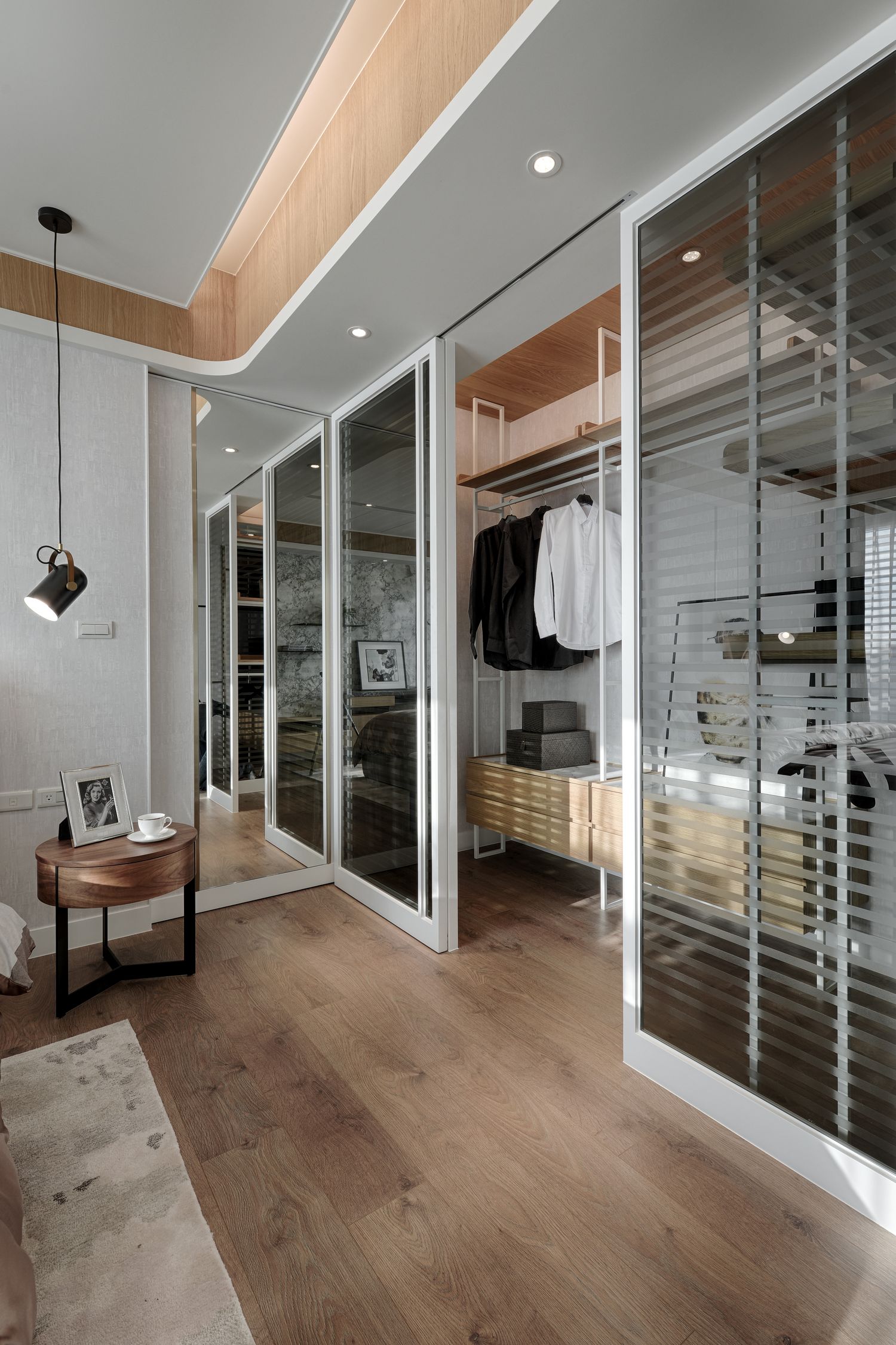 天花板以圓弧型收束,內覆木皮,開放式鏤空更衣間亦將臥房穿透、延展。