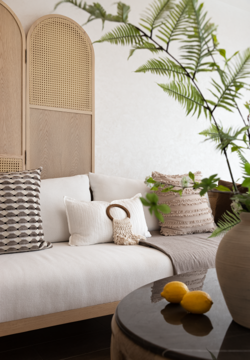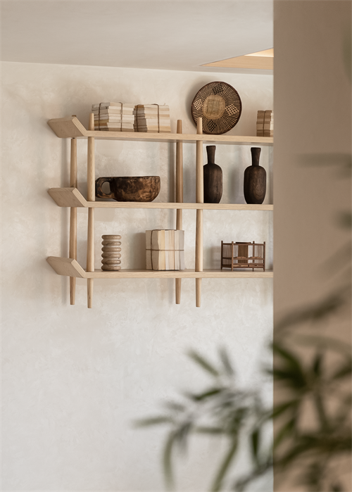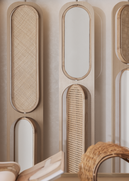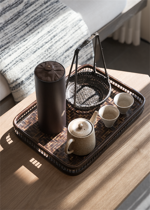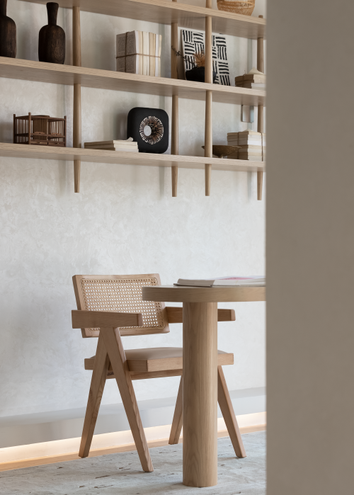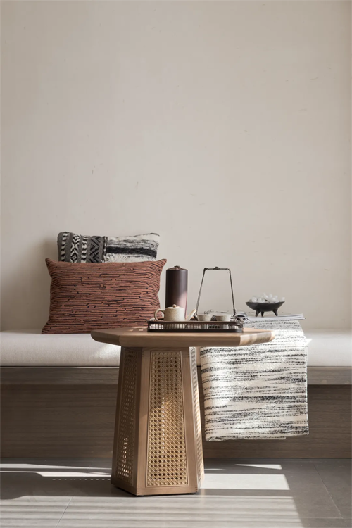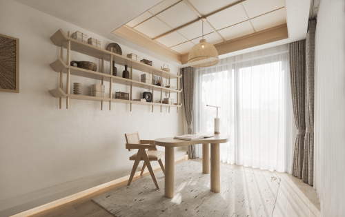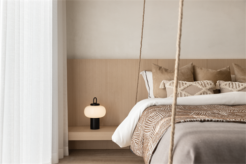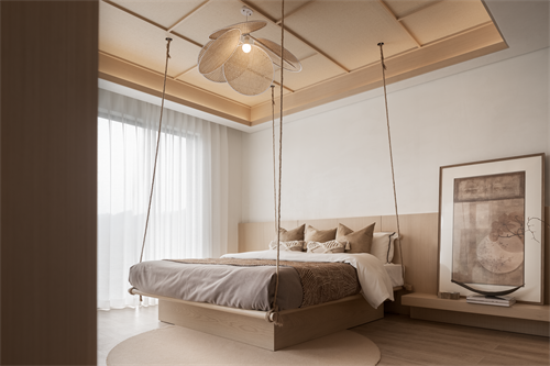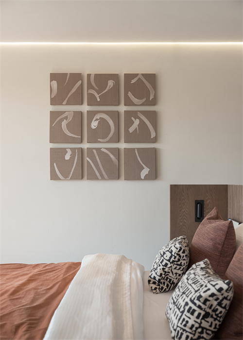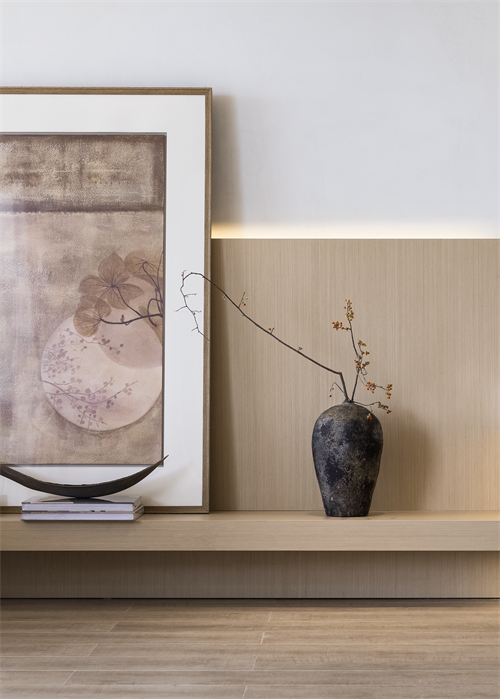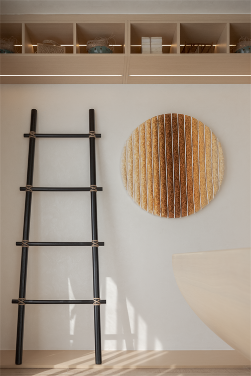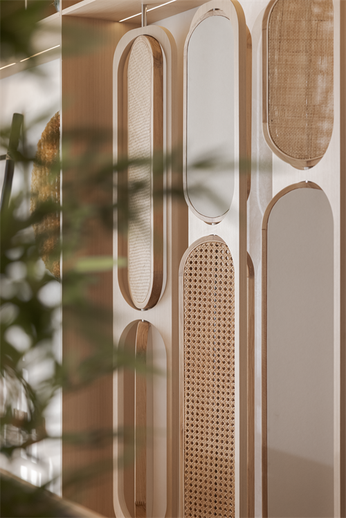 清爽自然的底色让空间拥有足够的包容度,去容纳居住者更多的精神需求。本真朴实墙面旋转屏风,结合竹艺编织手法,让简约质朴的设计中衍生出诗意的灵魂。