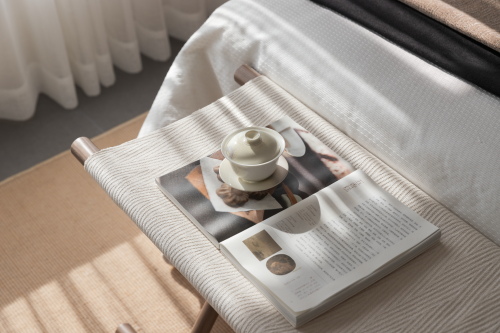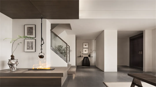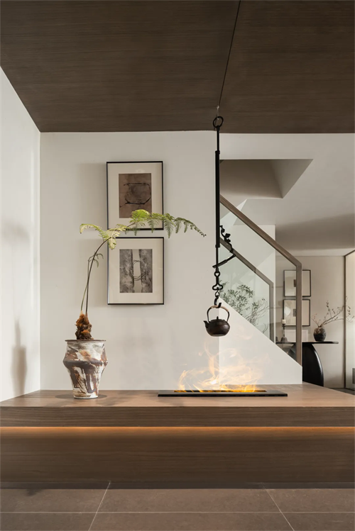 方寸之间,唯有茗香。以茶会友是此处设计的焦点,从触觉、嗅觉、视觉及听觉上引领人们去感受茶道四谛之和。楼梯台阶处的壁炉及悬空水壶,体现烹煮之意,茶香层层,景色旖旎,乐不思归。