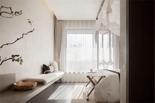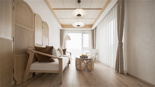 设计通过对竹林艺术自然氛围的营造,带来如沐清风的舒展惬意。空间材料取自棉麻布艺、藤编元素,在柔和的色彩下,这些所能看到的与自然亲密接触的细节,联袂铺陈出了一个远离城市嘈杂,聆听自然呼吸的质朴居所。