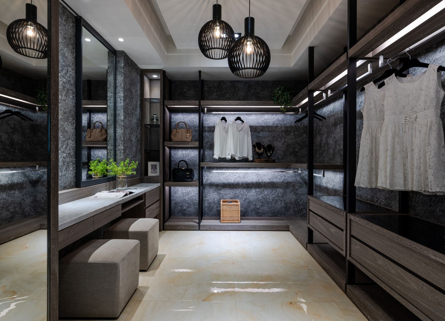 更衣室內深淺有致的質材紋理,為梳整裝束的時光更添情境氛圍。