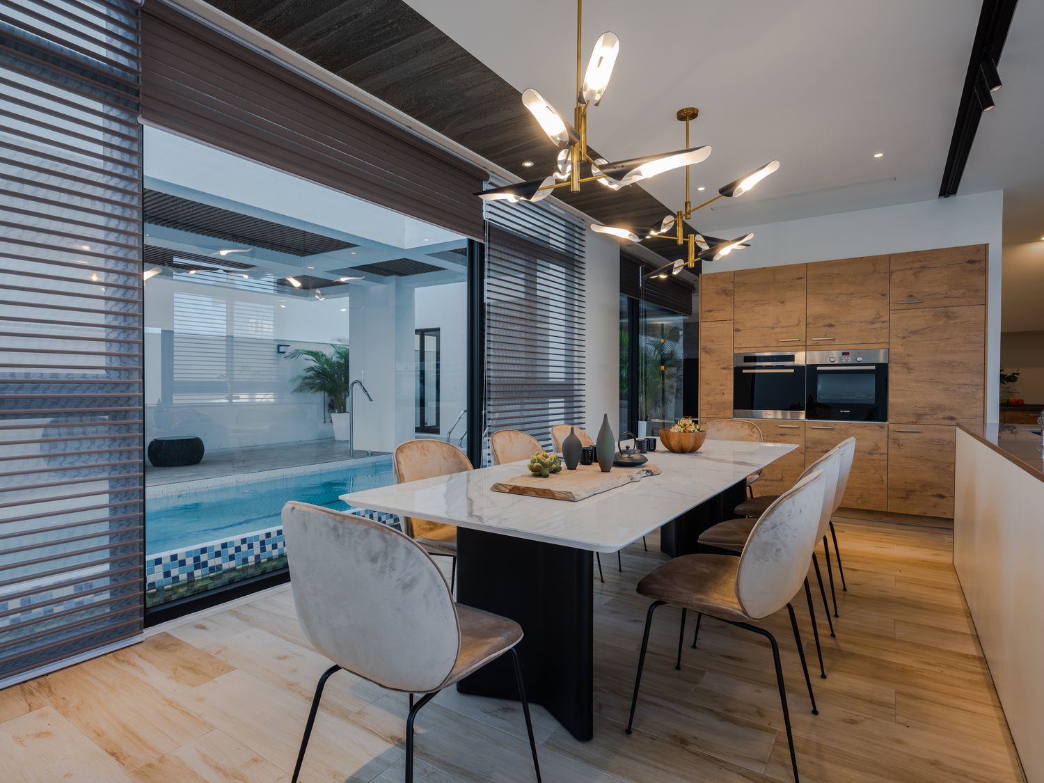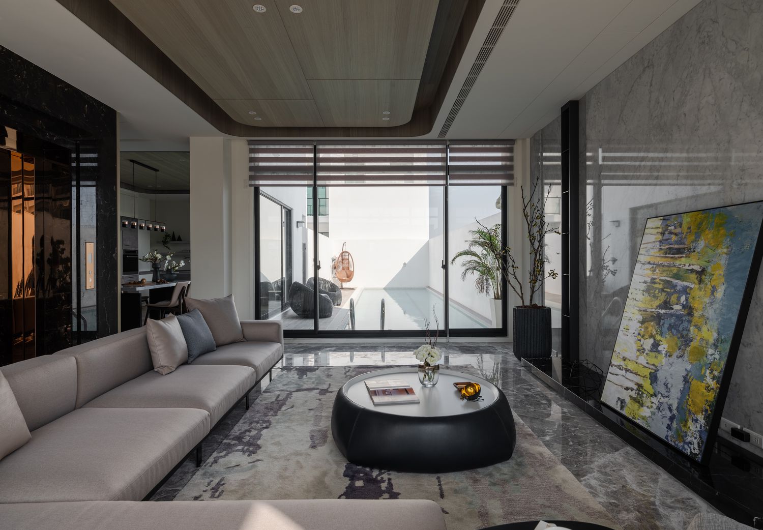 起居空間成為場域發散的中心,既可搭電梯垂直通往各樓層臥房,亦可前往臨側的戶外泳池及餐廚區域休憩,讓快速的工作節奏在回到家之後能夠隨即放慢腳步,自在悠遊於廣闊屋舍中。