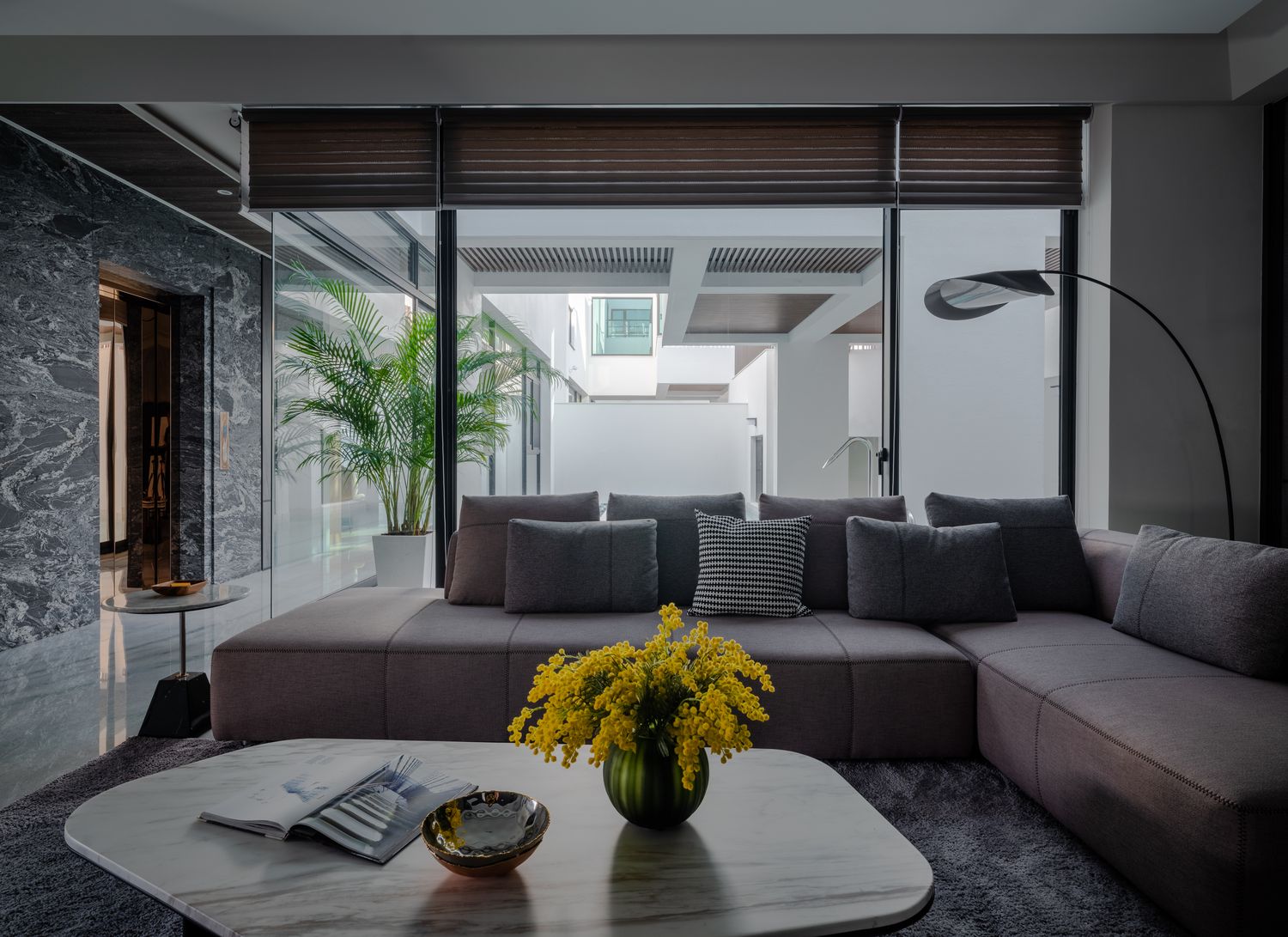 開敞的落地窗迎入飽滿日光,使室內質樸的灰白色階逐一浮現細部紋理。