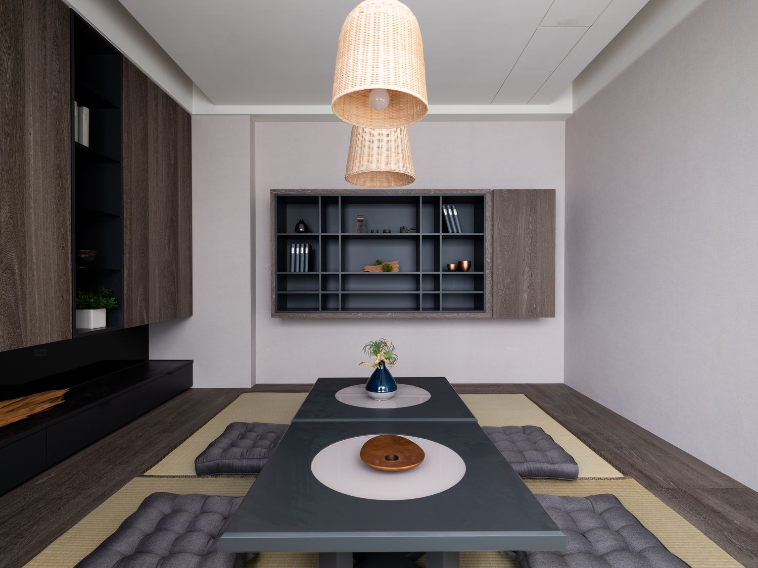 茶室以沉靜褐色木質與墨色質材作為空間主題,貫穿地坪與懸空櫃體,為方寸場域穩住重心,卻不減其中的輕盈通透;而壁櫃亦能大舉收儲什物,將煩瑣日常收束於簡潔線條之後。