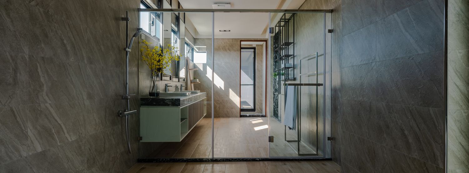 狹長型的衛浴空間承襲公領域的自然語彙,轉化原先的區域限制,於面光側設置一排齊整窗扇使空間洞開,為家居別開豁景。