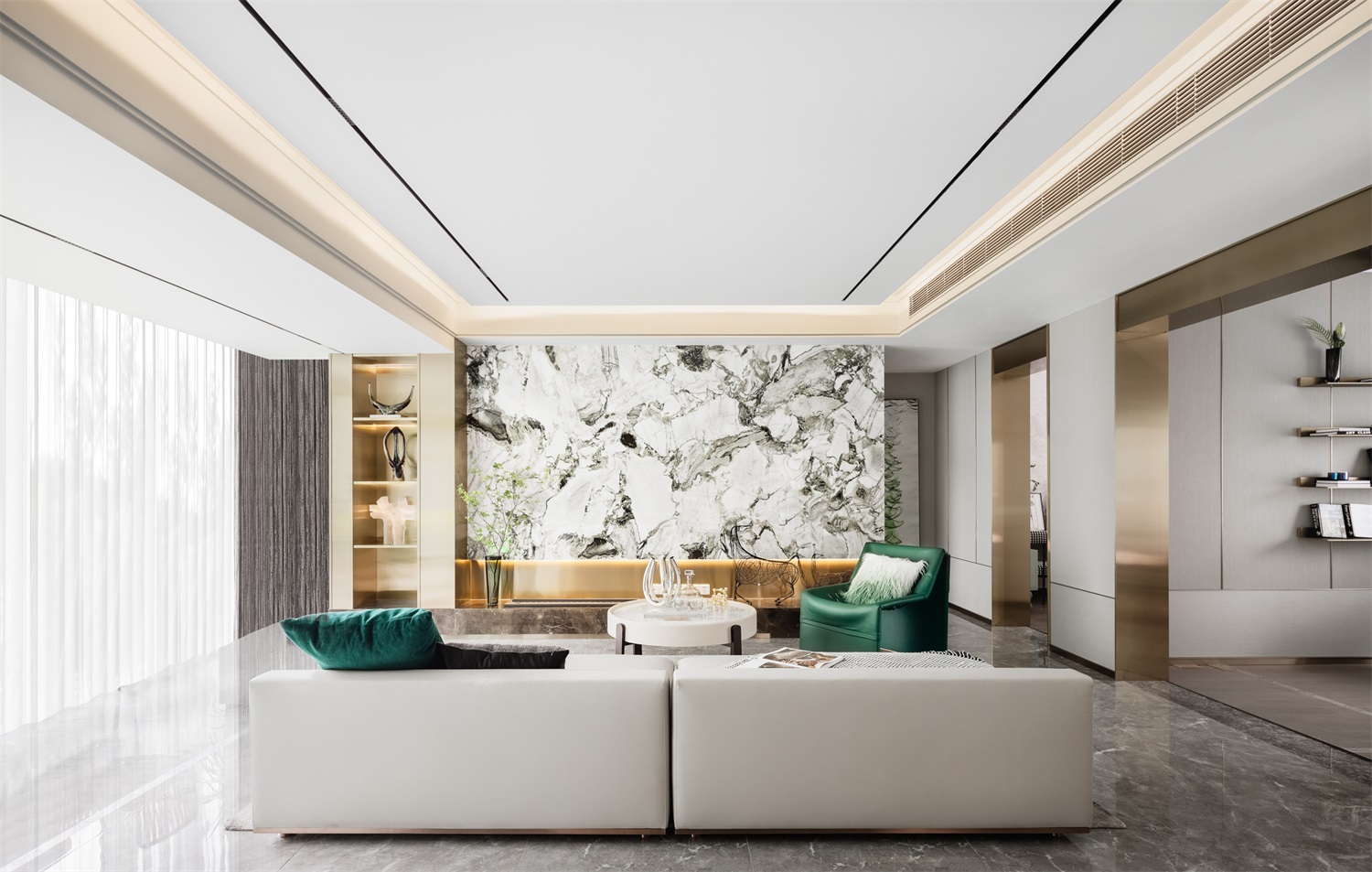 客厅布局方正,连通阳台区域,以简约内敛的语言,将纯、雅的独特东方美学融入其中。素雅的配色辅以极简的线条,在氛围灯光的衬托下,风格不同的材质,通过精妙的动线设计与巧思搭配,丰富了艺术形态在空间里的多层次变化。