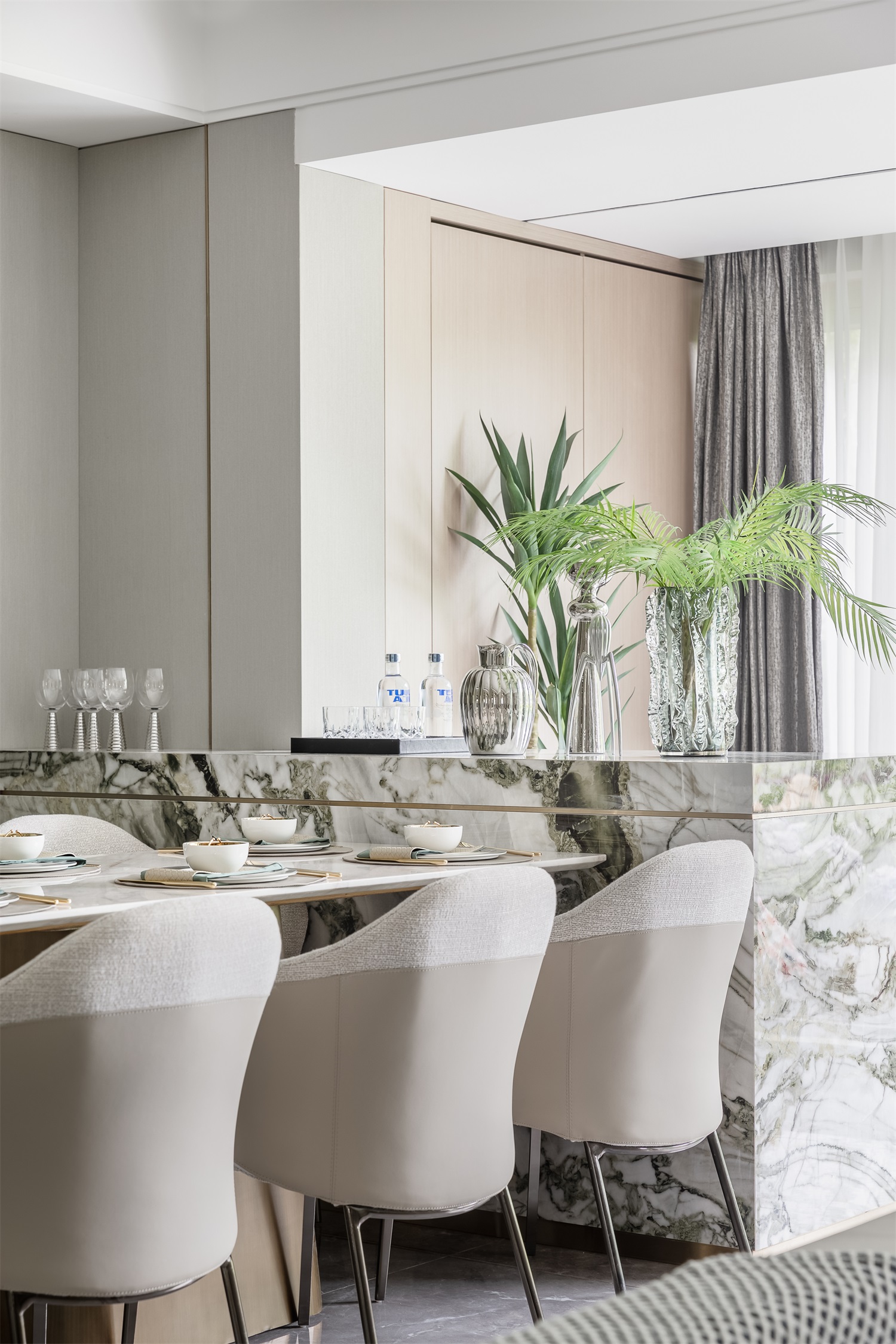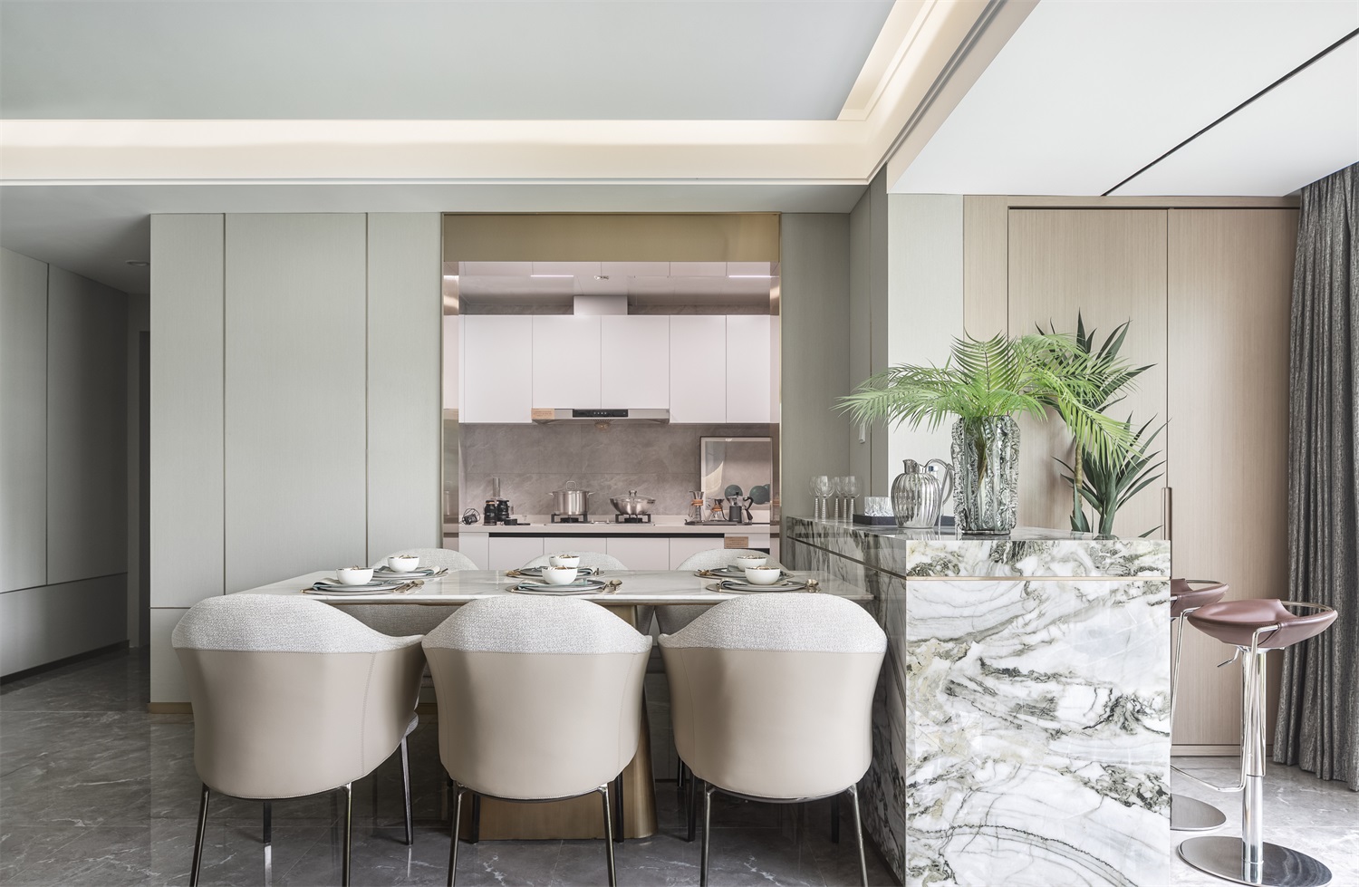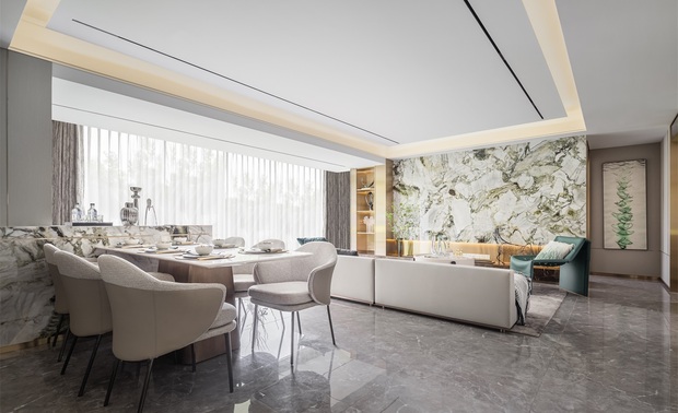客餐厅一体的设计,没有隔断的阻碍,宽敞通透,形成了更好的空间对话。自由舒展的动线连接了整个家庭成员的行为模式,宽敞通透呈现出功能整合、美学并叙的开放式格局。
