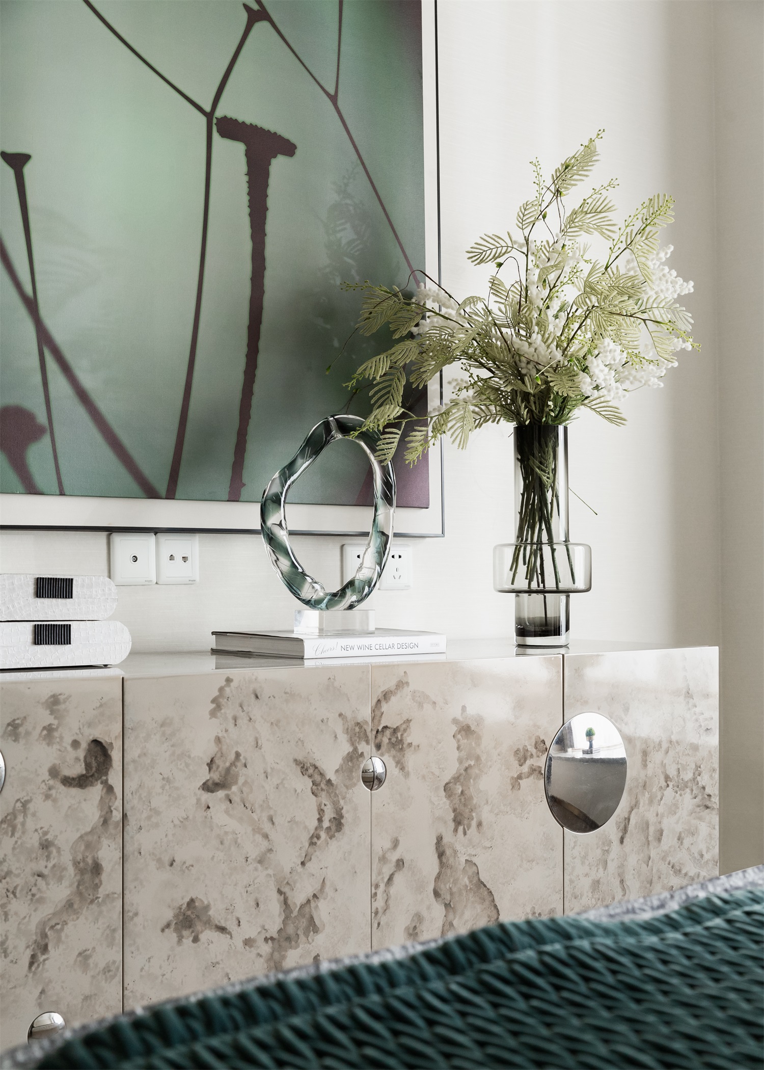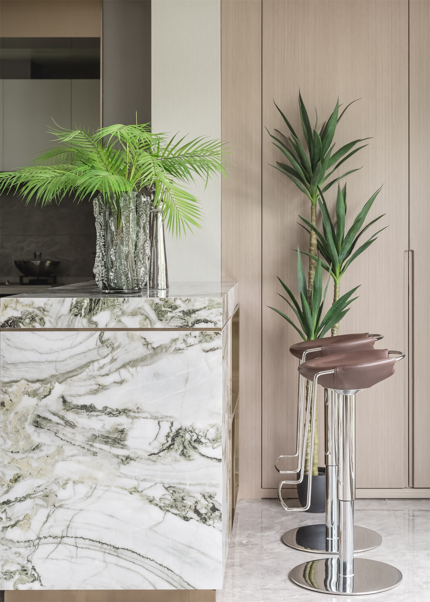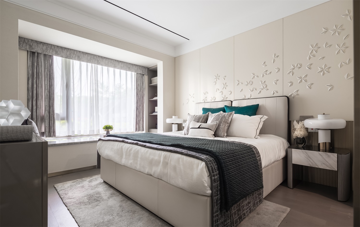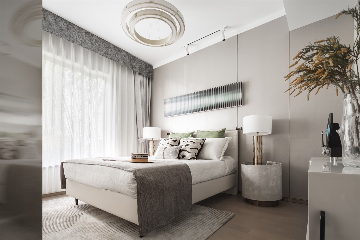 无论是艺术,还是设计,其最大的灵感皆是来自于生活。主卧以空间为画布,勾勒出充满张力的未来蓝图。整体设计采用酒店式布局,在精致皮雕背景的融入之下,一株绿植、几盏茶具、三两器皿,一切关于品味的态度均在平静、温润之中。