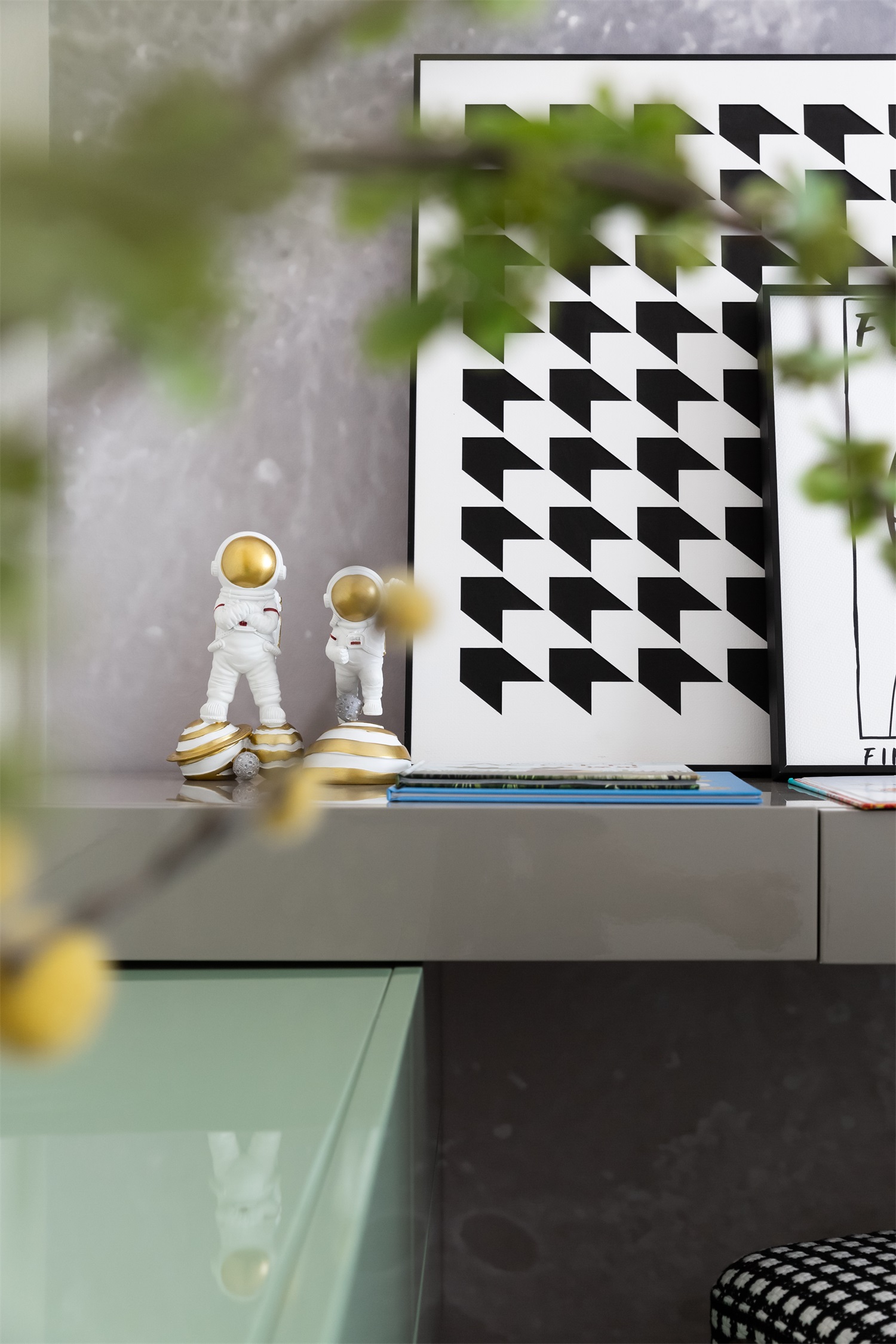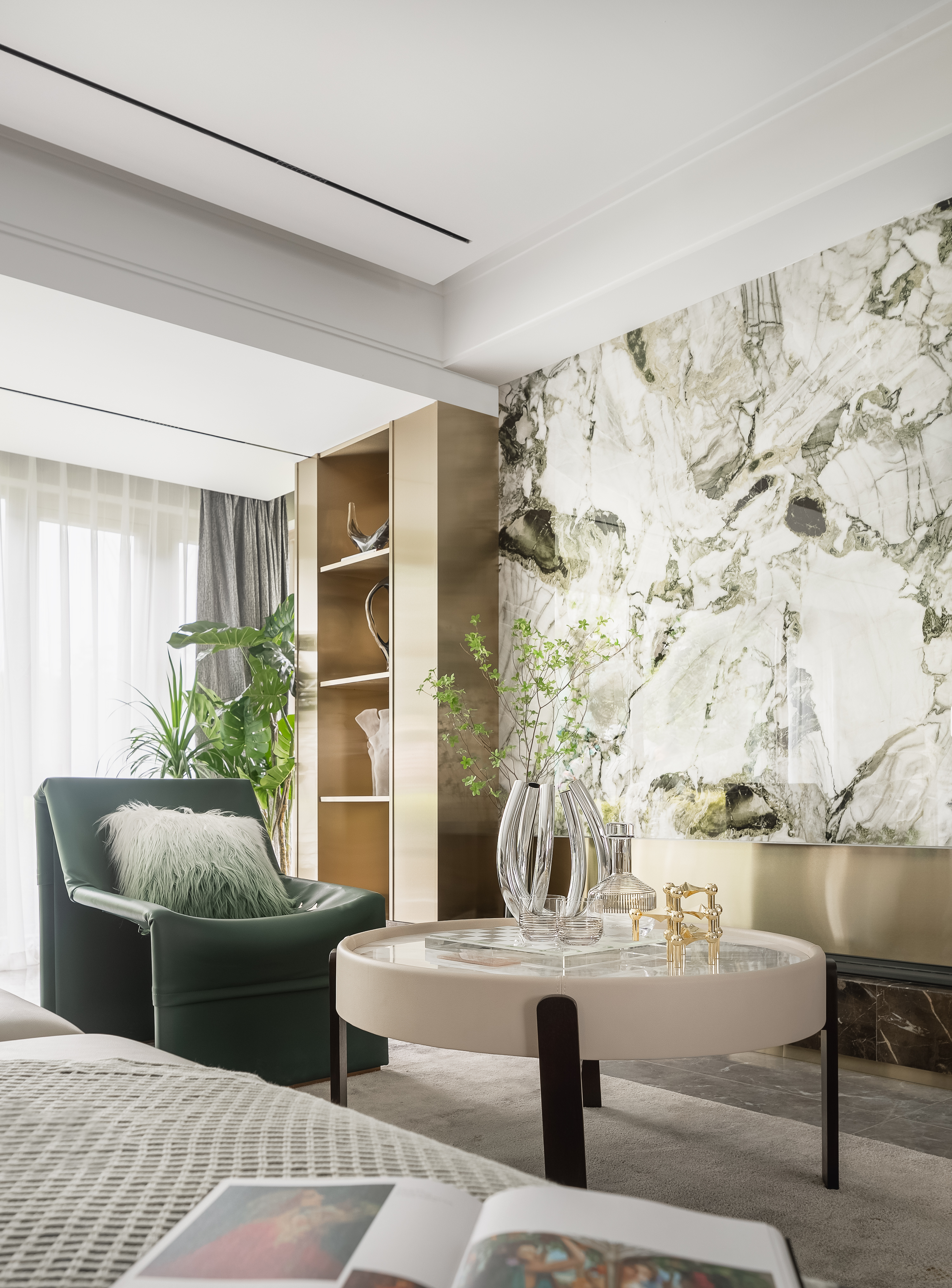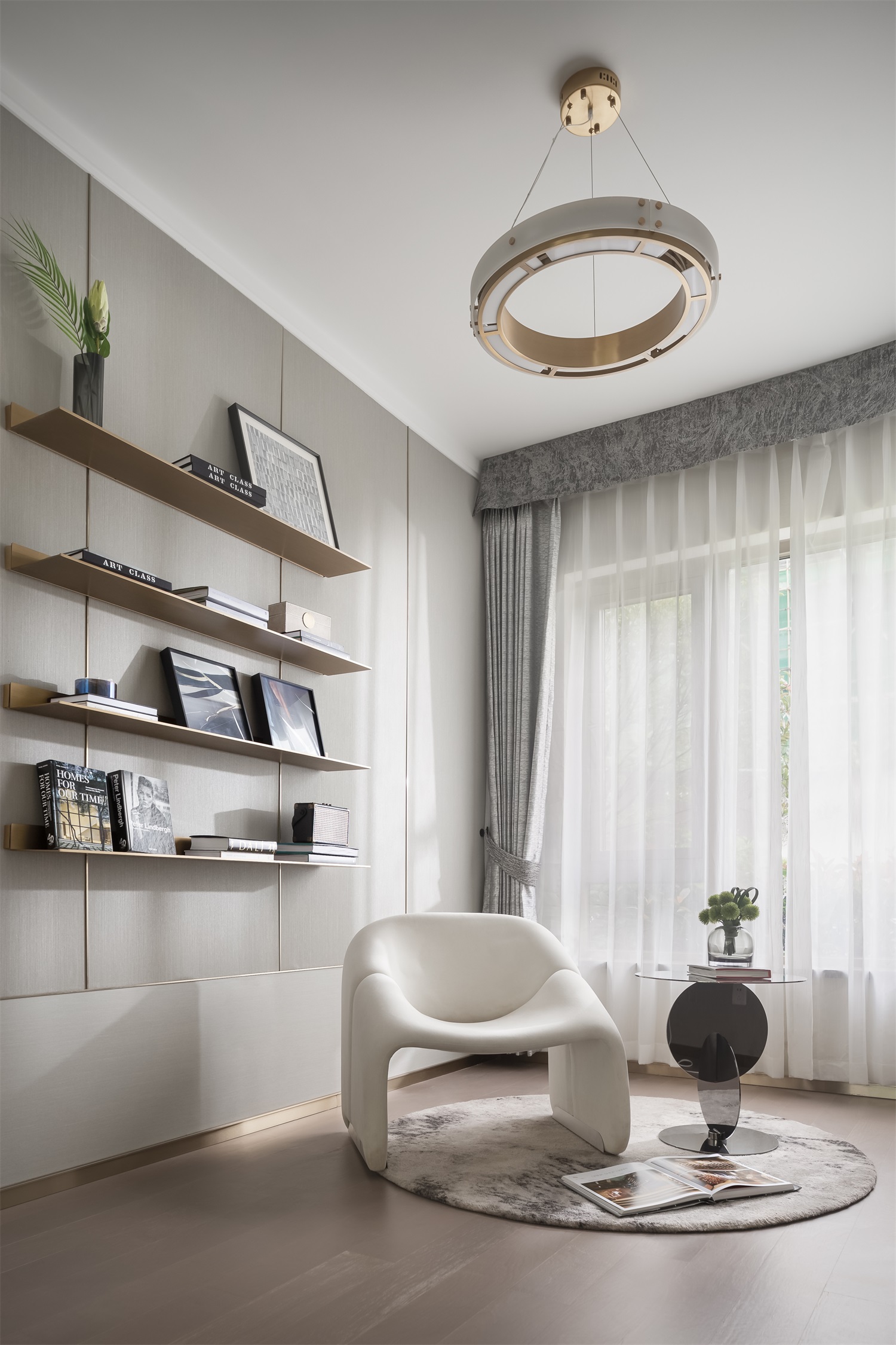 书房大幅窗面引入自然光线,室内外皆是风景。植物、光影、四季变化不受间隔,同步生长,与室内的材质、纹理、色彩、装饰精妙组合,自在有趣。