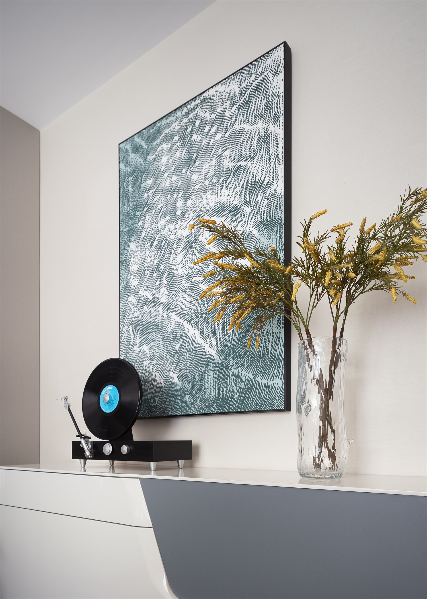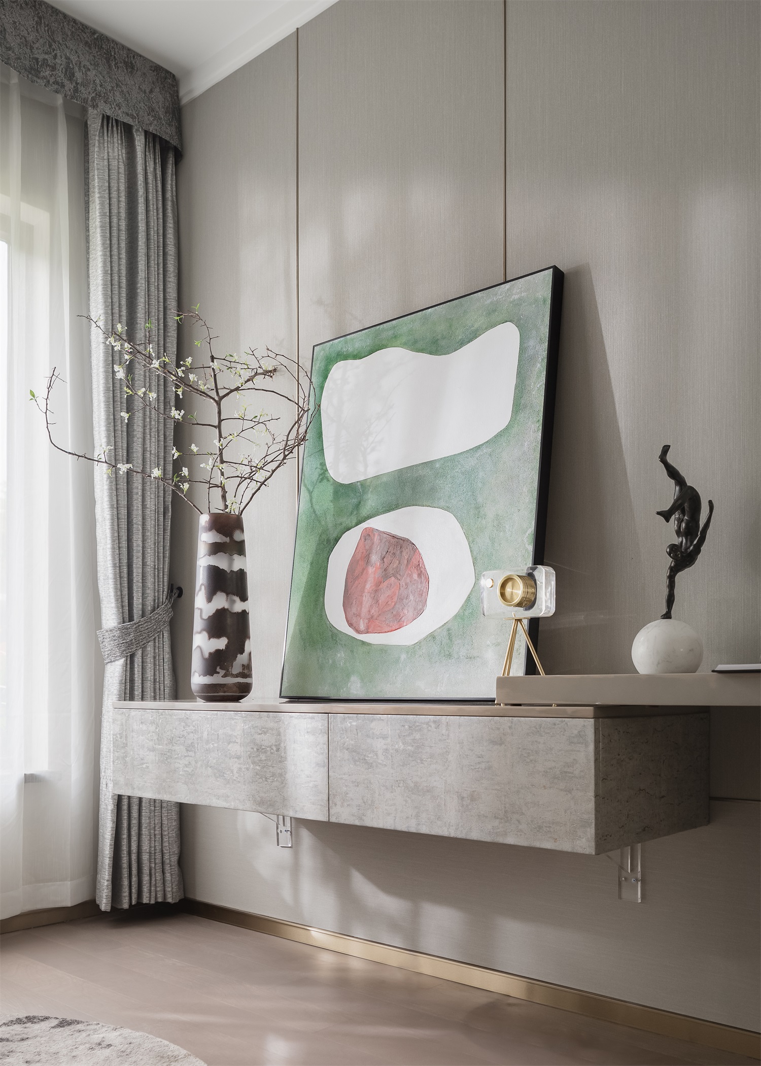 以写意的水墨色为主题的电视背景回应悠然生活,在一片淡雅的灰白基底空间里,散发出无尽的雅致气韵。