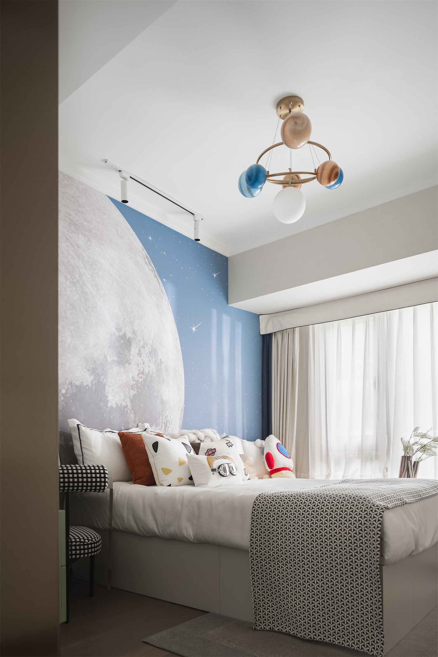 蓝色从儿童房的大量留白中跳脱而出,大胆张扬。整个设计以宇宙探秘为主题,兼具美学与功能的场景感打造,为孩子创造梦想的天堂。