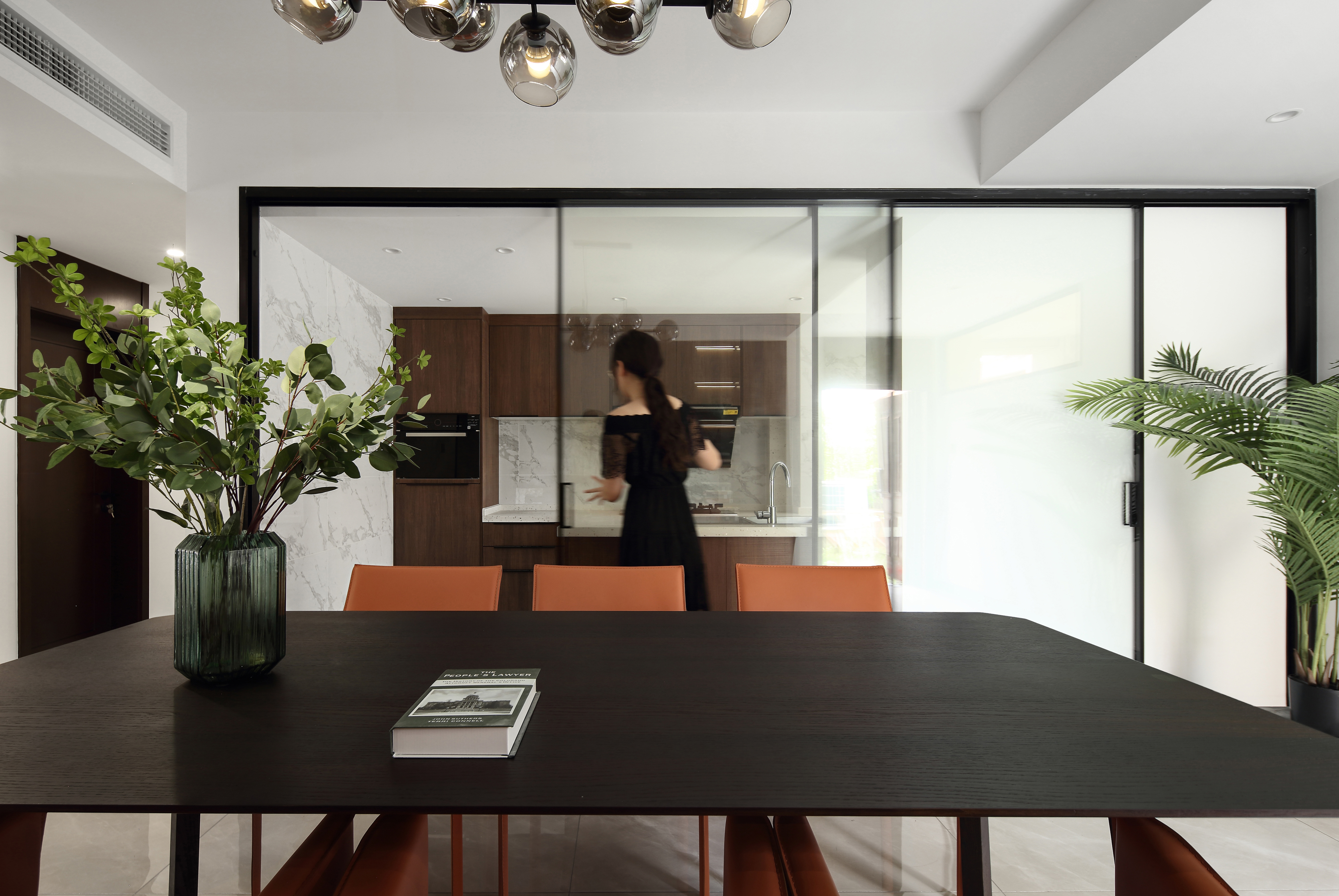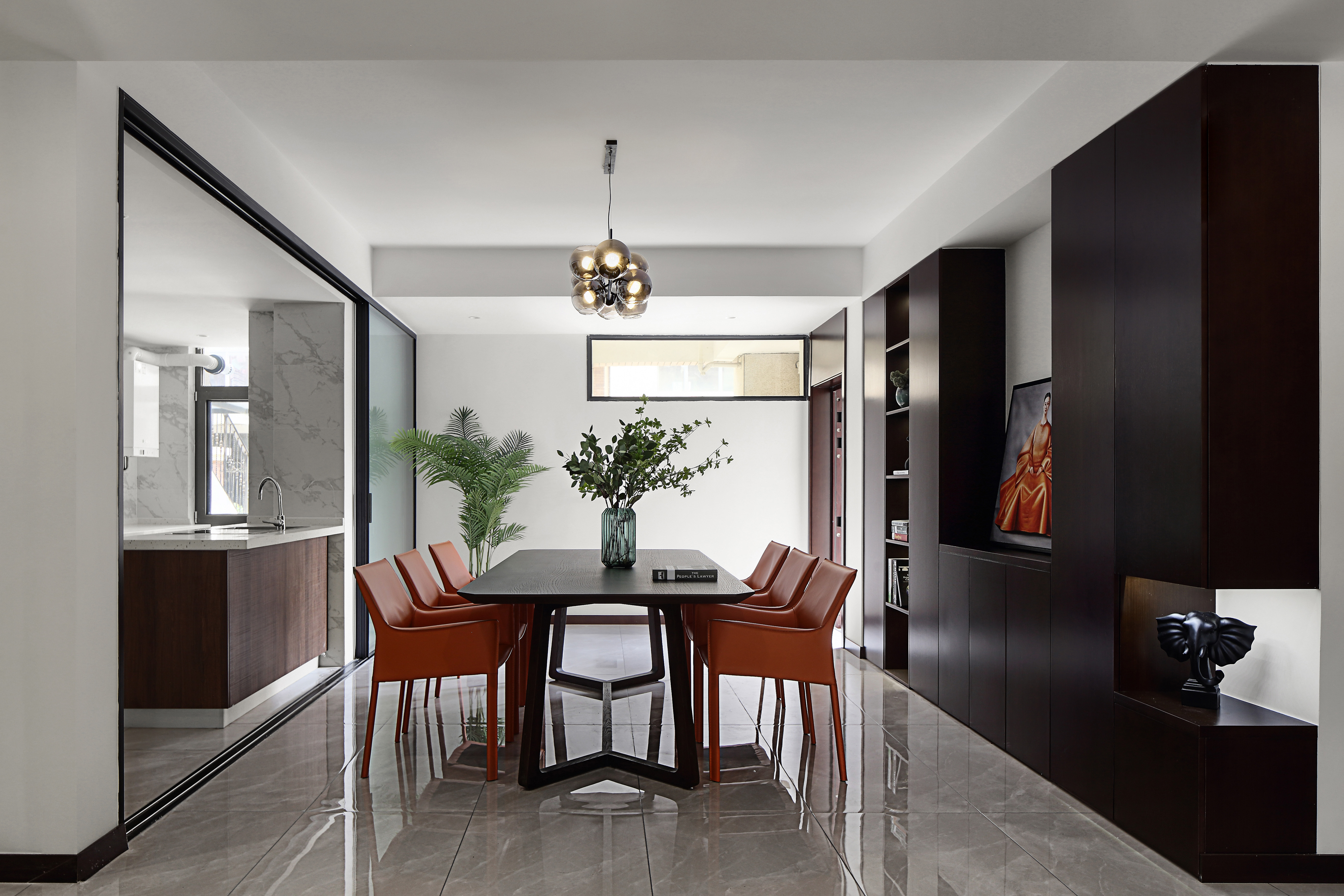 设计选材:餐厅北面相对较暗,为了给业主创造一个良好的就餐环境,便做了开窗设计,借助室外光线点亮就餐区,玻璃材质的运用让空间更加明亮,墙面少许的材料堆积更加凸显沙发造型的重要性,利用储物柜作为装饰,让整个空间更为干练