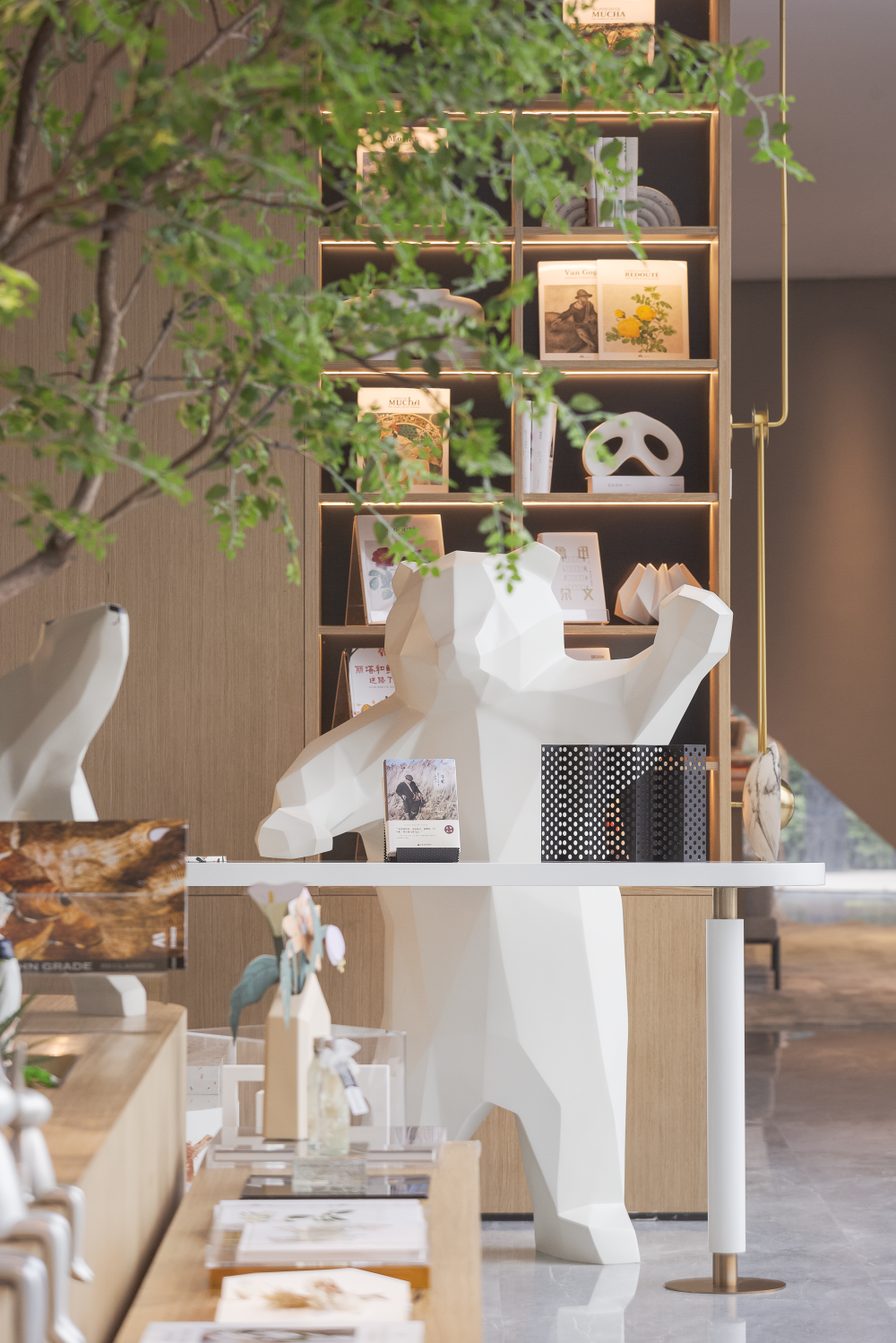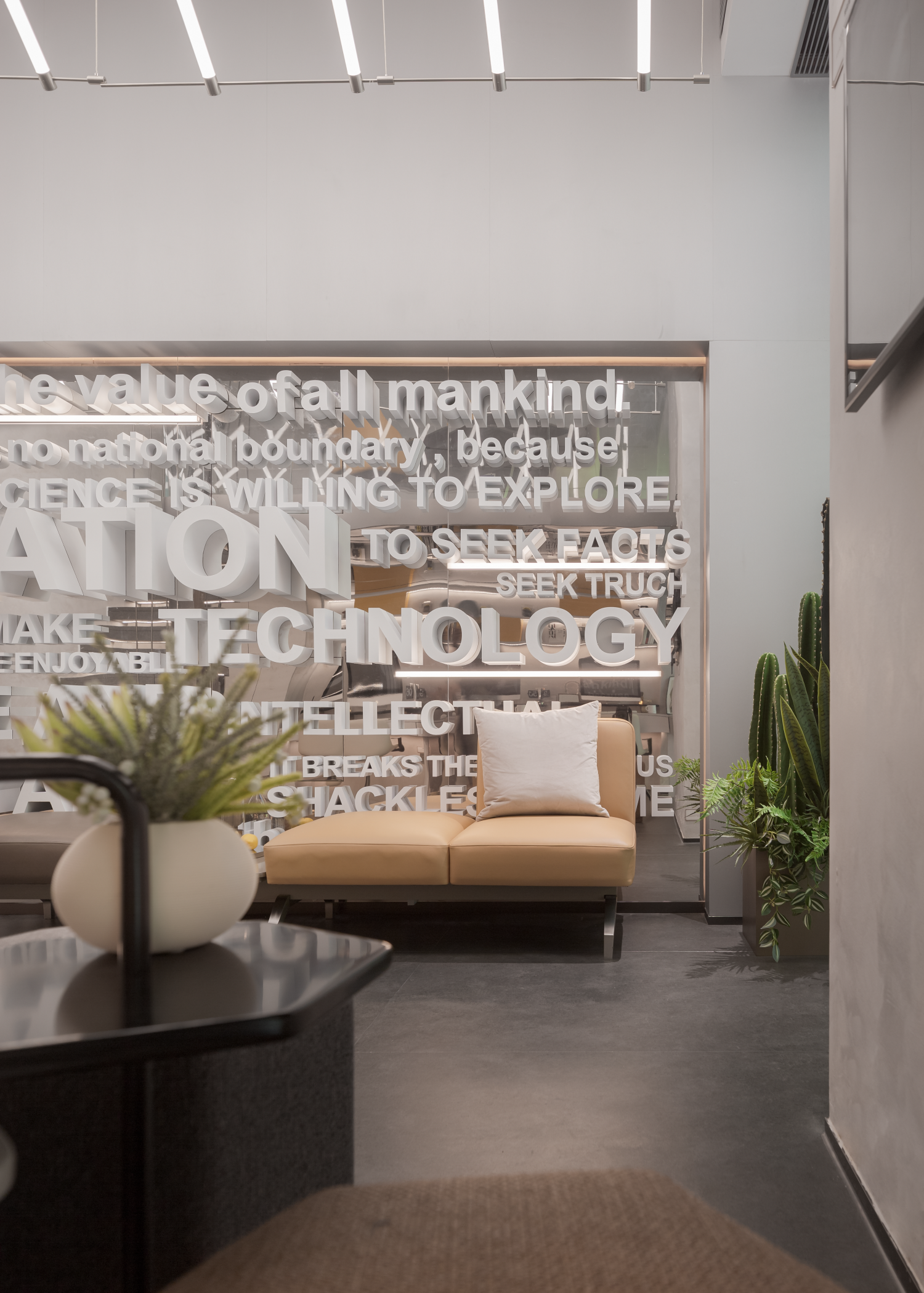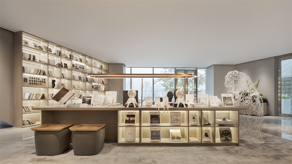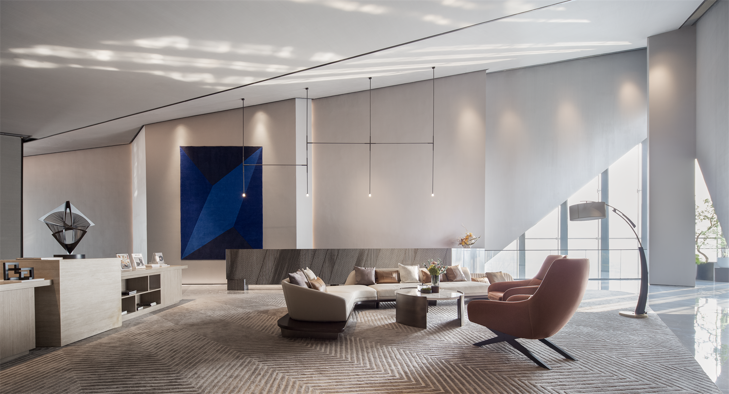 整个空间定性为城市展厅,巨大玻璃幕墙将室外景色纳入室内,在明亮的光线下,大型艺术品雕塑与蓬勃向上的植物相映成趣,诉说着空间的张力与生机,呼应万科致力于和谐生态城市建设的理念。
