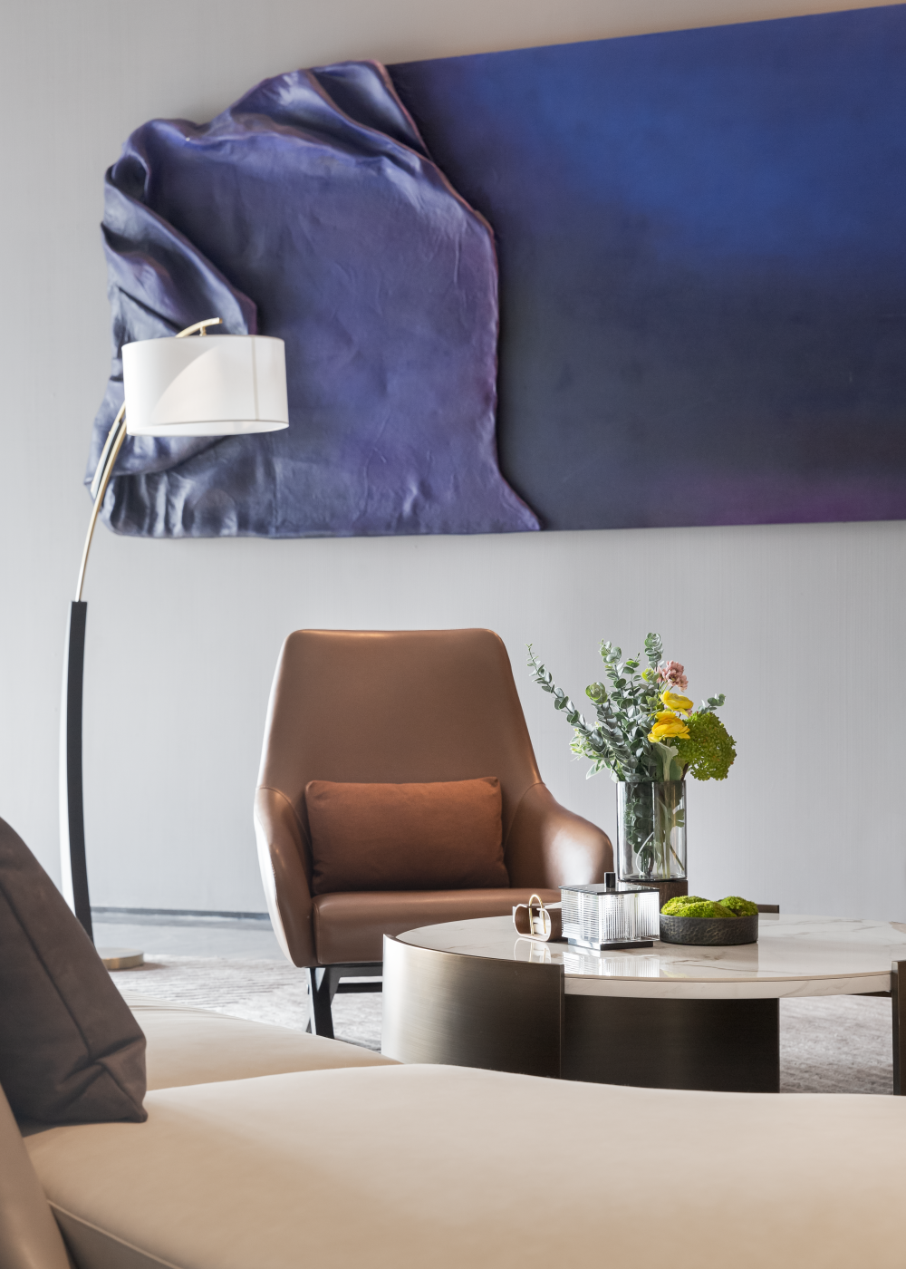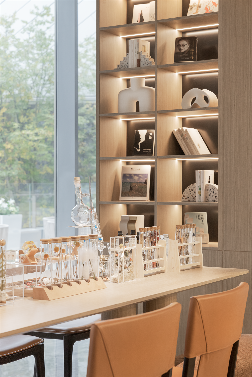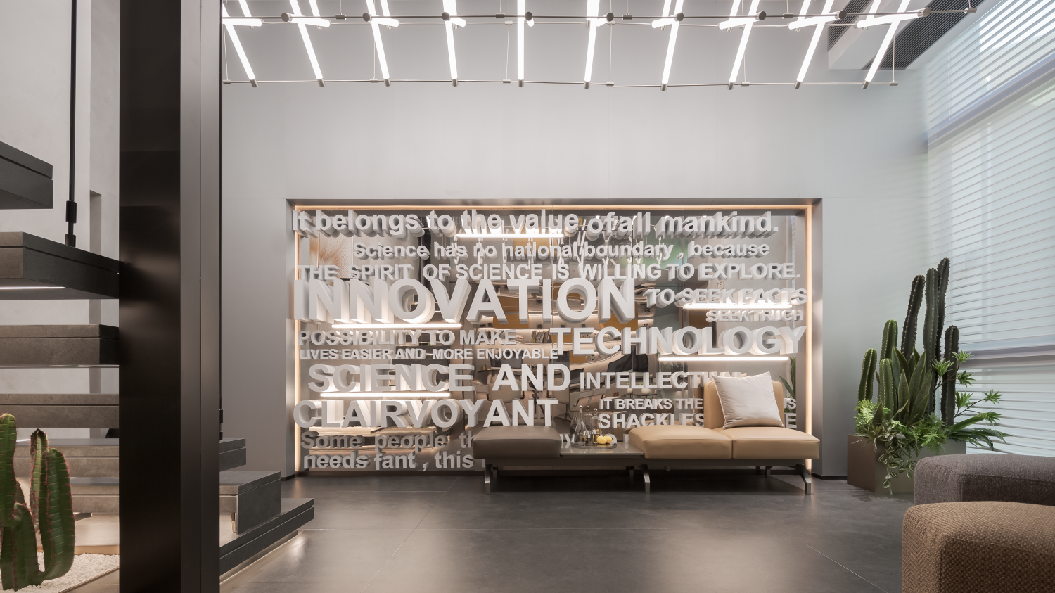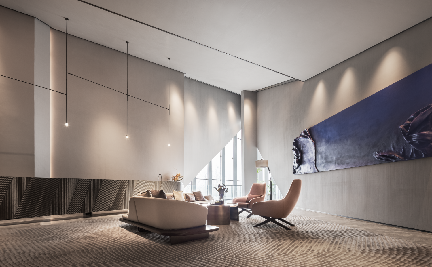 整个空间定性为城市展厅,巨大玻璃幕墙将室外景色纳入室内,在明亮的光线下,大型艺术品雕塑与蓬勃向上的植物相映成趣,诉说着空间的张力与生机,呼应万科致力于和谐生态城市建设的理念。