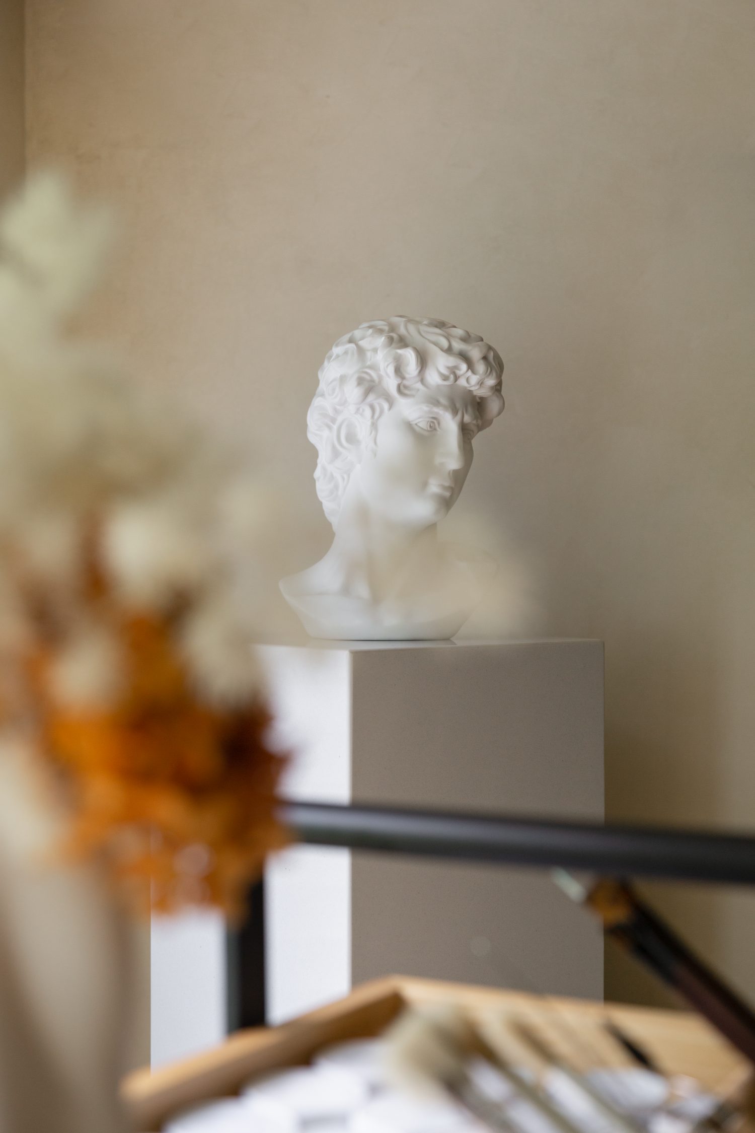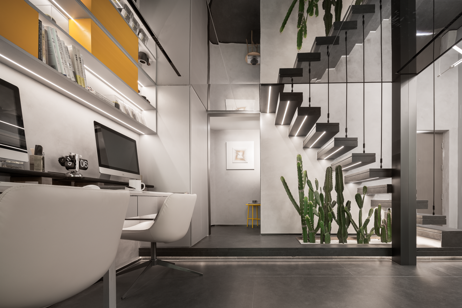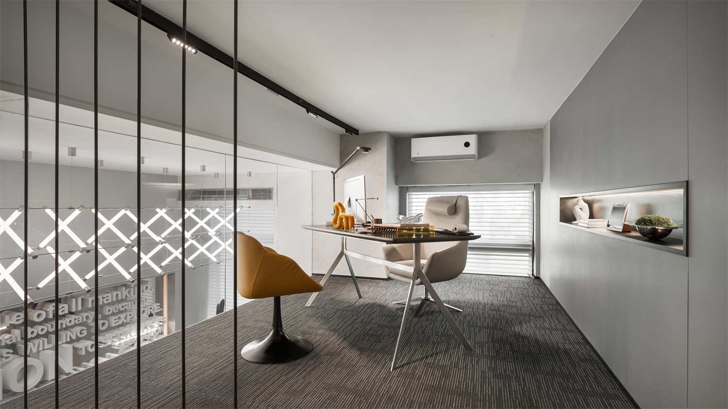 总裁办公室整体以灰色营造出简约沉稳的氛围,空间内的艺术摆件有着明显的体块感,为整个区域锦上添花。