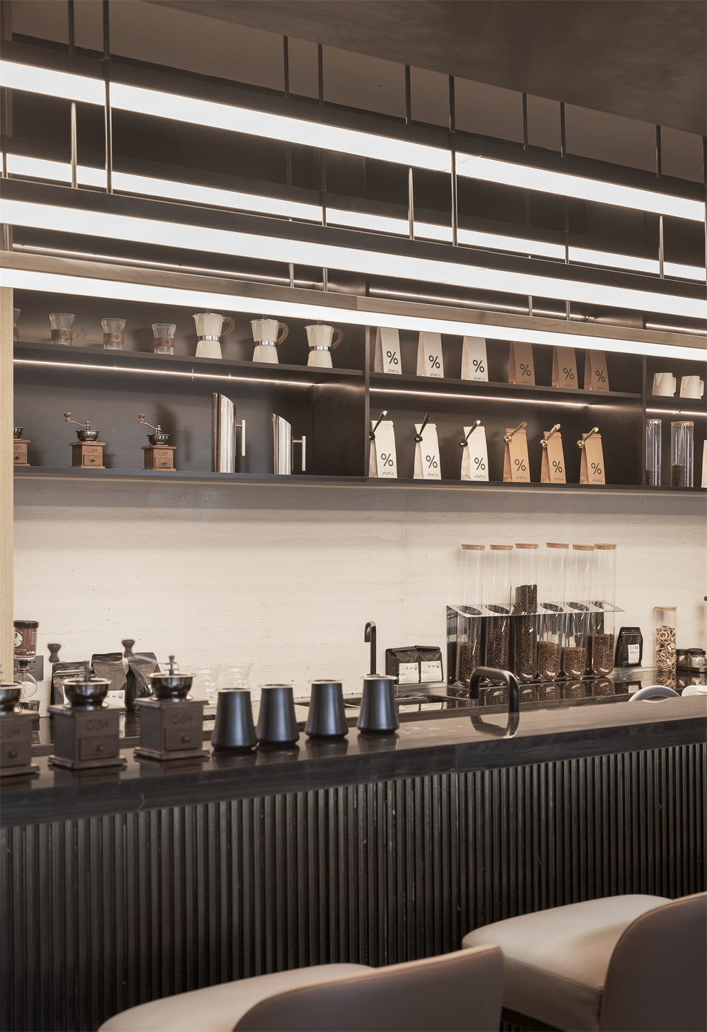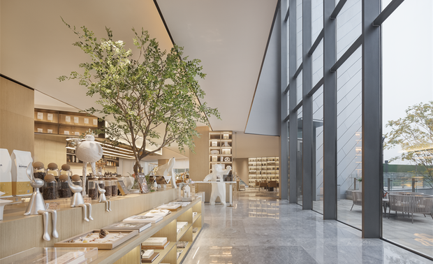 设计将商业街景融入于空间中,丰富的集市生活在空间中有节奏的一一发生,造就蕴含了当代美学的艺术廊。咖啡吧在整体空间布局中是一个过渡空间,以社交场景让空间转向都市化,散发出时尚气息。