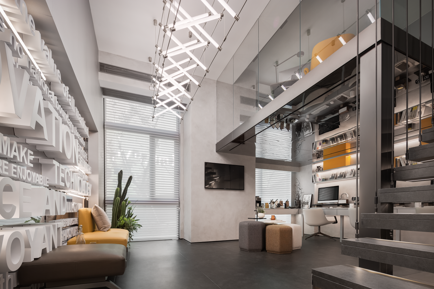 打破传统的空间界限,开放办公区方便互相交流,鲜活的社交气息,使空间氛围变得亲近而有趣。尽头处意大利艺术家Biasi的作品《门》以虚拟运动学的概念呼应Robot的主题。
