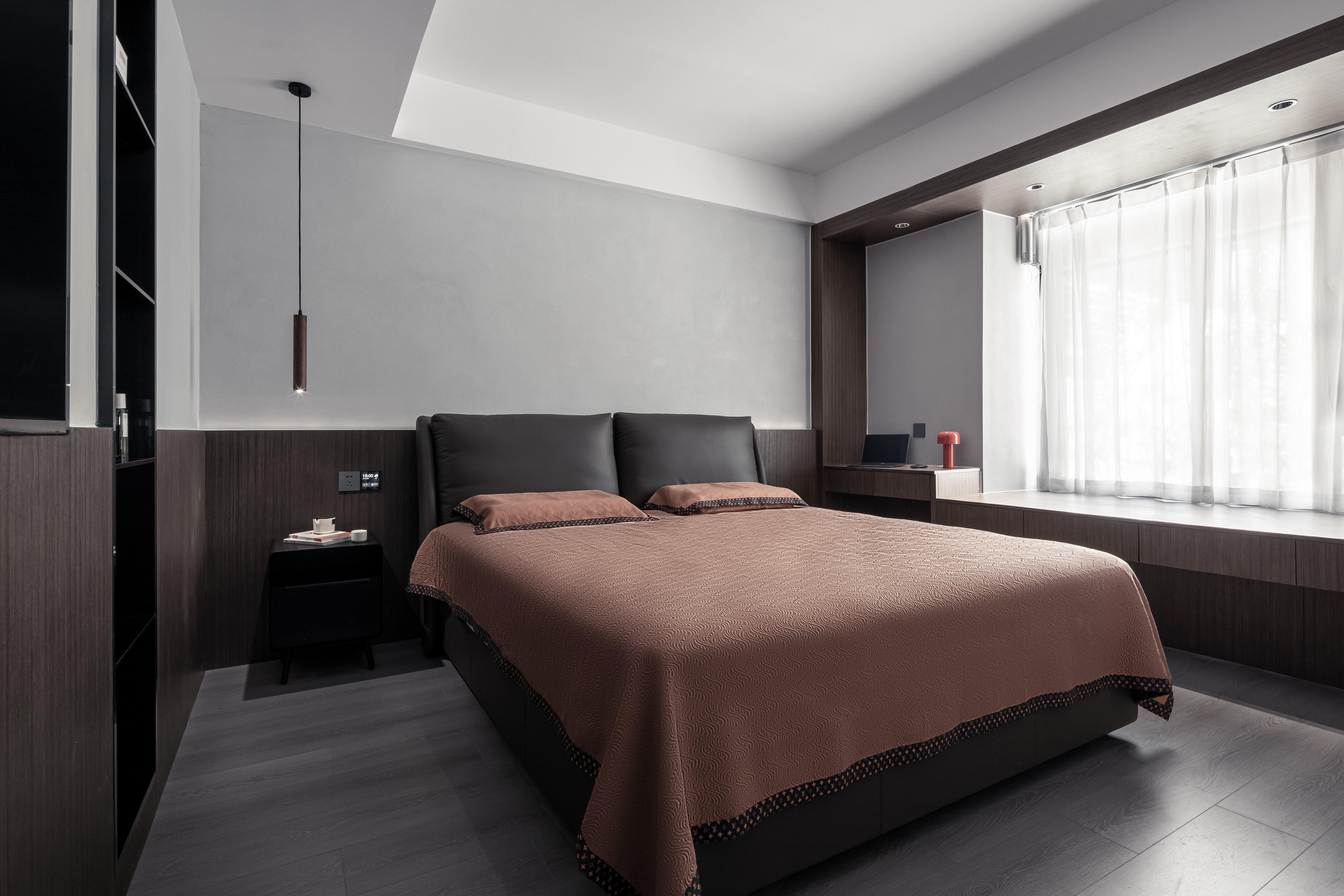 设计选材:所有卧室均使用了艺术肌理涂料,同时柜体选用了原木皮加二次木柜体环保低碳。