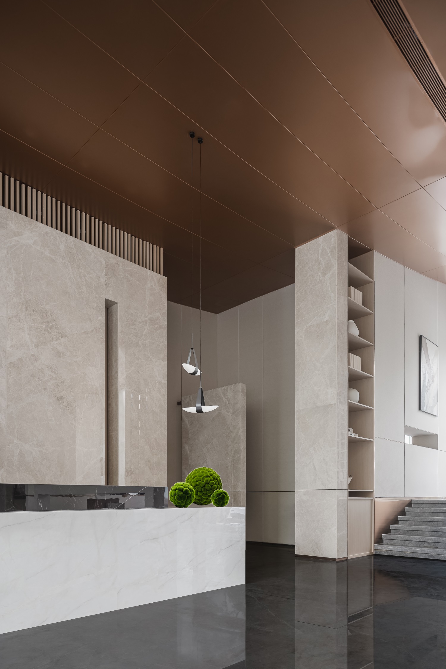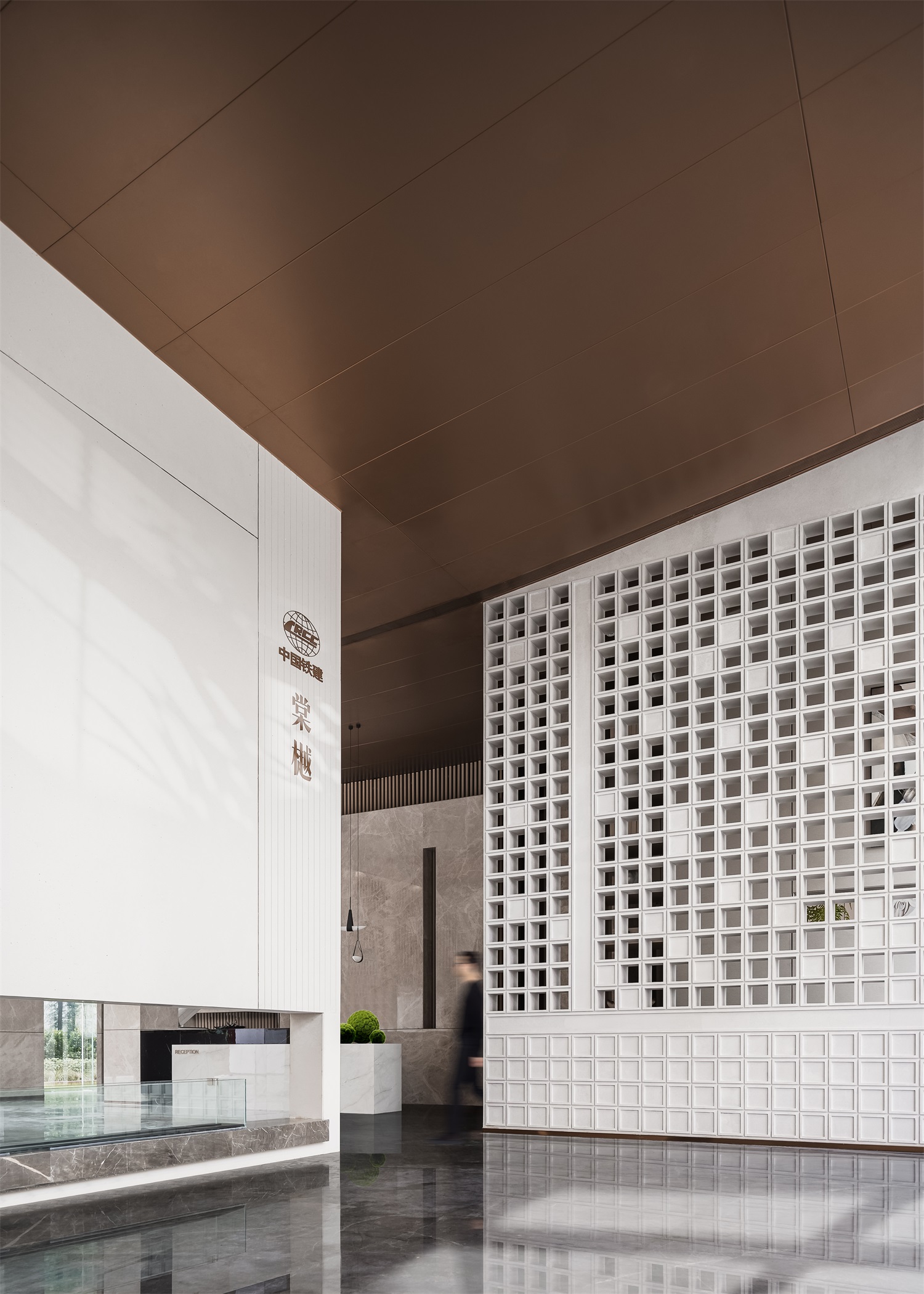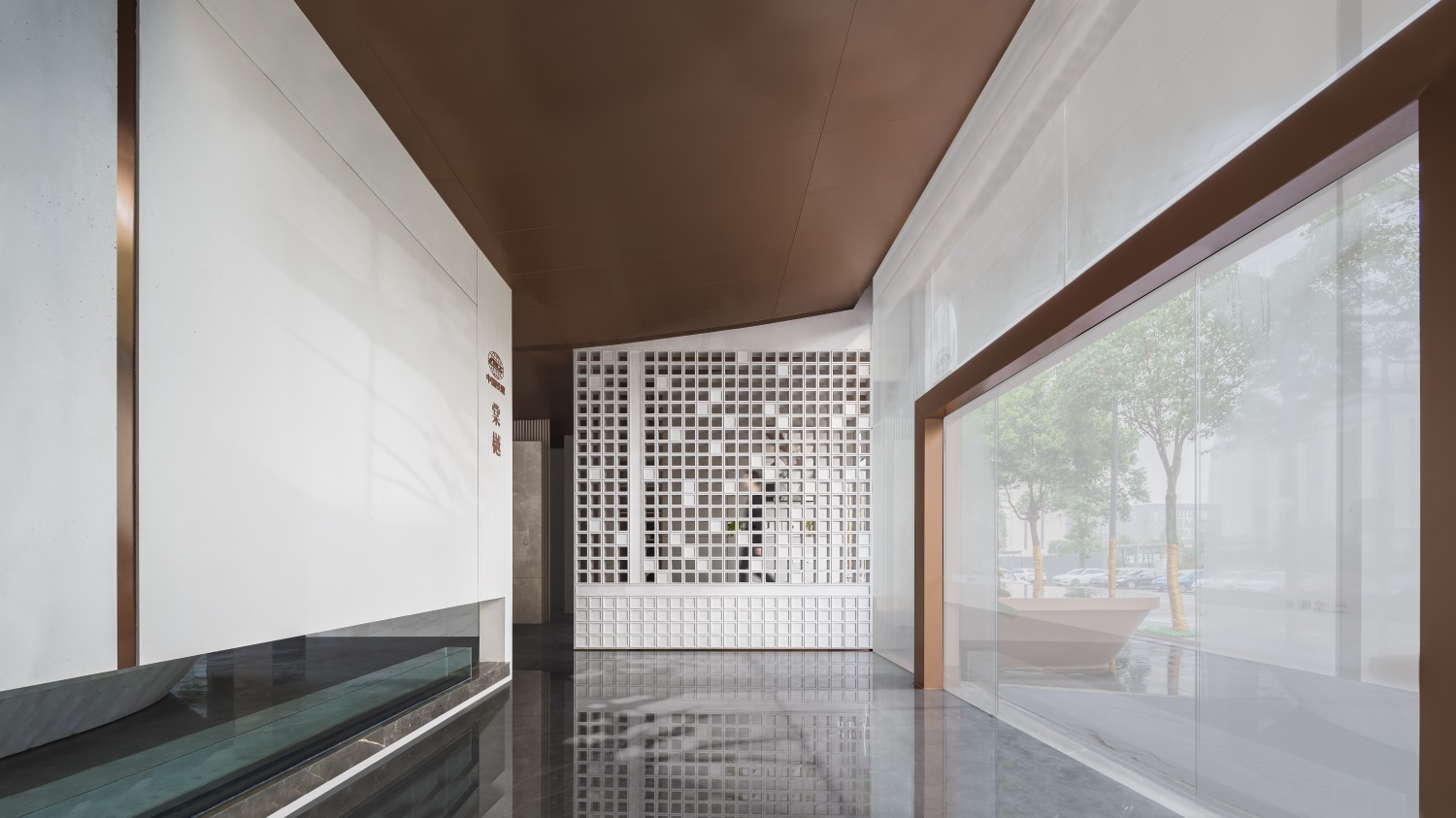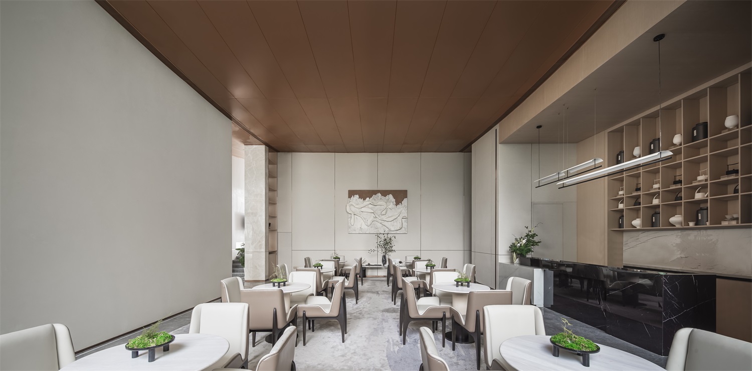 前厅区域是空间气韵的起点,设计将现代中式的建筑立面风格衍生进室内,形成典雅的场域精神。艺术隔断错落有序,让空间借景话室,漏而可望。