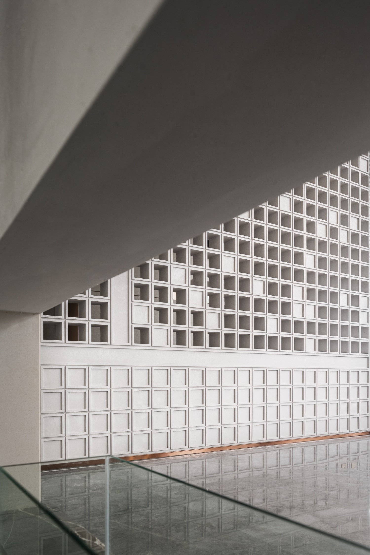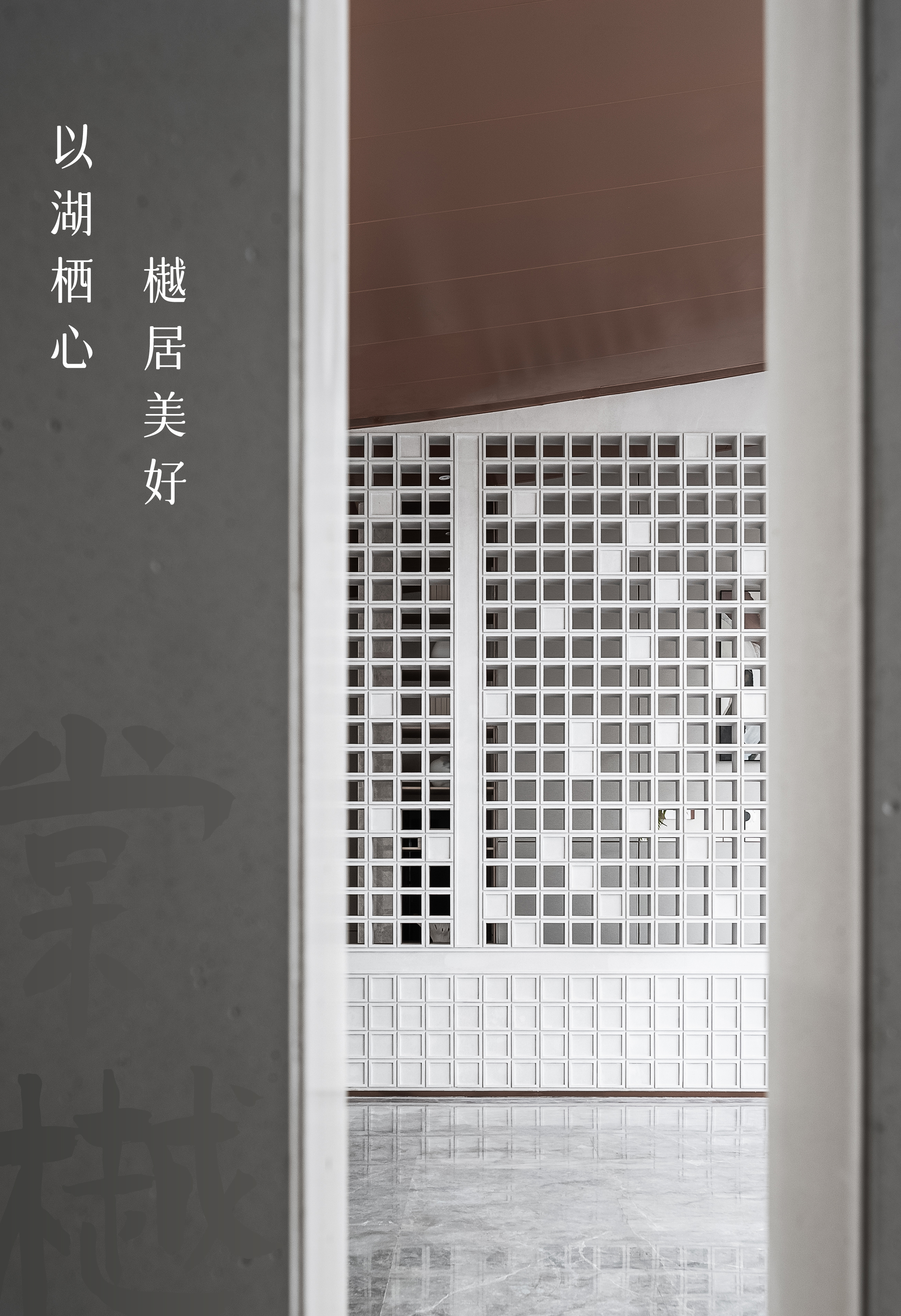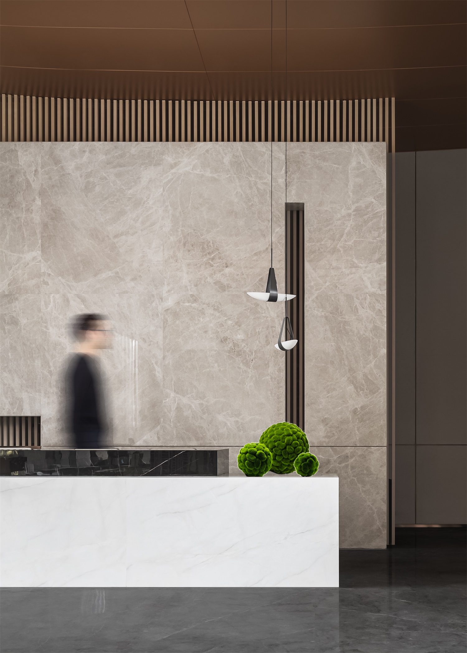 前厅区域是空间气韵的起点,设计将现代中式的建筑立面风格衍生进室内,形成典雅的场域精神。艺术隔断错落有序,让空间借景话室,漏而可望。