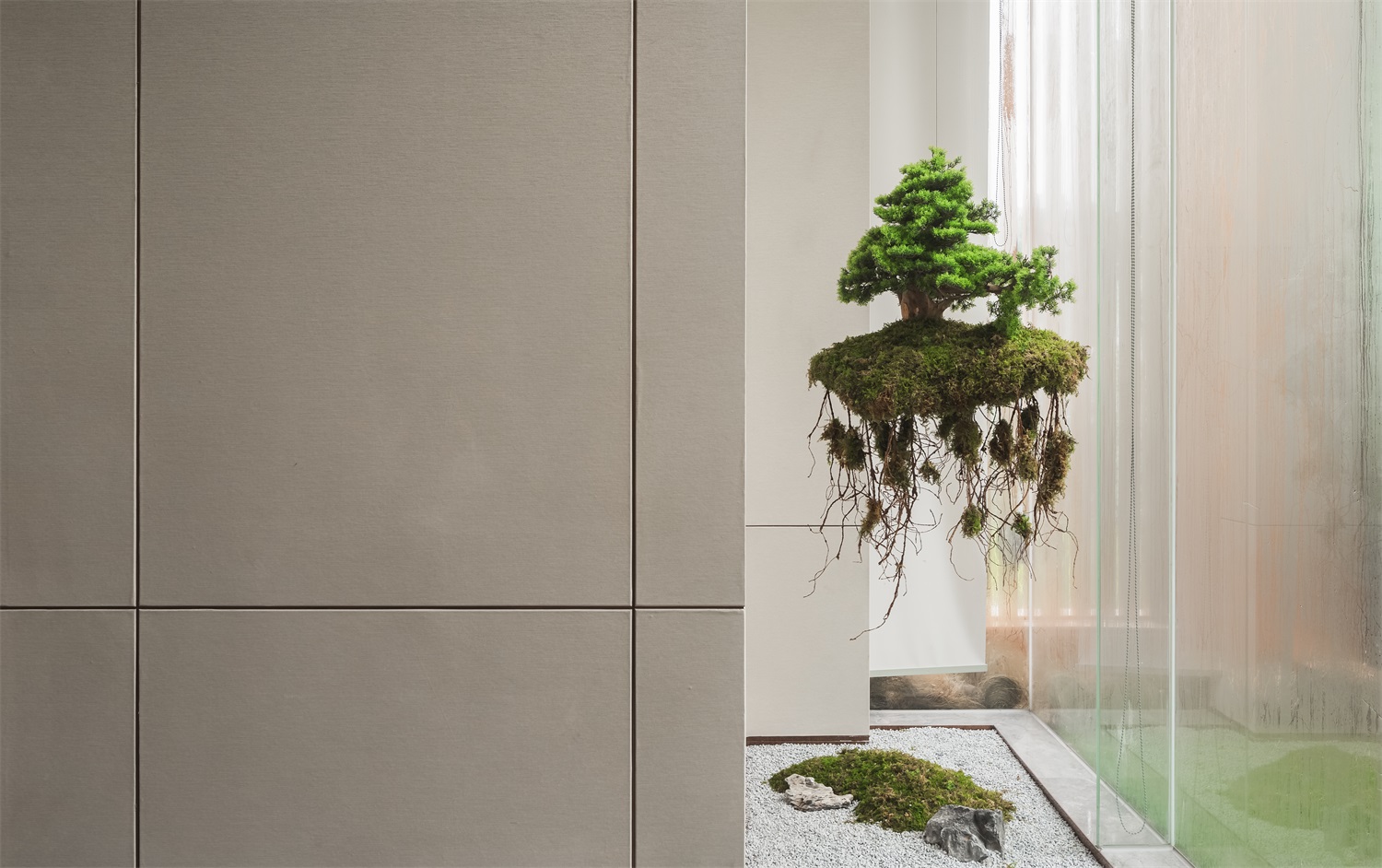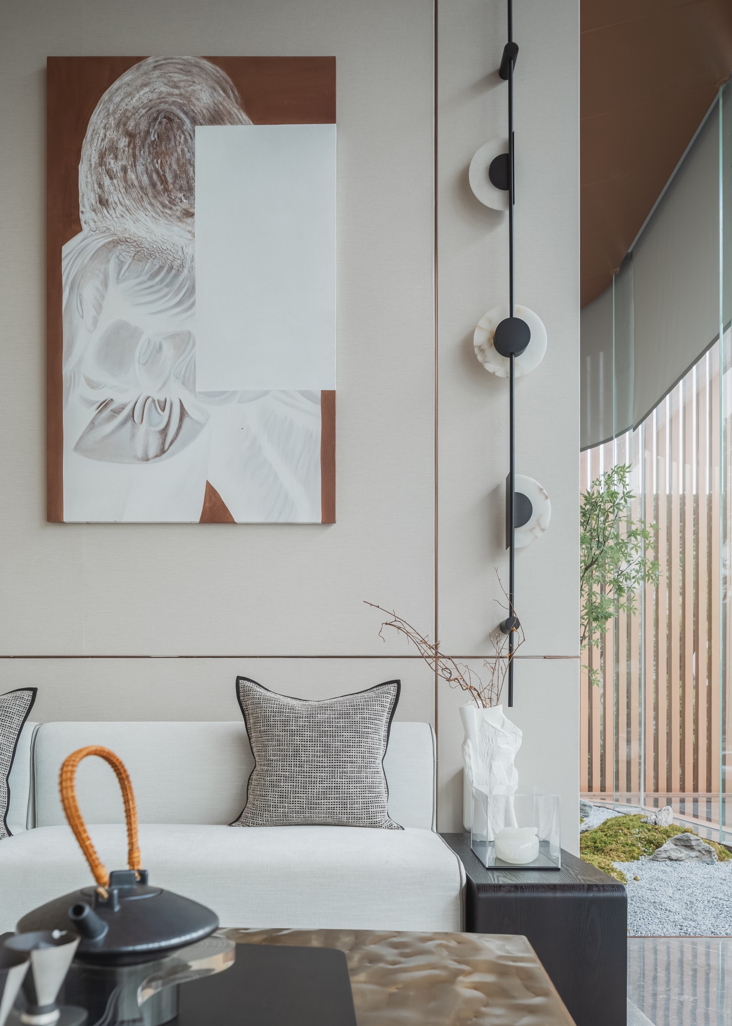 以空间为始,至自然而终。洽谈区在场域中形成秩序张力,一系列大地色软装元素恰如其分,增加了空间的层次感,使得这方空间瞬间有了更深层次的底蕴。落地玻璃消融了室内外边界,让光影、体量形成有序的流动感,在空间与自然原始糅合下,实现了对自然湖居生活的有效回应。