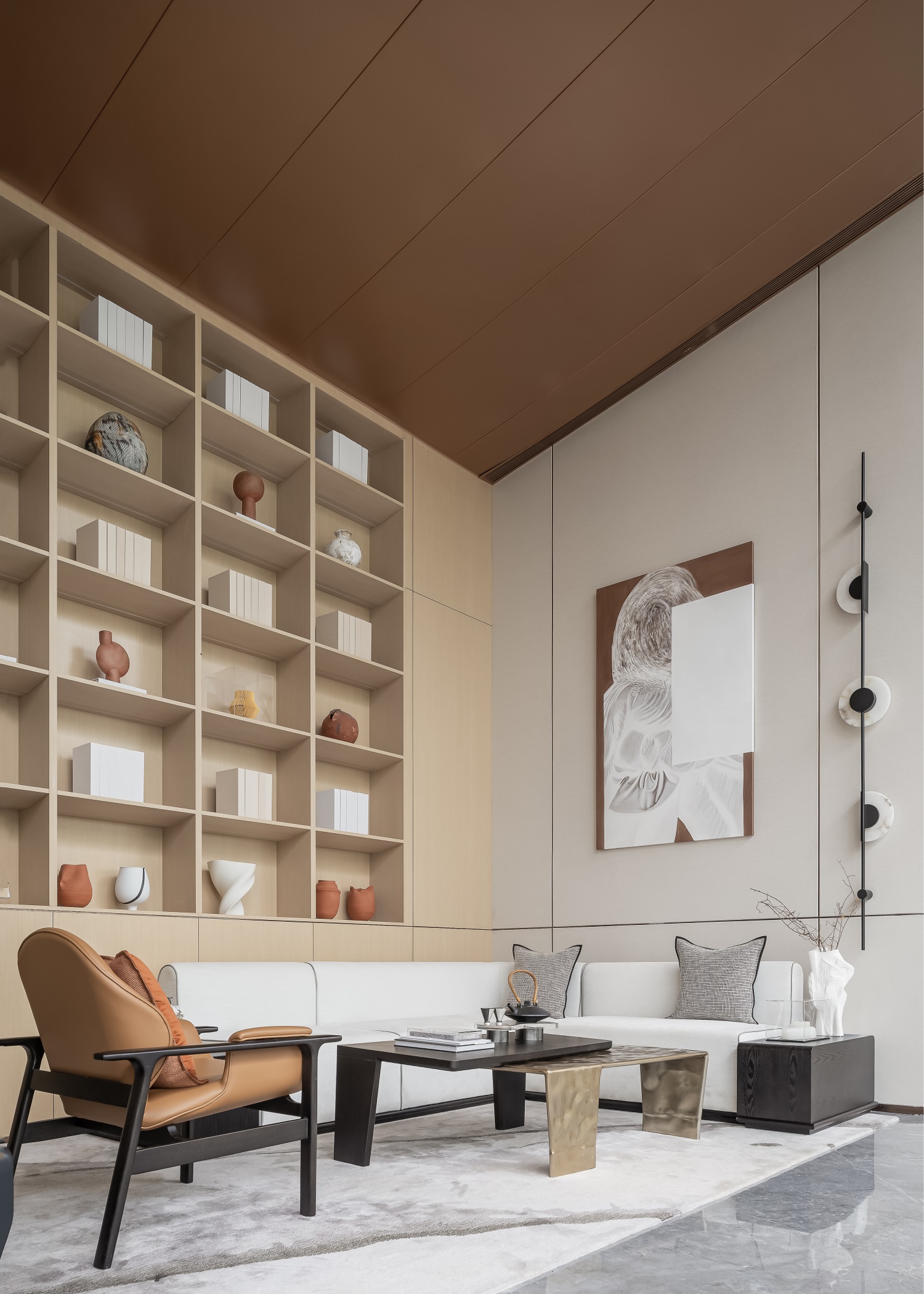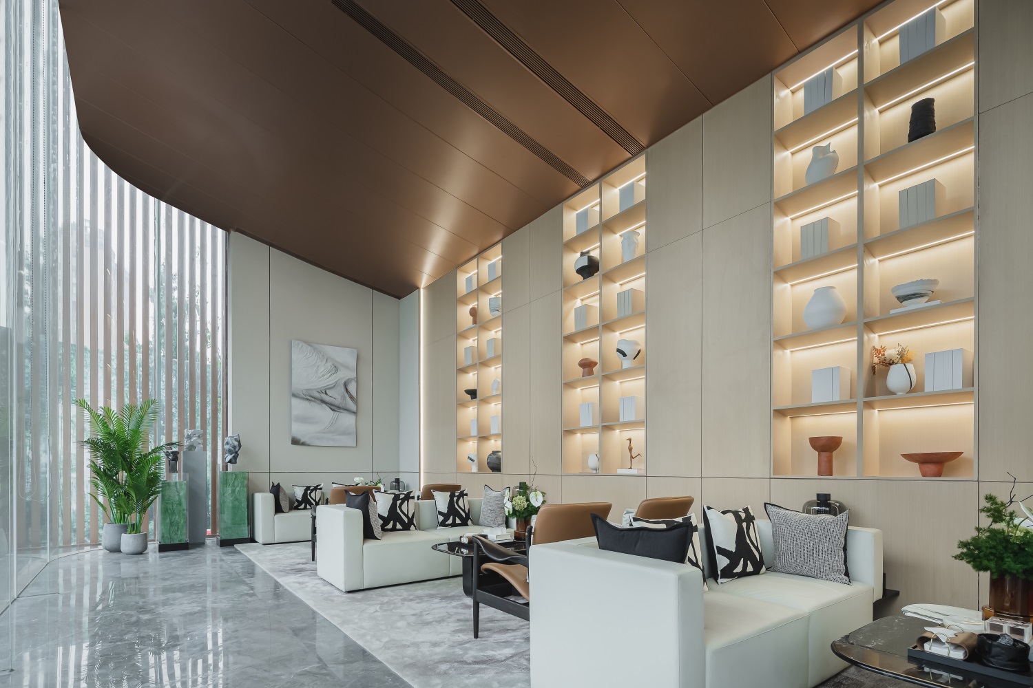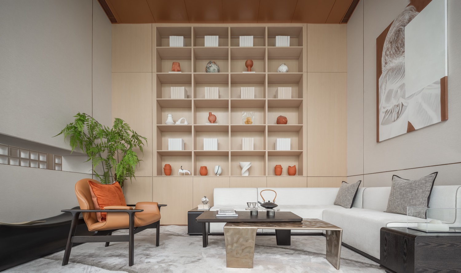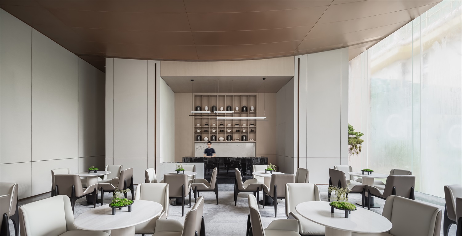 VIP区中温暖色调的器物既是宣示空间的物质,也在昭示空间的精神,予人以归家般温柔又沉稳的力量。体块穿插间,线性元素创造出视觉的延伸,让人们感受到时光的纵深与醇厚。