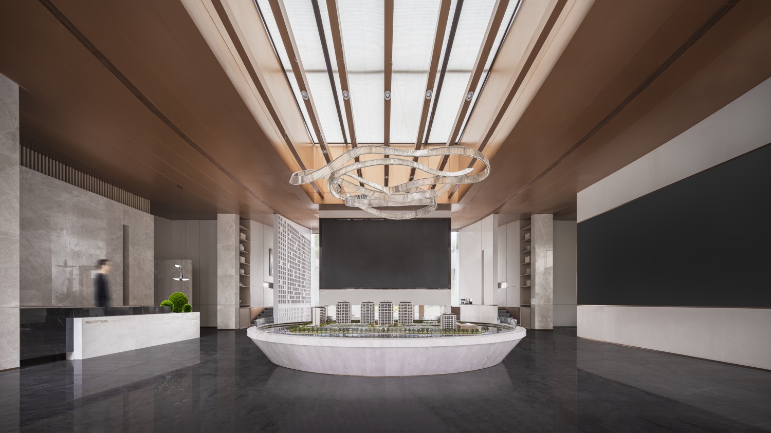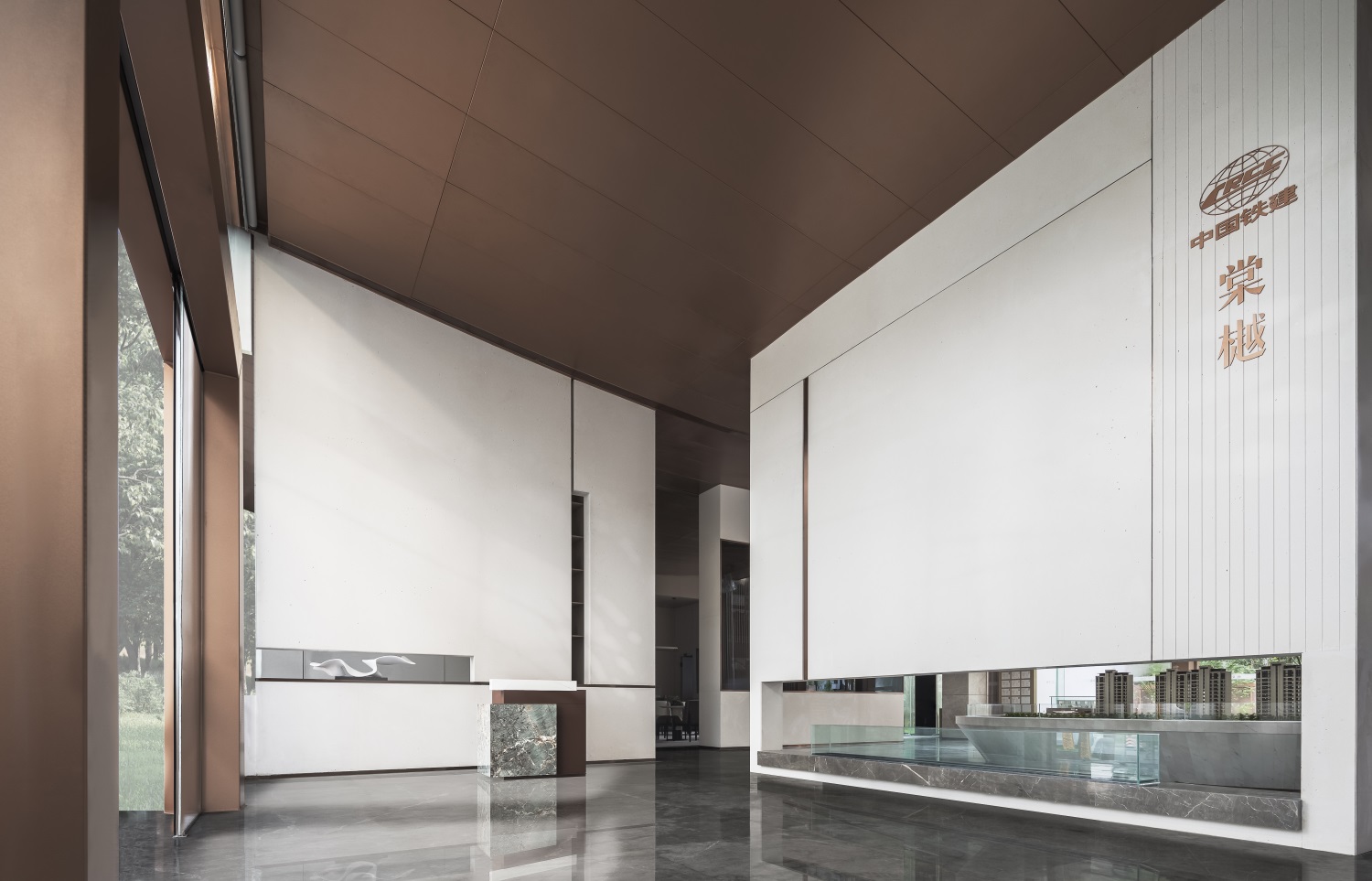 沙盘区空间整体既沉淀出蜀地的文化与历史,又汇集了摩登的思潮。空间以现代材料为主导,顶棚材质运用西派金铜,体现项目定序精品的气魄。